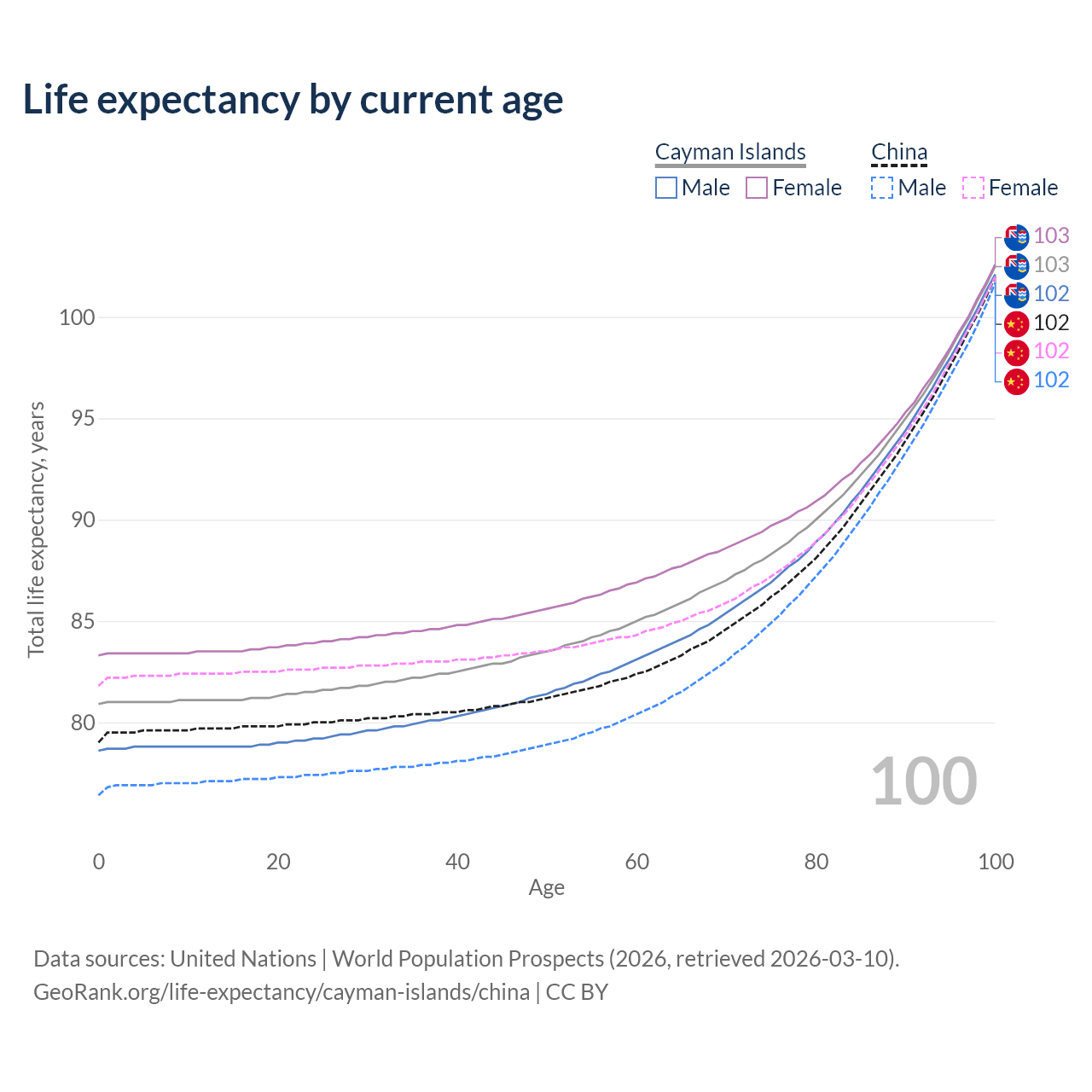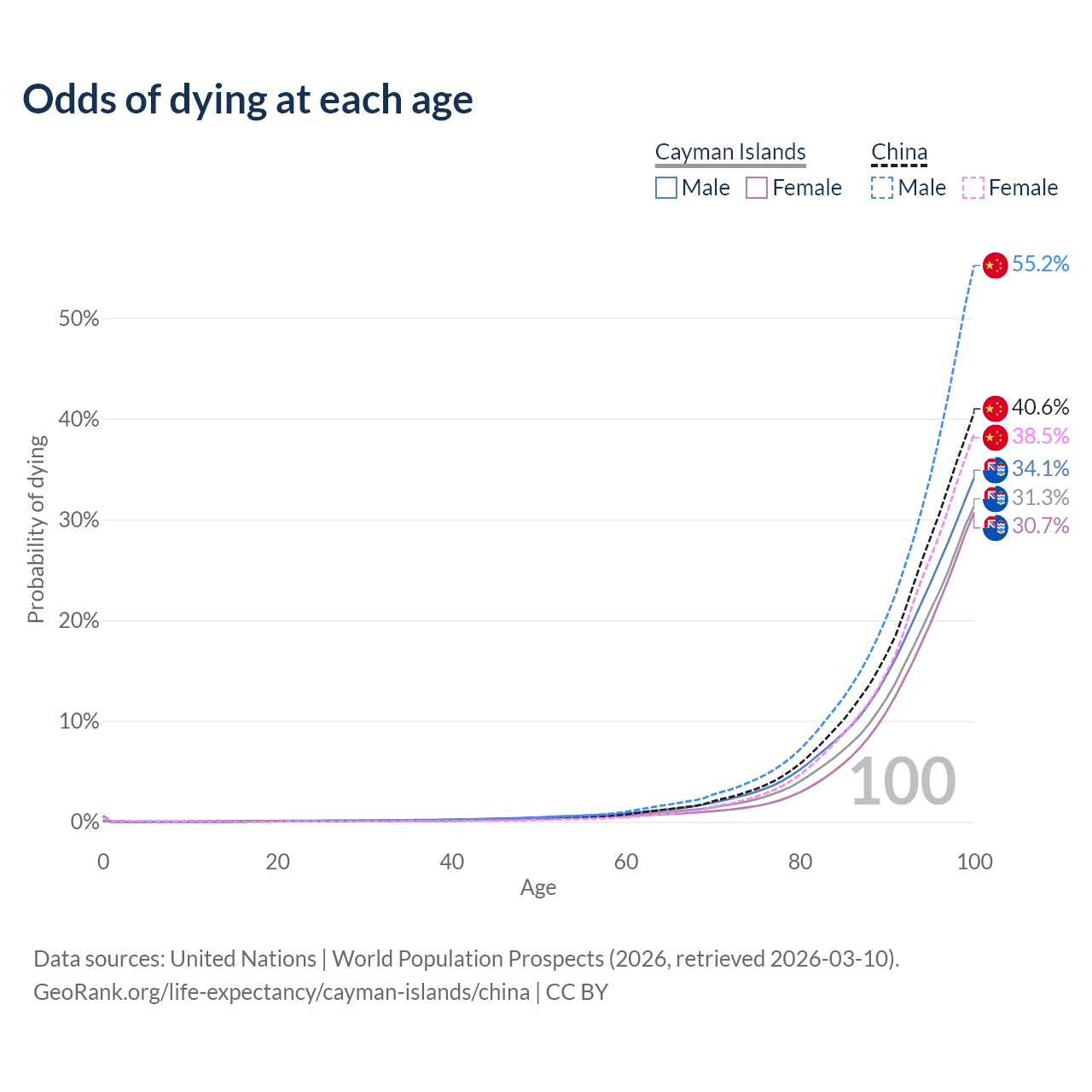 This life expectancy calculator shows the odds of living to 100, 95, 90, and below based on current age for both males and females in the Cayman Islands and China, along with mean and median age of death. The calculations are based on the 2026 life tables (actuarial tables) from the UN World Population Prospects.