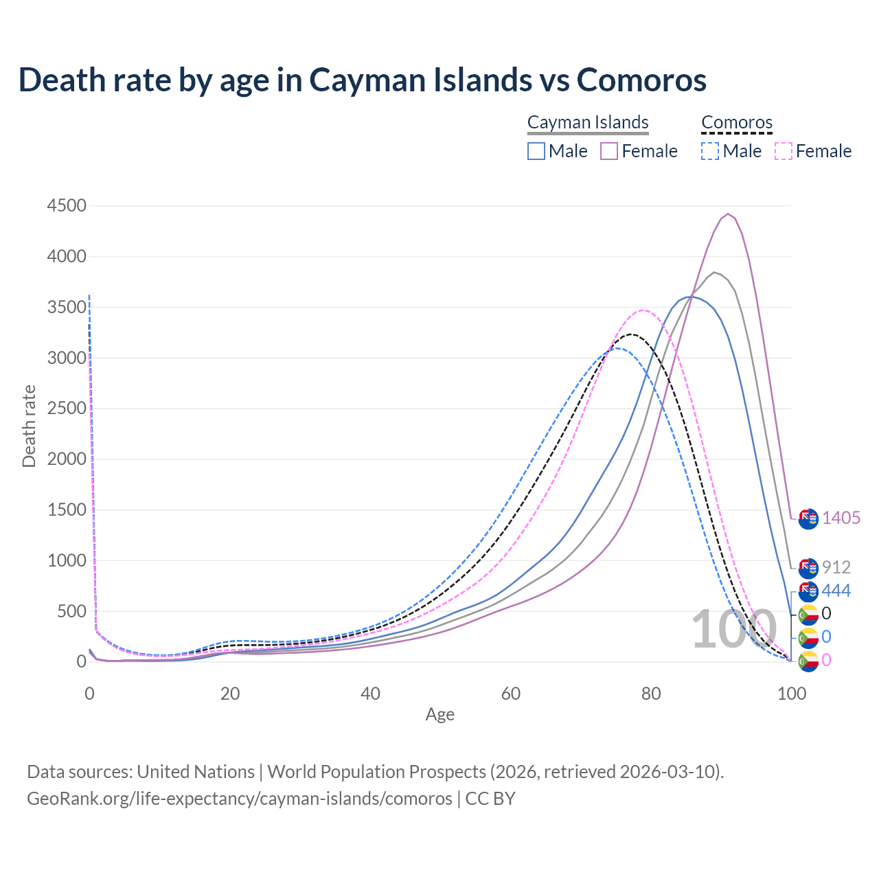 In the Cayman Islands, the most common age of death is 89, compared to 0 in Comoros. The median age of death is 84.9 in the Cayman Islands and 72.9 in Comoros, meaning only half of each cohort is expected to live past that age.