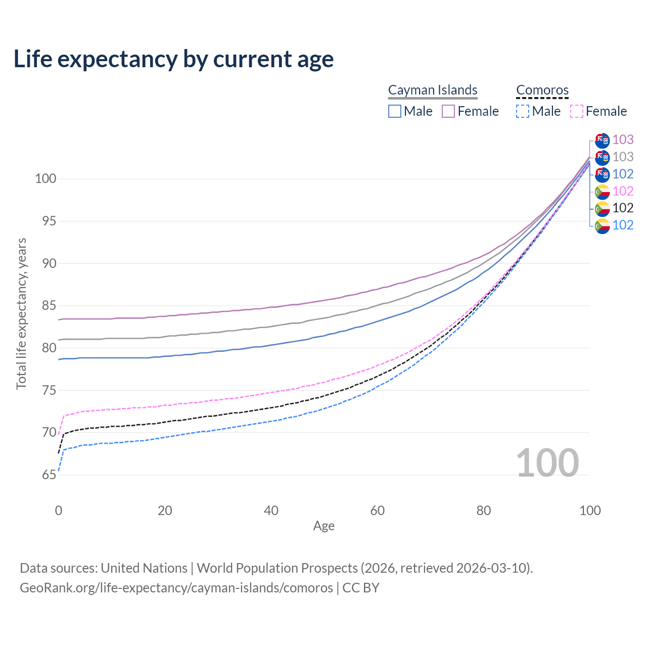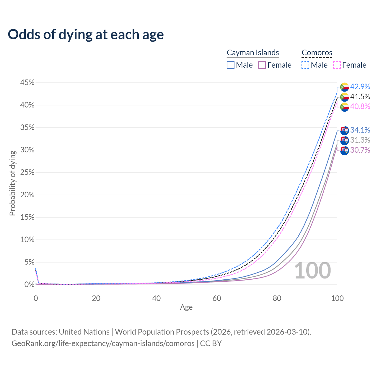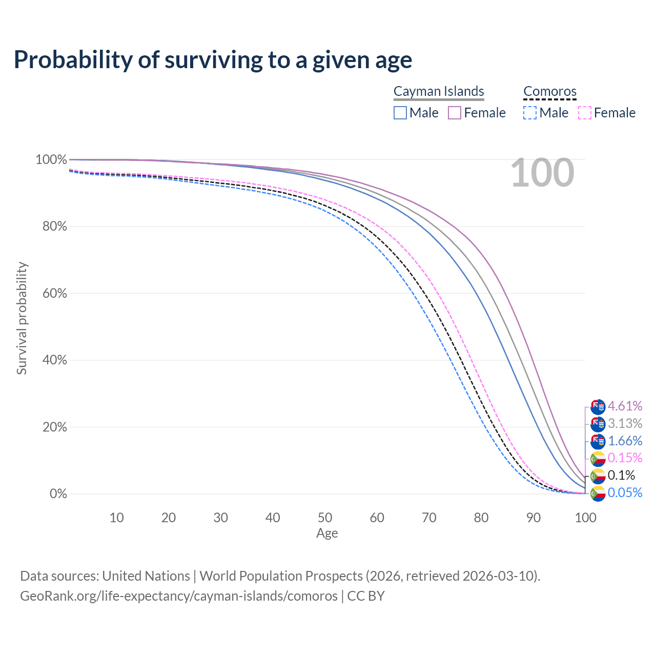 This life expectancy calculator shows the odds of living to 100, 95, 90, and below based on current age for both males and females in the Cayman Islands and Comoros, along with mean and median age of death. The calculations are based on the 2026 life tables (actuarial tables) from the UN World Population Prospects.