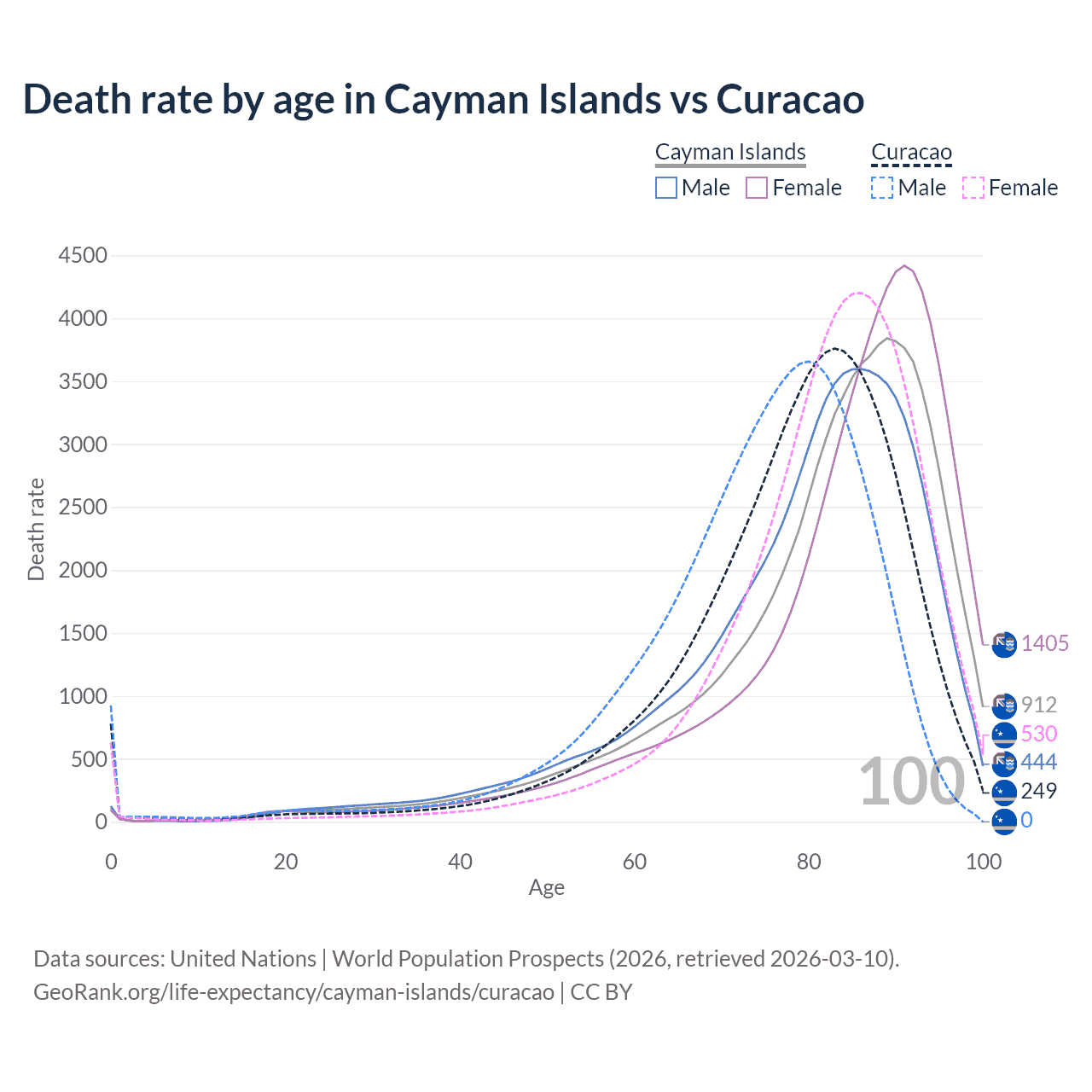 In the Cayman Islands, the most common age of death is 89, compared to 83 in Curacao. The median age of death is 84.9 in the Cayman Islands and 80.4 in Curacao, meaning only half of each cohort is expected to live past that age.