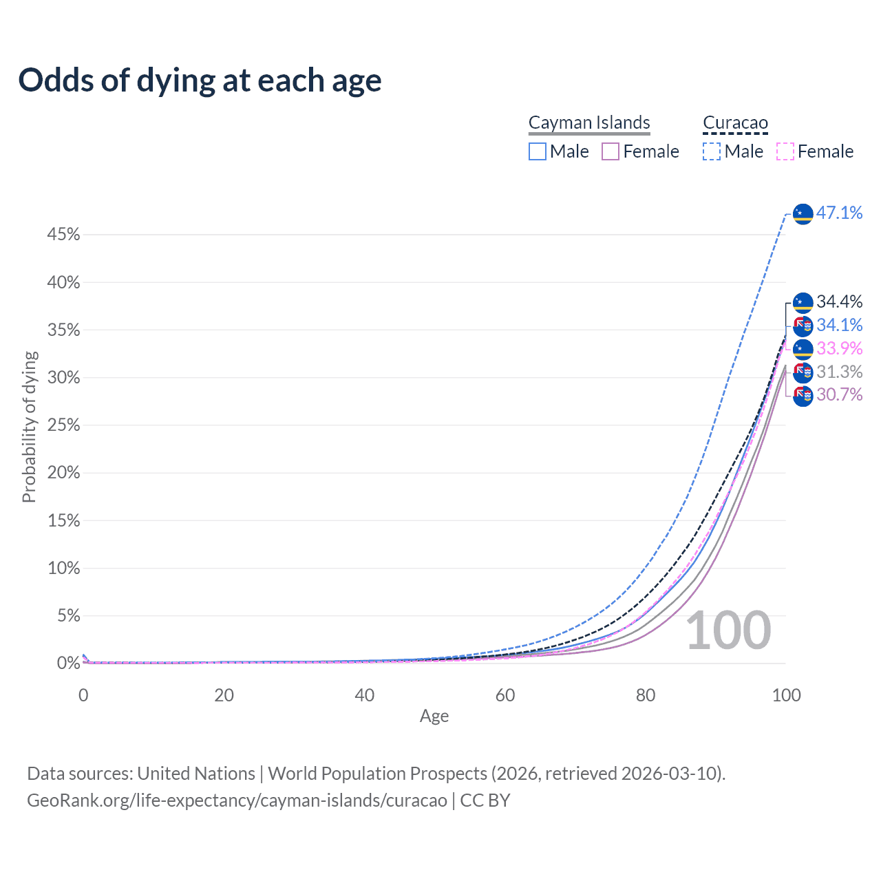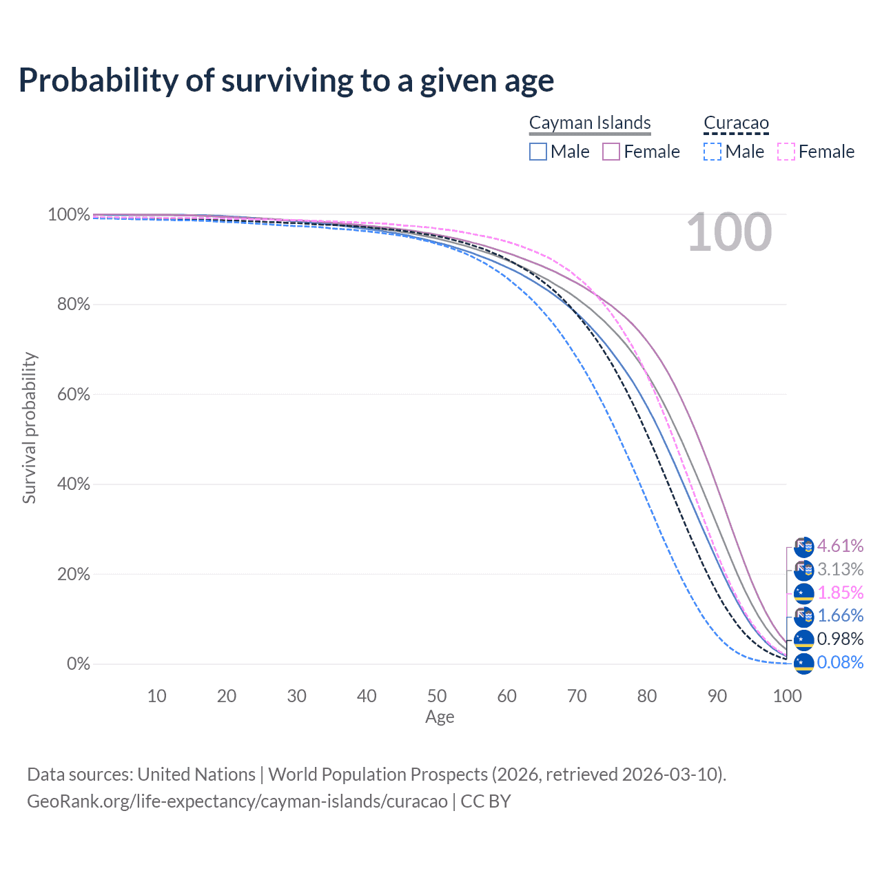 This life expectancy calculator shows the odds of living to 100, 95, 90, and below based on current age for both males and females in the Cayman Islands and Curacao, along with mean and median age of death. The calculations are based on the 2026 life tables (actuarial tables) from the UN World Population Prospects.