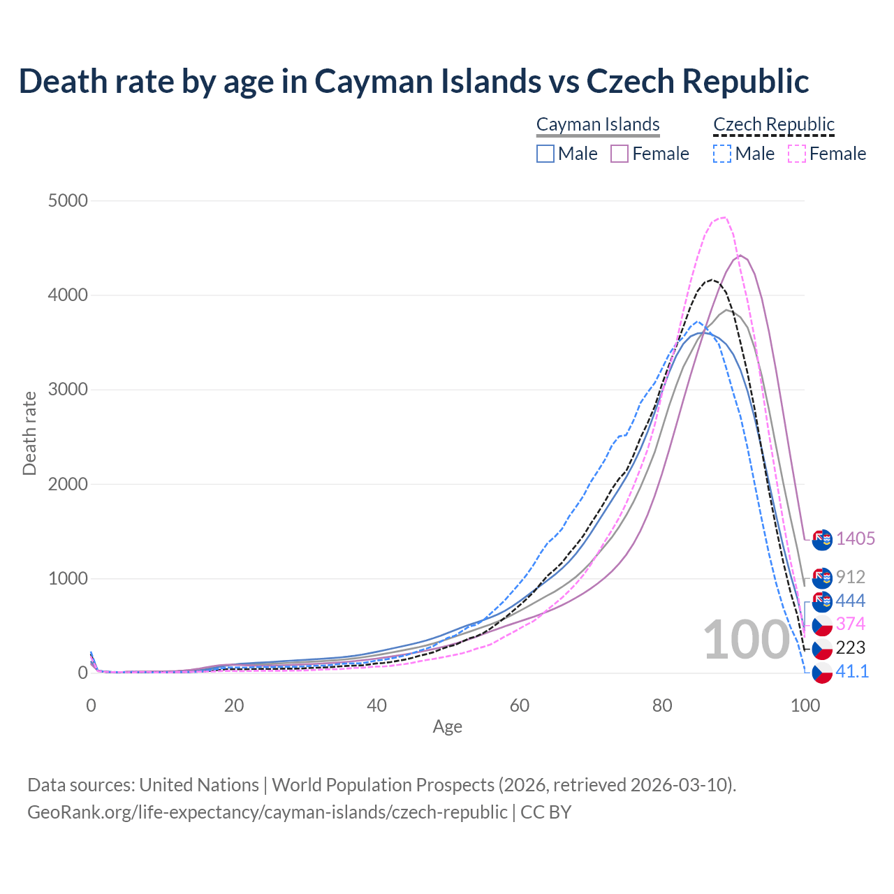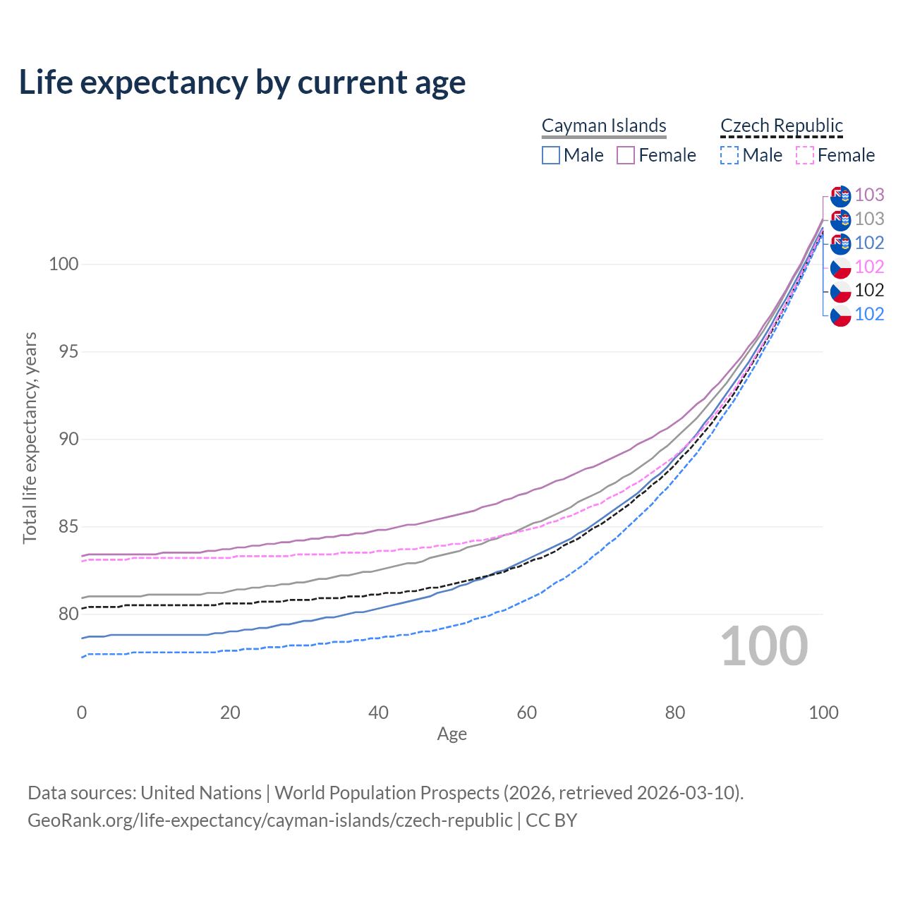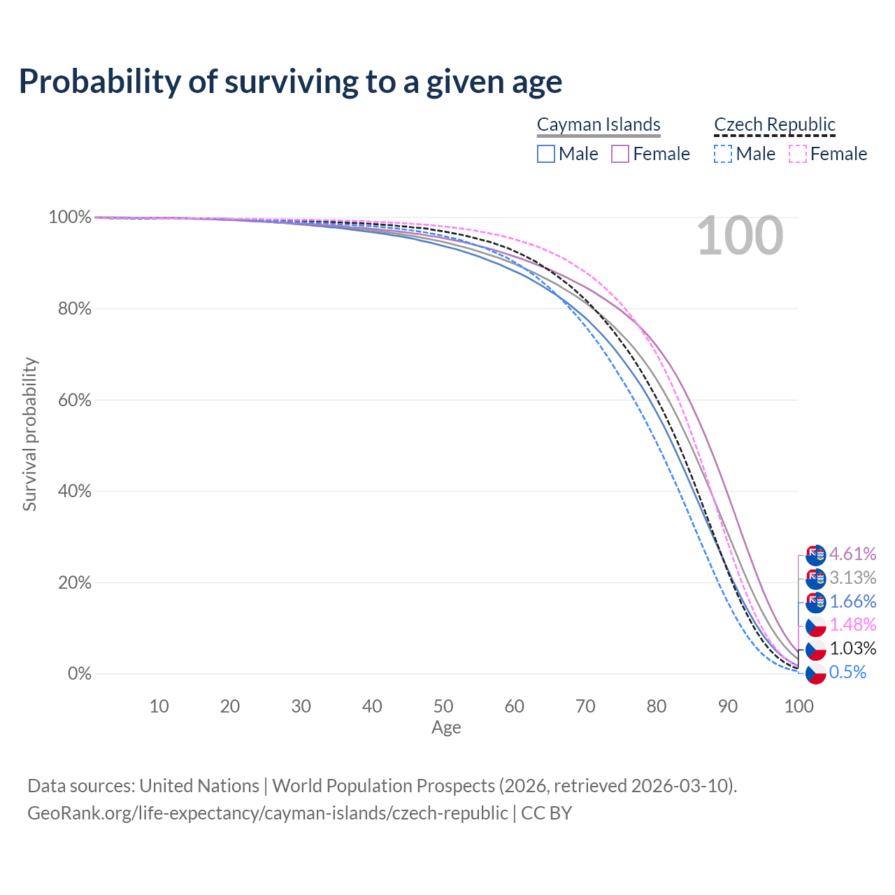 This life expectancy calculator shows the odds of living to 100, 95, 90, and below based on current age for both males and females in the Cayman Islands and the Czech Republic, along with mean and median age of death. The calculations are based on the 2026 life tables (actuarial tables) from the UN World Population Prospects.