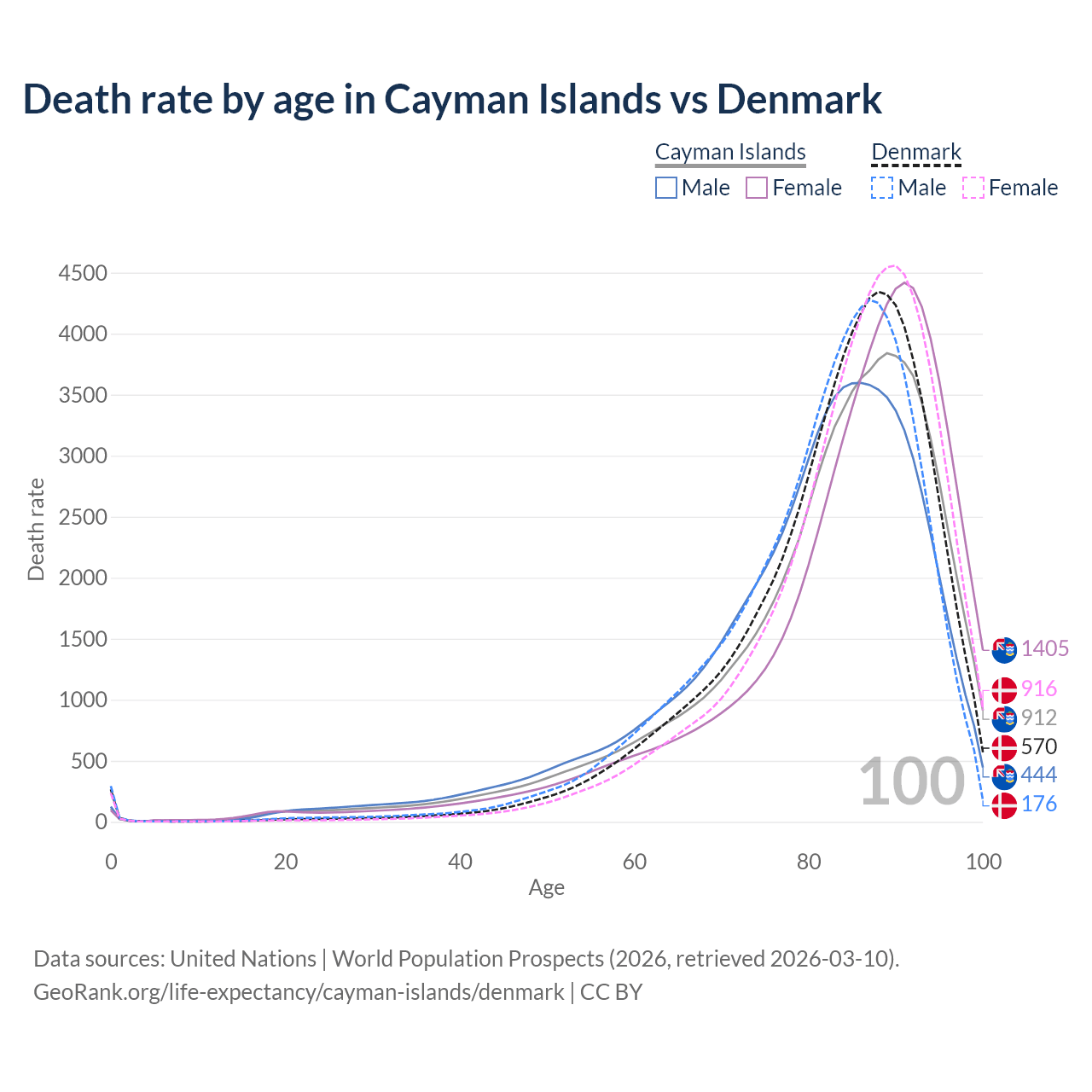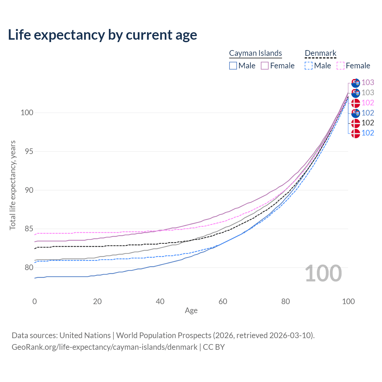 This life expectancy calculator shows the odds of living to 100, 95, 90, and below based on current age for both males and females in the Cayman Islands and Denmark, along with mean and median age of death. The calculations are based on the 2026 life tables (actuarial tables) from the UN World Population Prospects.