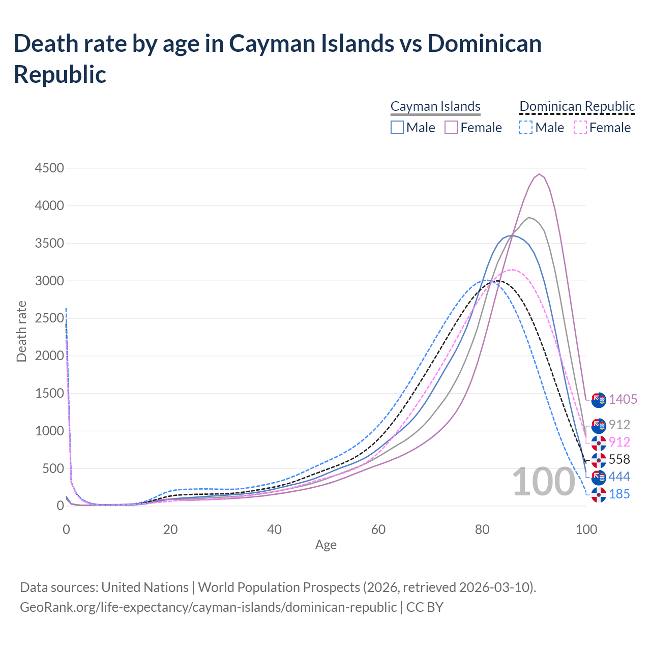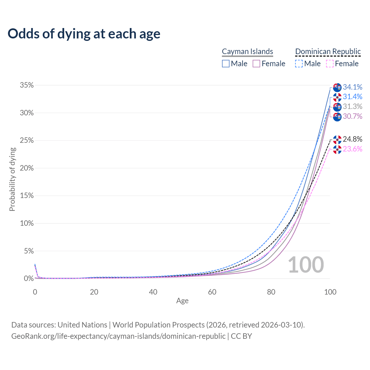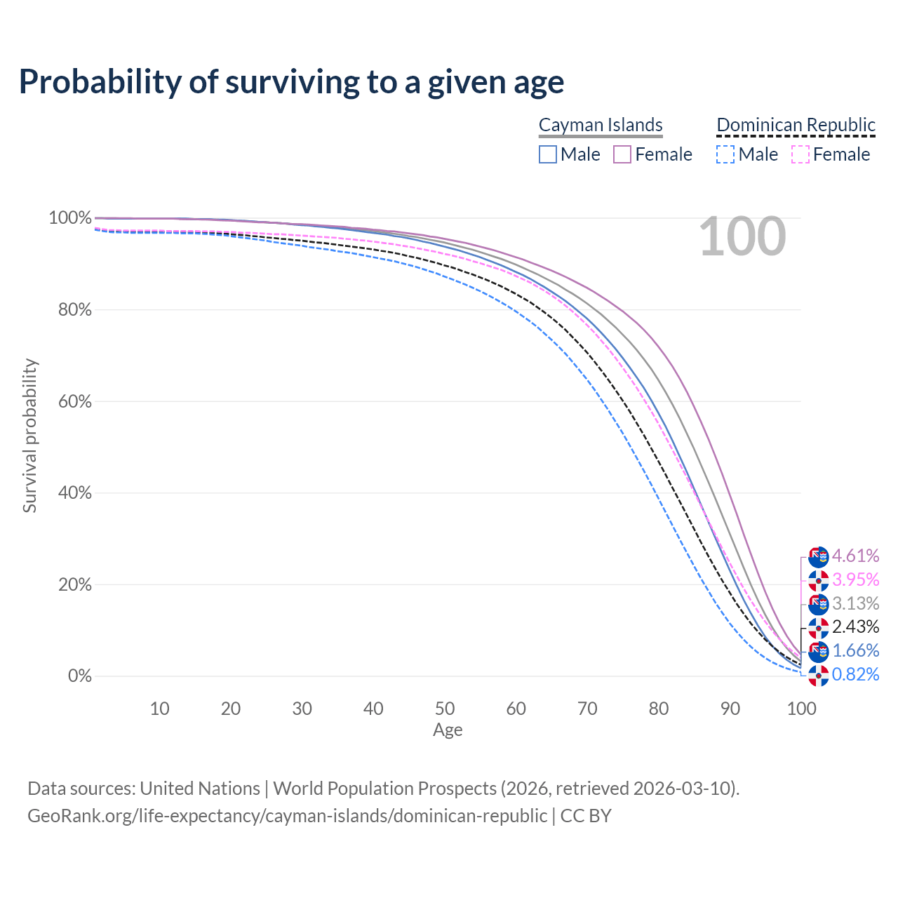 This life expectancy calculator shows the odds of living to 100, 95, 90, and below based on current age for both males and females in the Cayman Islands and the Dominican Republic, along with mean and median age of death. The calculations are based on the 2026 life tables (actuarial tables) from the UN World Population Prospects.