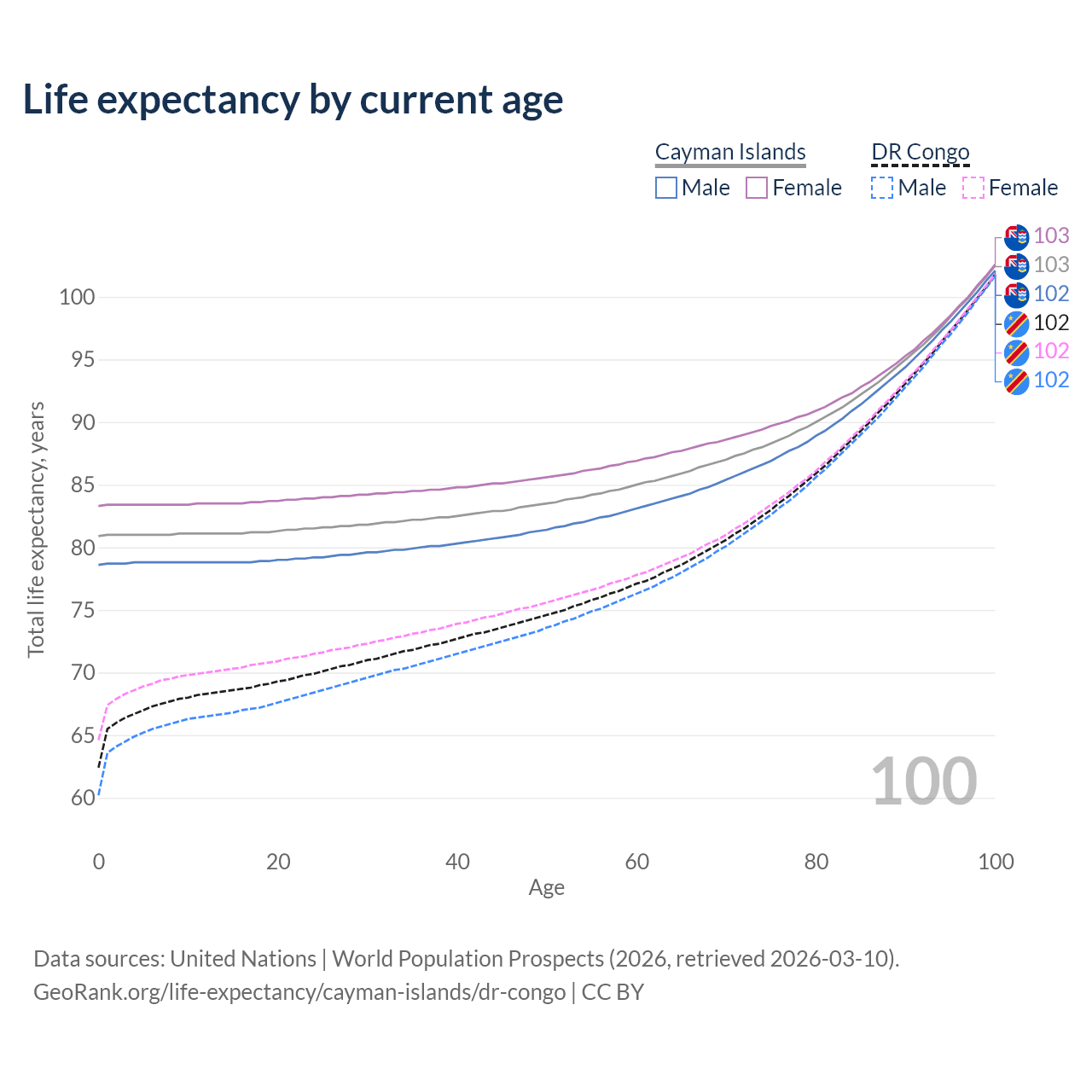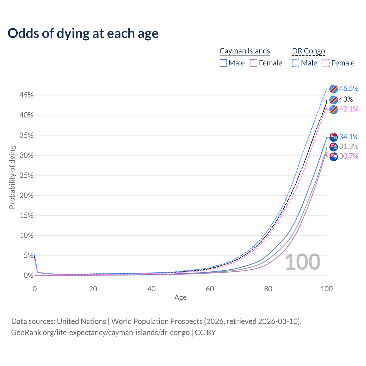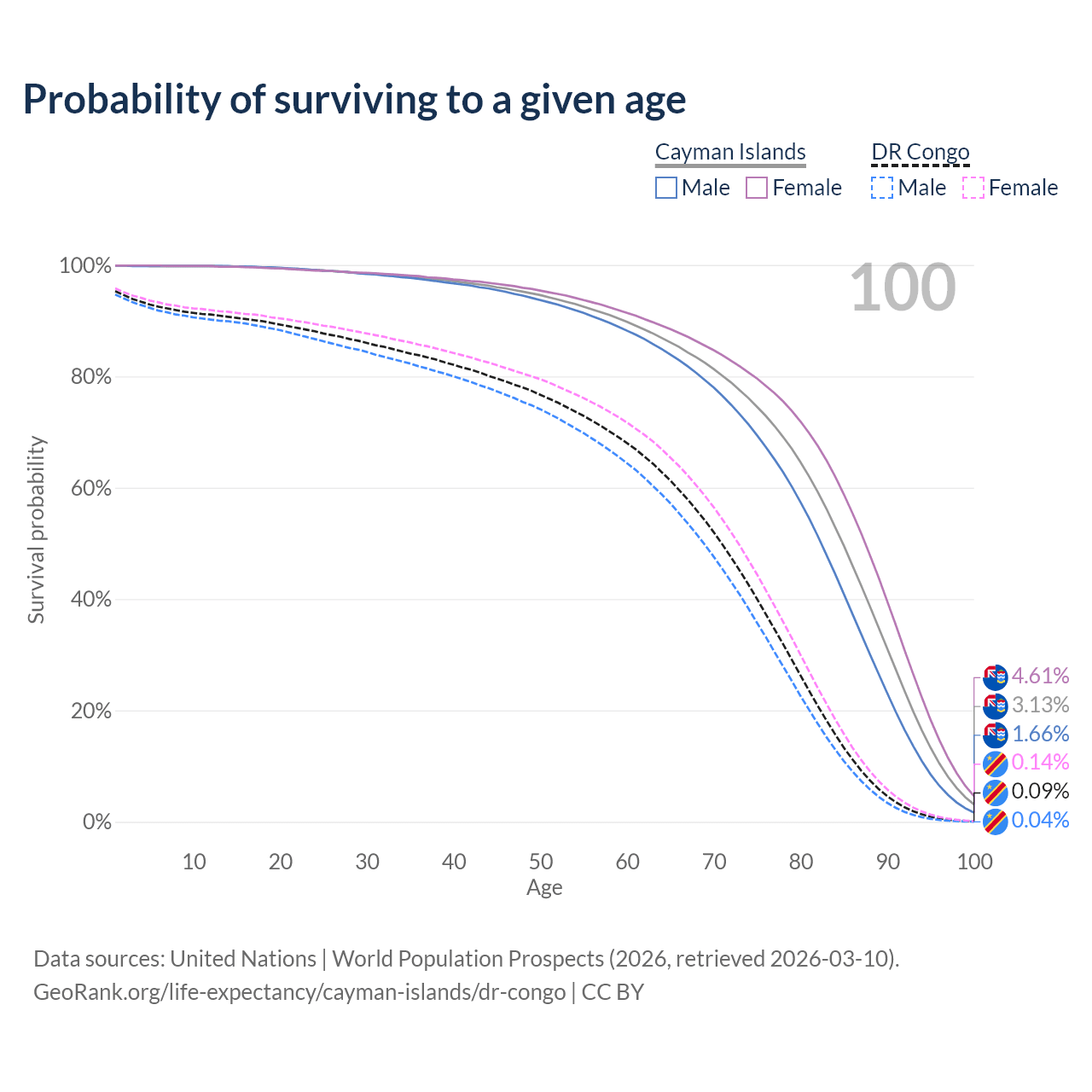 This life expectancy calculator shows the odds of living to 100, 95, 90, and below based on current age for both males and females in the Cayman Islands and the DR Congo, along with mean and median age of death. The calculations are based on the 2026 life tables (actuarial tables) from the UN World Population Prospects.