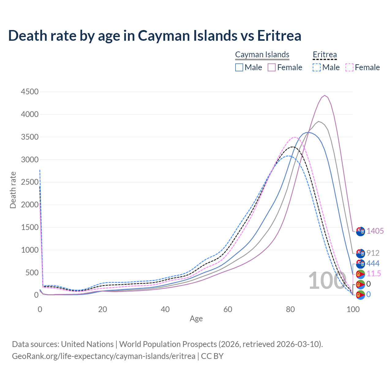 In the Cayman Islands, the most common age of death is 89, compared to 81 in Eritrea. The median age of death is 84.9 in the Cayman Islands and 75.5 in Eritrea, meaning only half of each cohort is expected to live past that age.