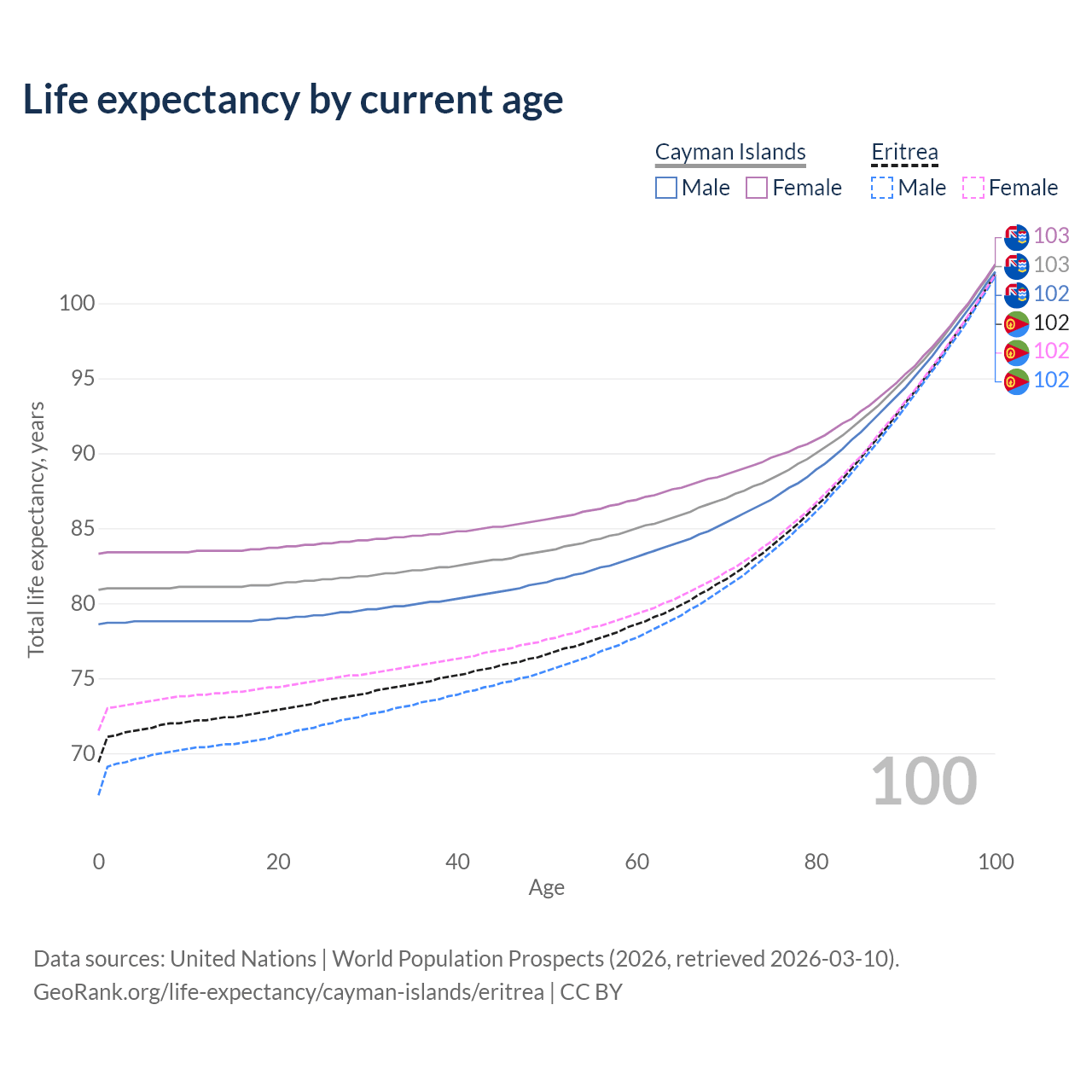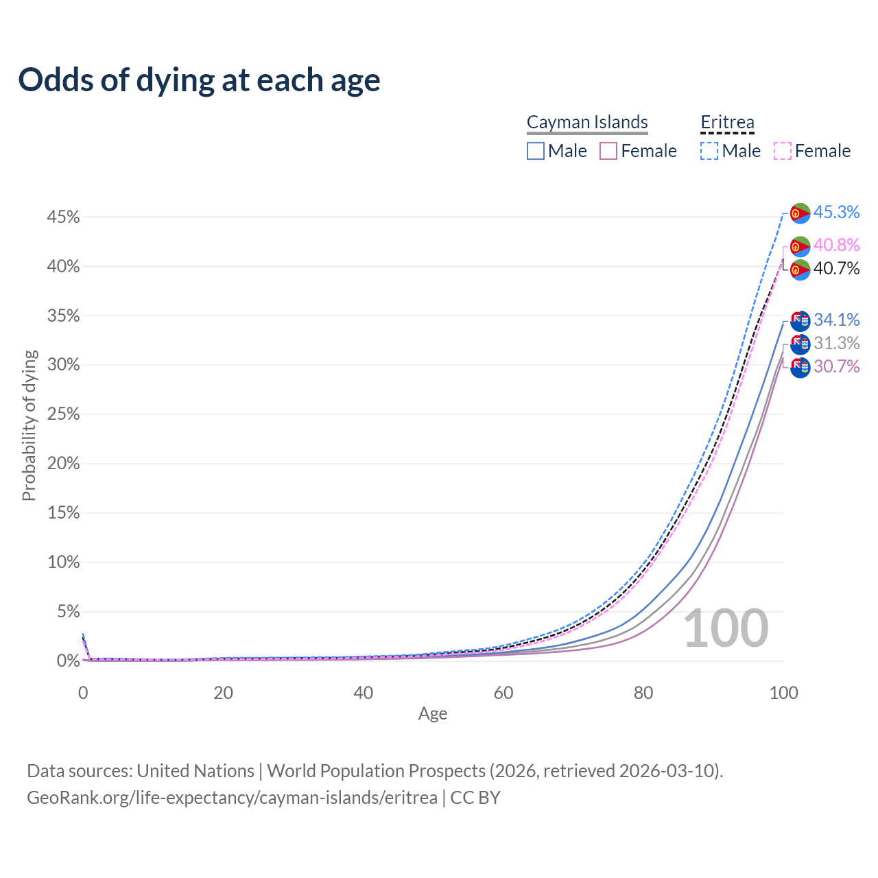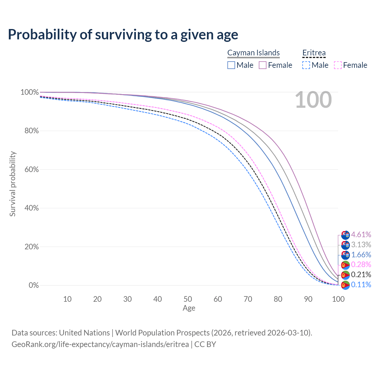 This life expectancy calculator shows the odds of living to 100, 95, 90, and below based on current age for both males and females in the Cayman Islands and Eritrea, along with mean and median age of death. The calculations are based on the 2026 life tables (actuarial tables) from the UN World Population Prospects.