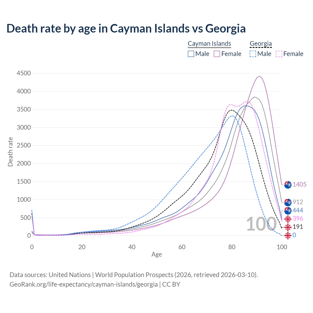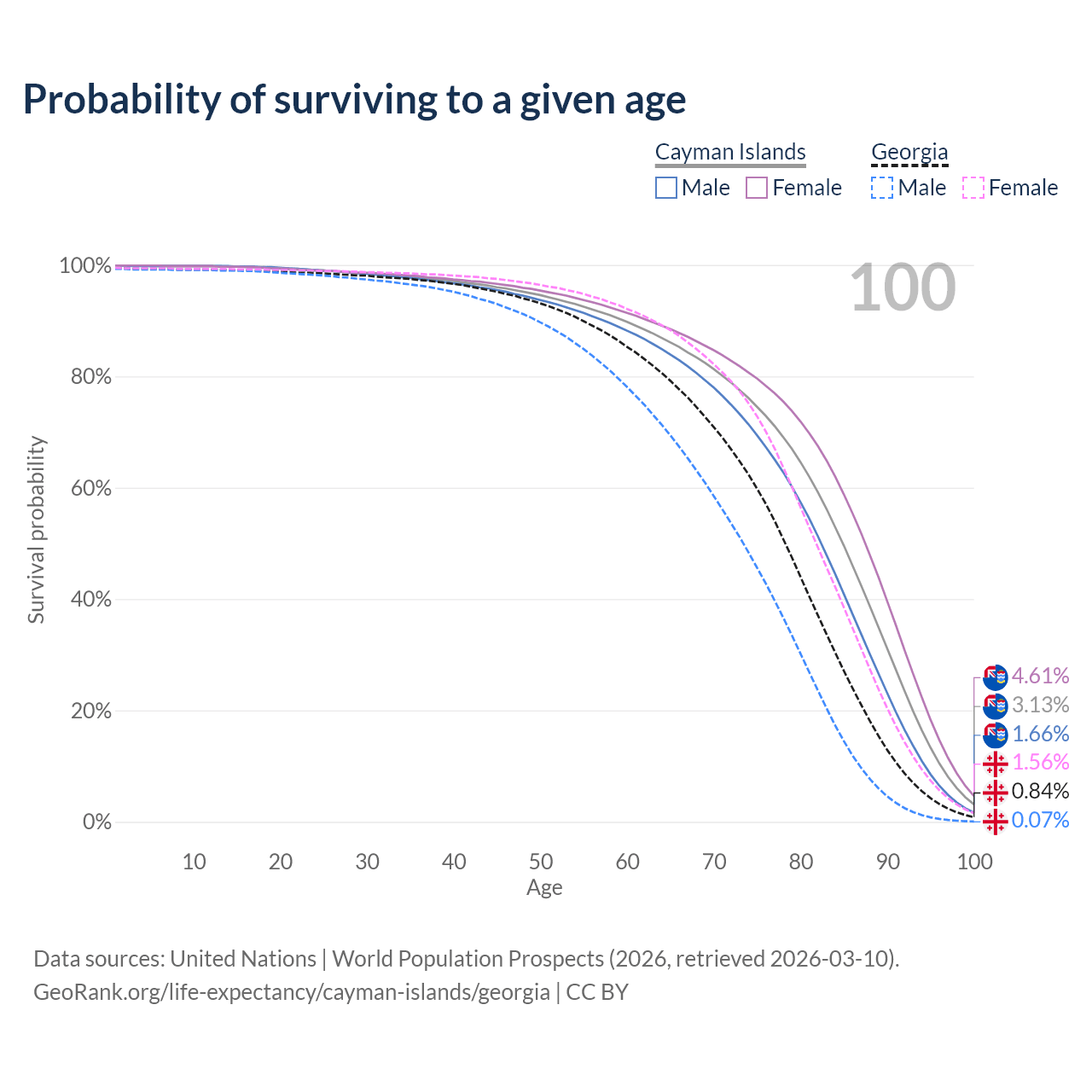 This life expectancy calculator shows the odds of living to 100, 95, 90, and below based on current age for both males and females in the Cayman Islands and Georgia, along with mean and median age of death. The calculations are based on the 2026 life tables (actuarial tables) from the UN World Population Prospects.