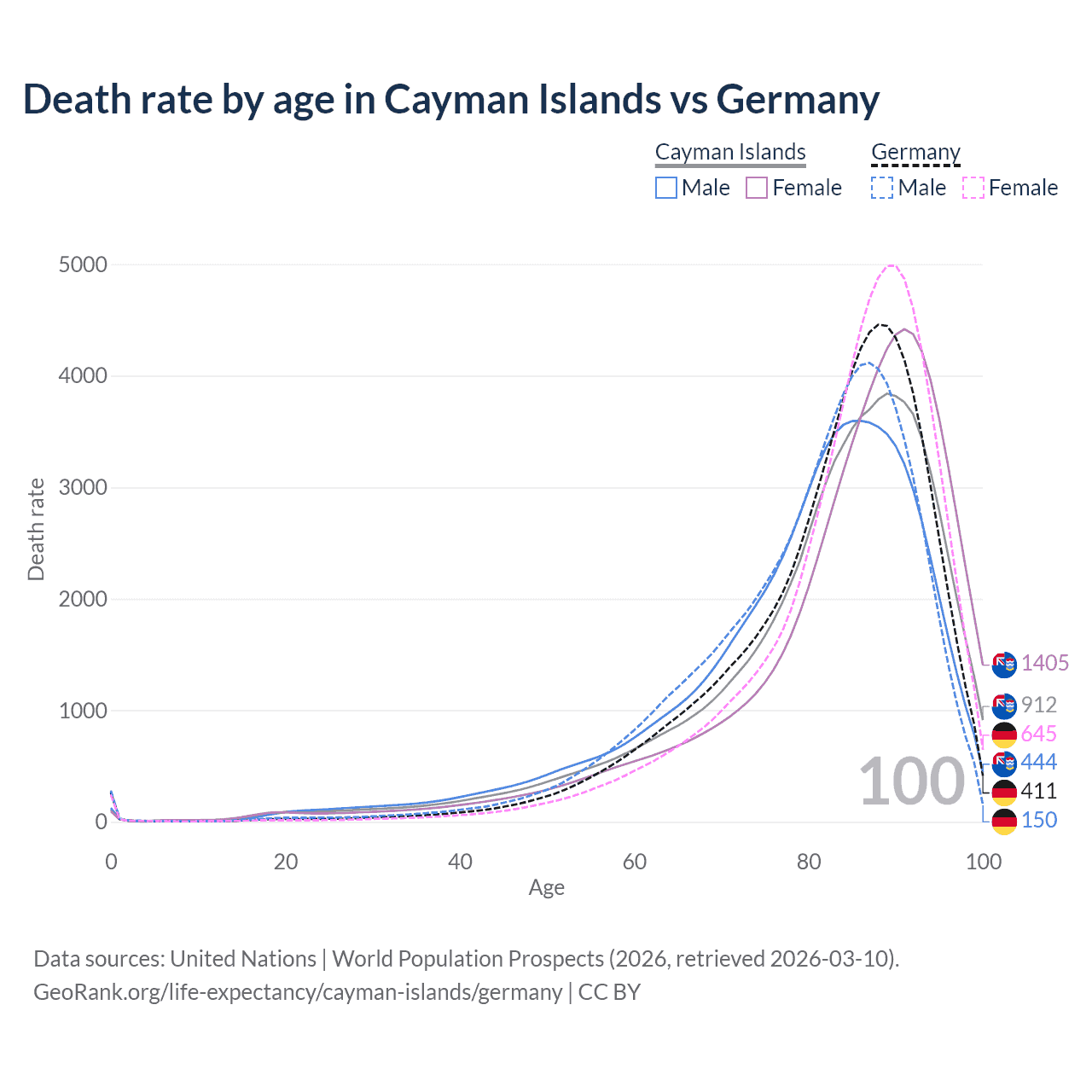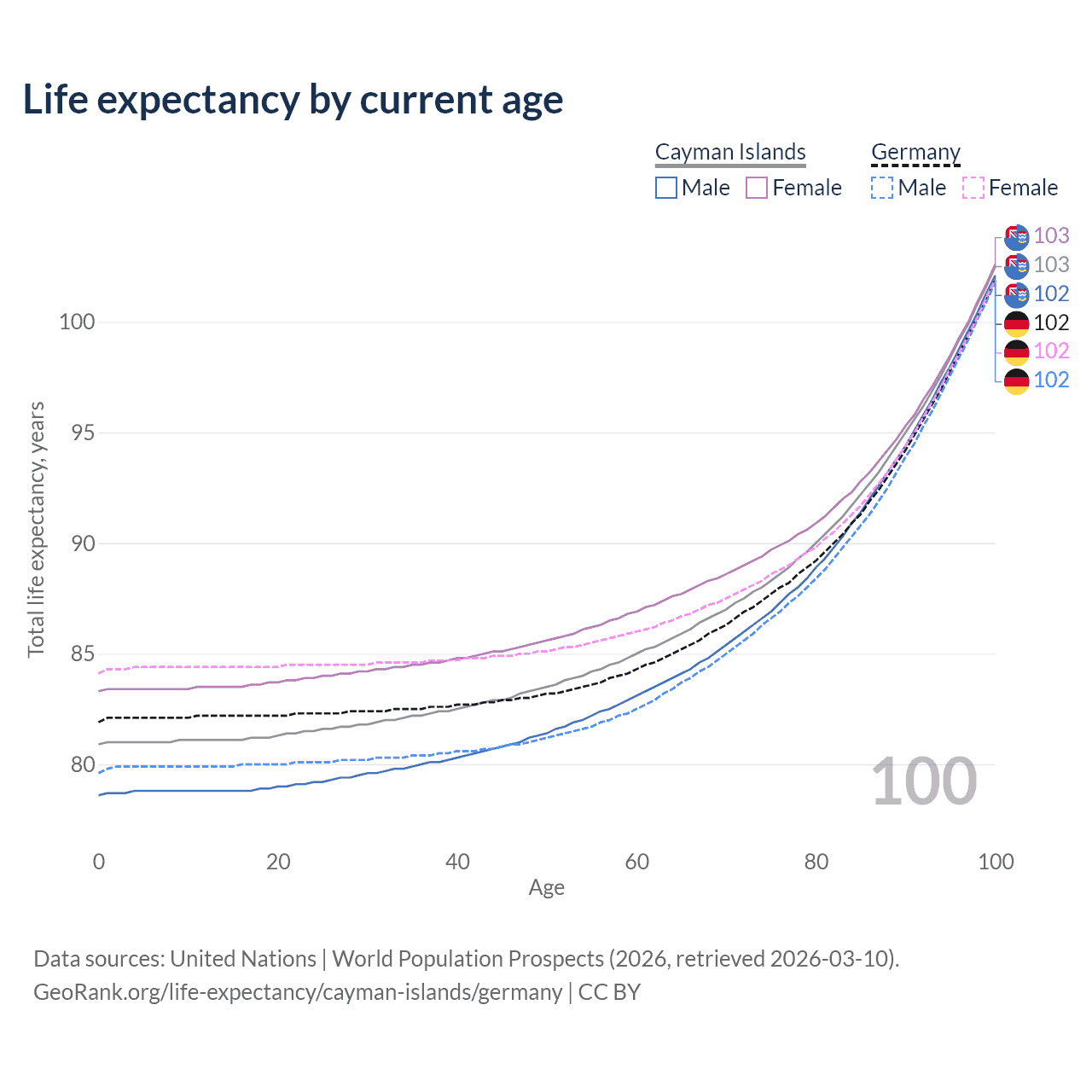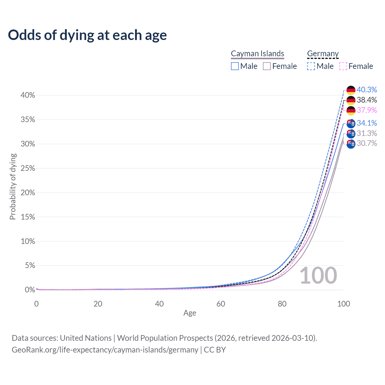 This life expectancy calculator shows the odds of living to 100, 95, 90, and below based on current age for both males and females in the Cayman Islands and Germany, along with mean and median age of death. The calculations are based on the 2026 life tables (actuarial tables) from the UN World Population Prospects.