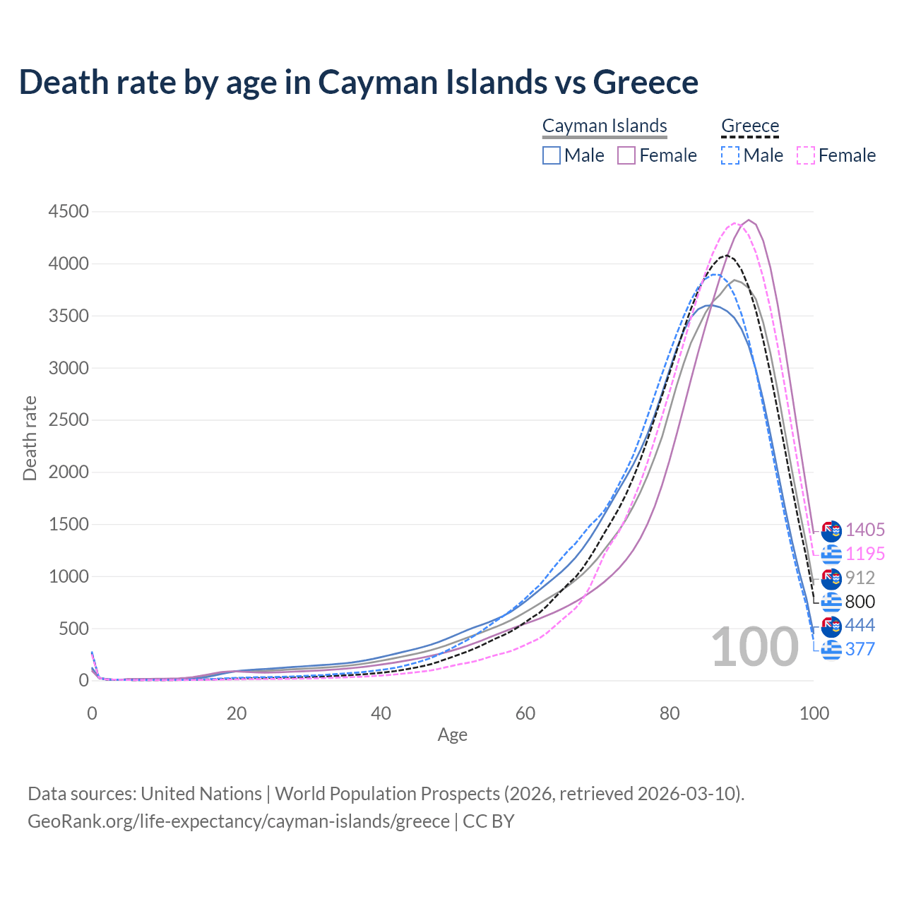 This life expectancy calculator shows the odds of living to 100, 95, 90, and below based on current age for both males and females in the Cayman Islands and Greece, along with mean and median age of death. The calculations are based on the 2026 life tables (actuarial tables) from the UN World Population Prospects.