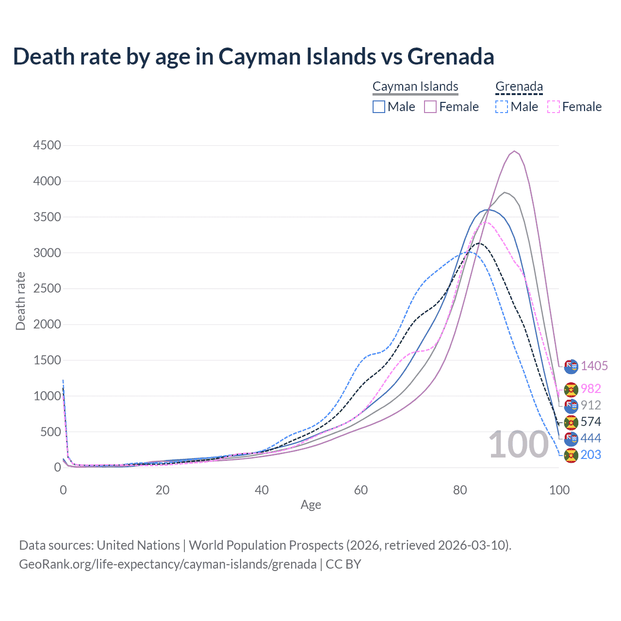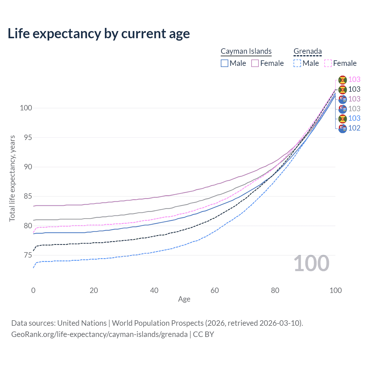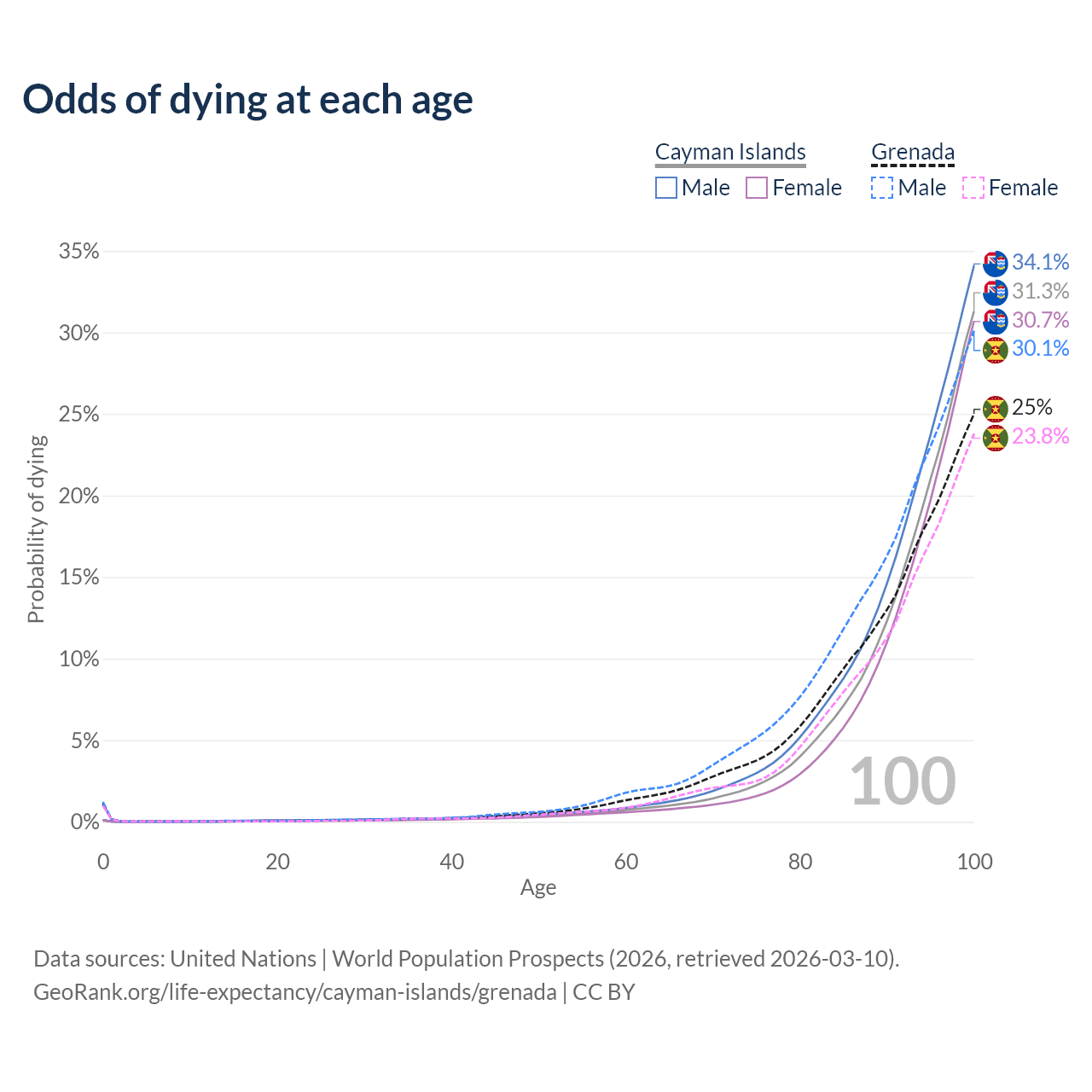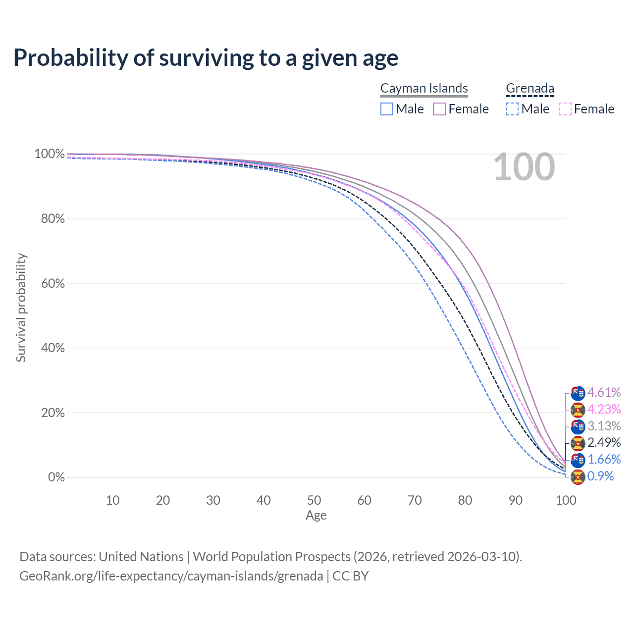 This life expectancy calculator shows the odds of living to 100, 95, 90, and below based on current age for both males and females in the Cayman Islands and Grenada, along with mean and median age of death. The calculations are based on the 2026 life tables (actuarial tables) from the UN World Population Prospects.