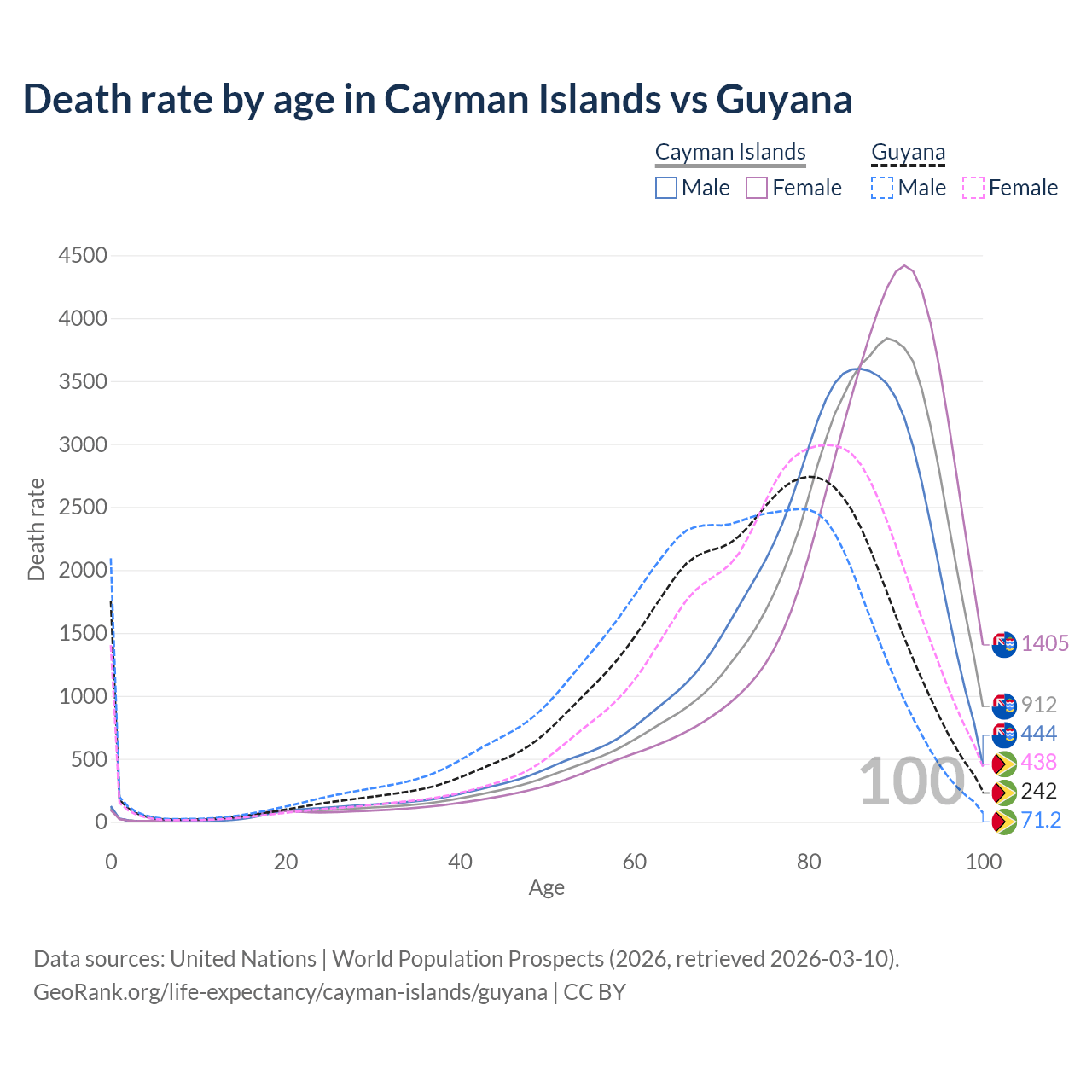 In the Cayman Islands, the most common age of death is 89, compared to 80 in Guyana. The median age of death is 84.9 in the Cayman Islands and 74.1 in Guyana, meaning only half of each cohort is expected to live past that age.
