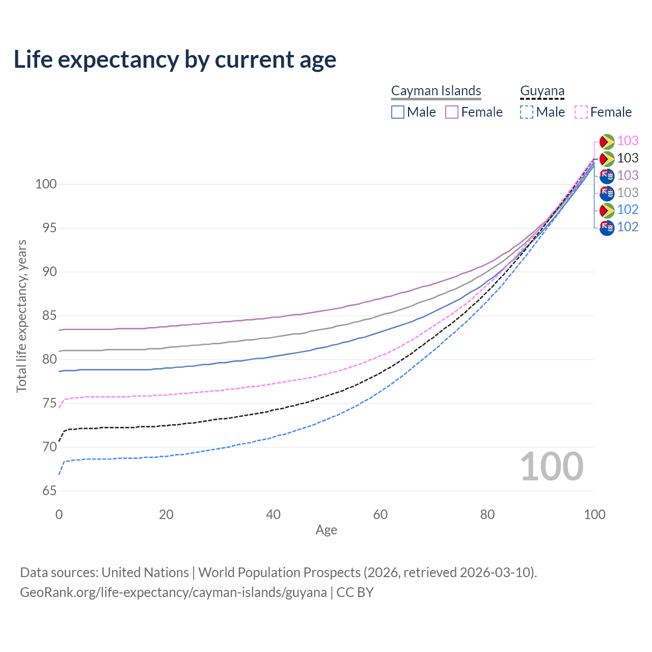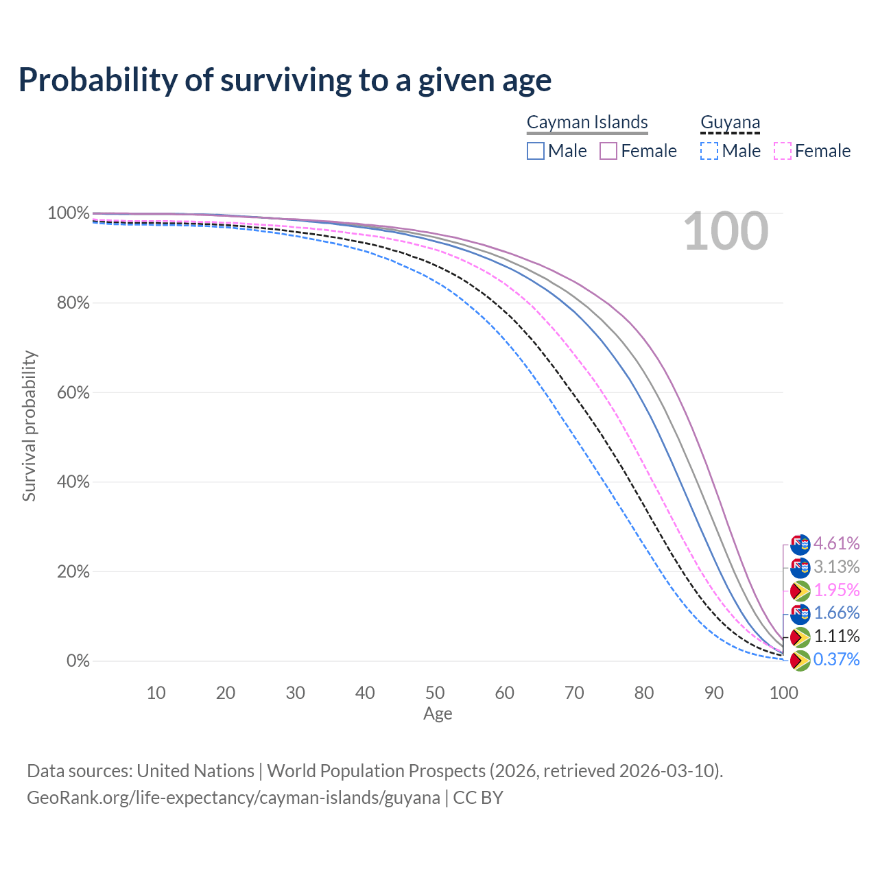 This life expectancy calculator shows the odds of living to 100, 95, 90, and below based on current age for both males and females in the Cayman Islands and Guyana, along with mean and median age of death. The calculations are based on the 2026 life tables (actuarial tables) from the UN World Population Prospects.