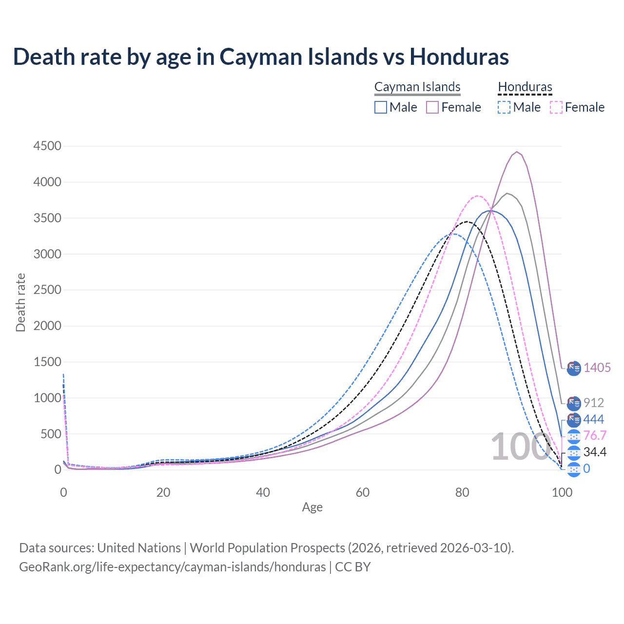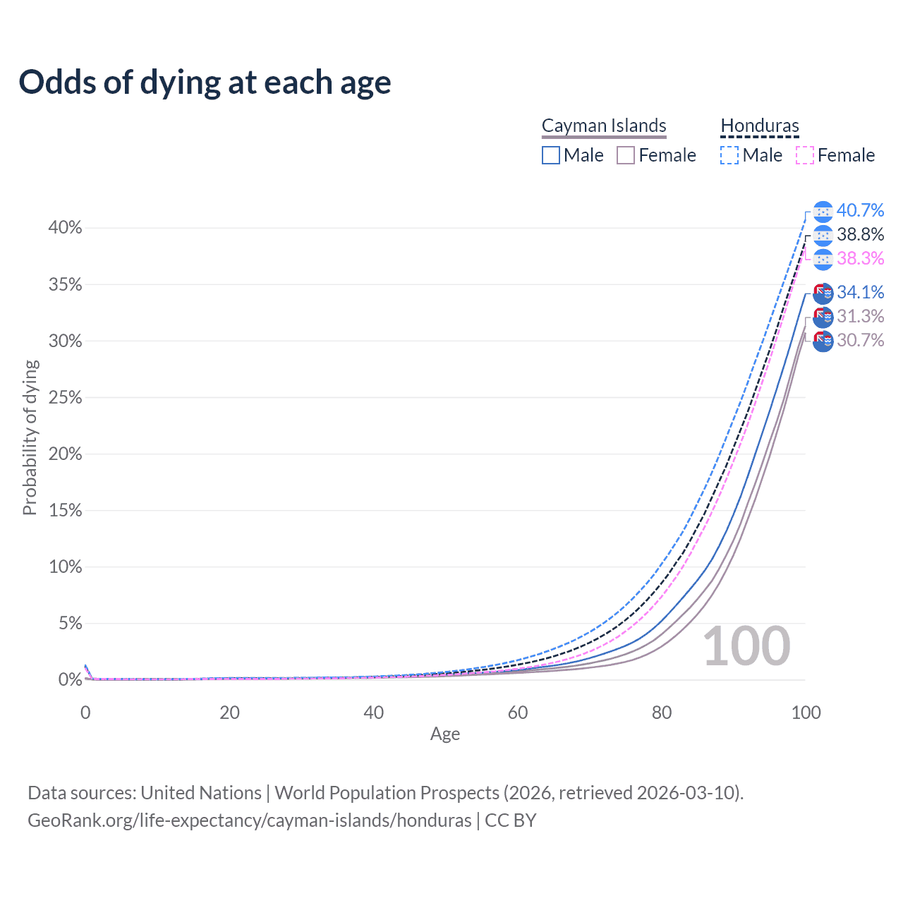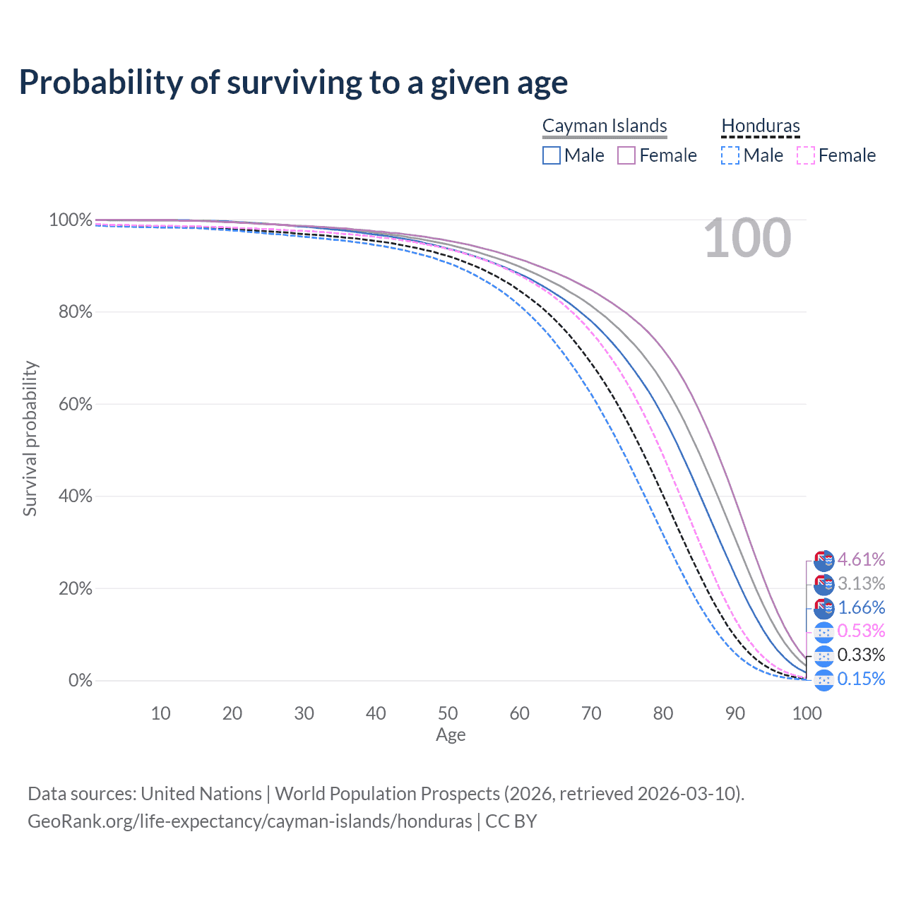 This life expectancy calculator shows the odds of living to 100, 95, 90, and below based on current age for both males and females in the Cayman Islands and Honduras, along with mean and median age of death. The calculations are based on the 2026 life tables (actuarial tables) from the UN World Population Prospects.