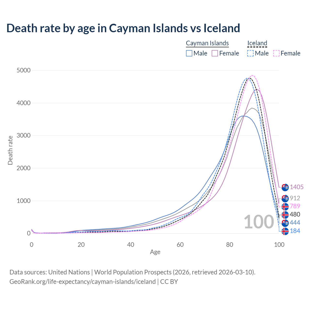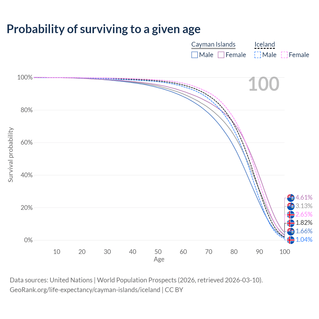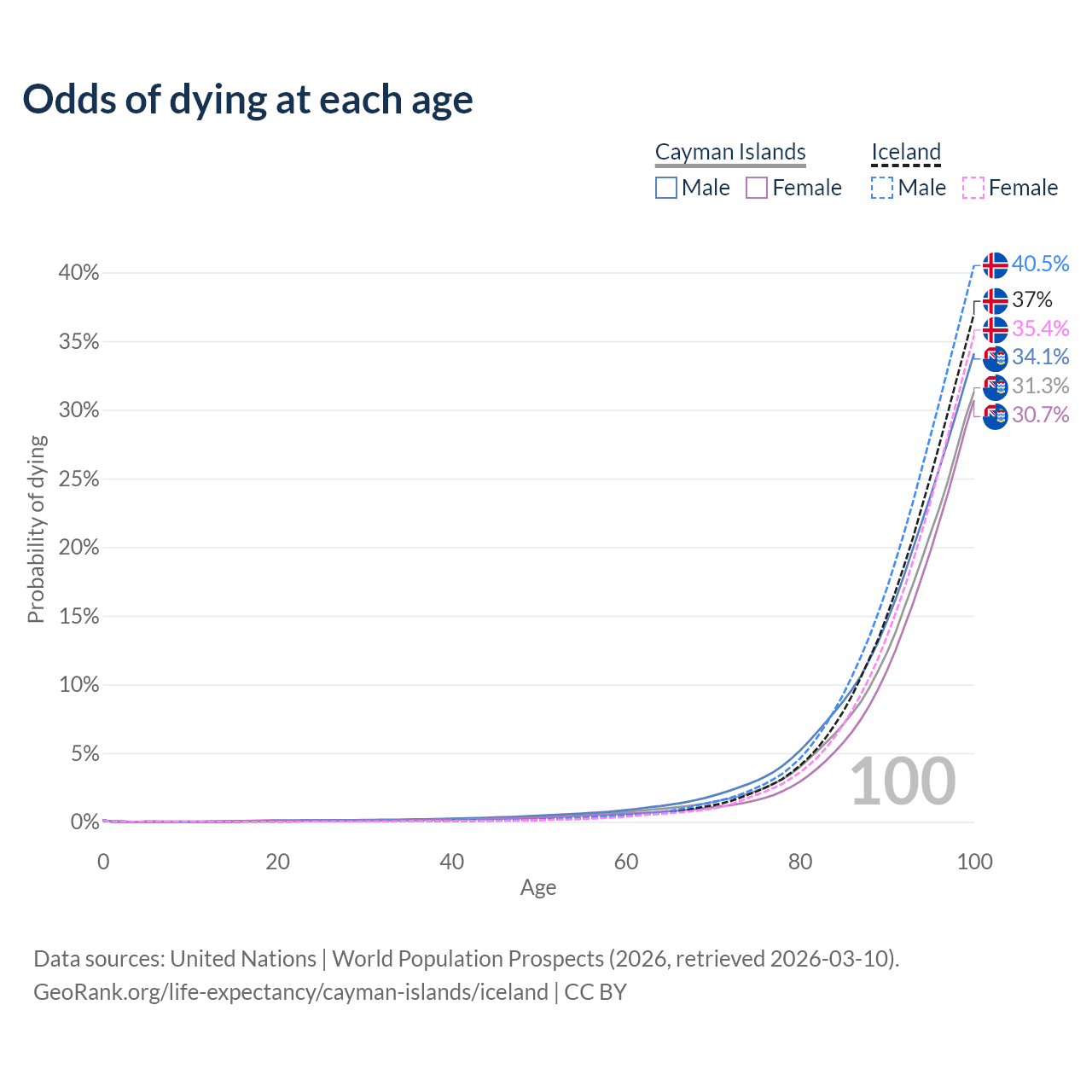 This life expectancy calculator shows the odds of living to 100, 95, 90, and below based on current age for both males and females in the Cayman Islands and Iceland, along with mean and median age of death. The calculations are based on the 2026 life tables (actuarial tables) from the UN World Population Prospects.