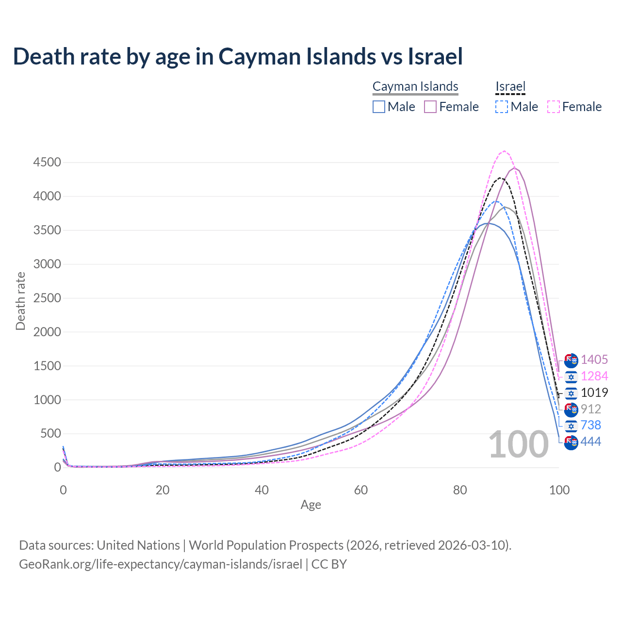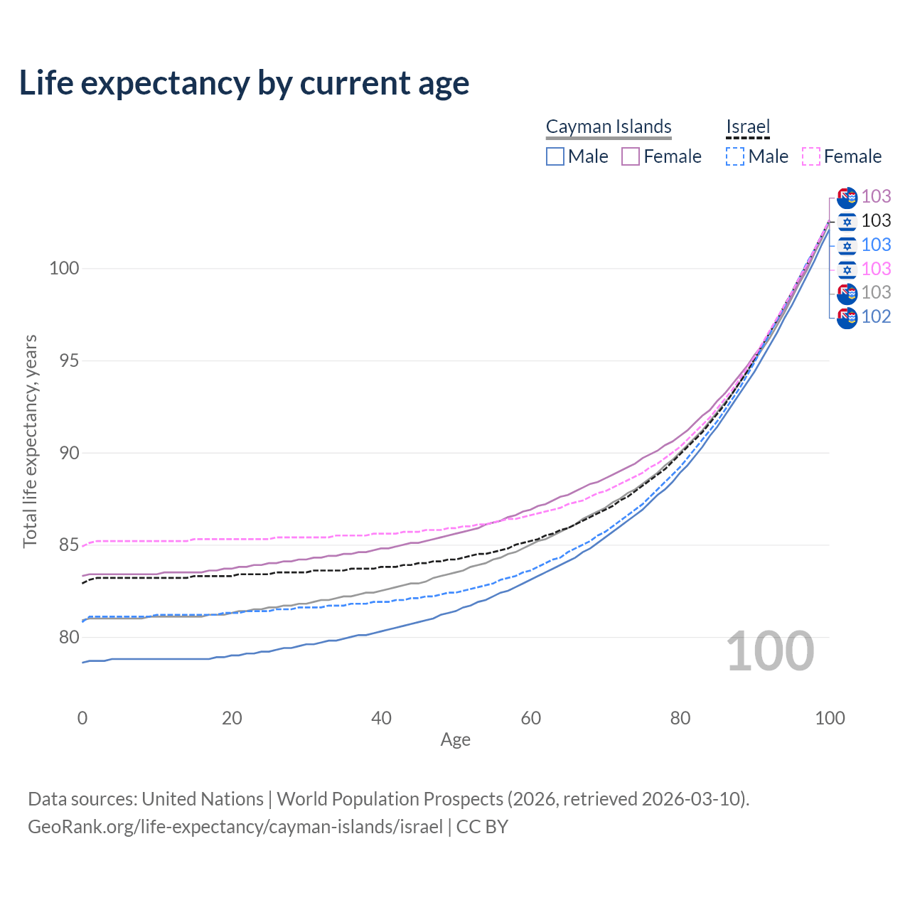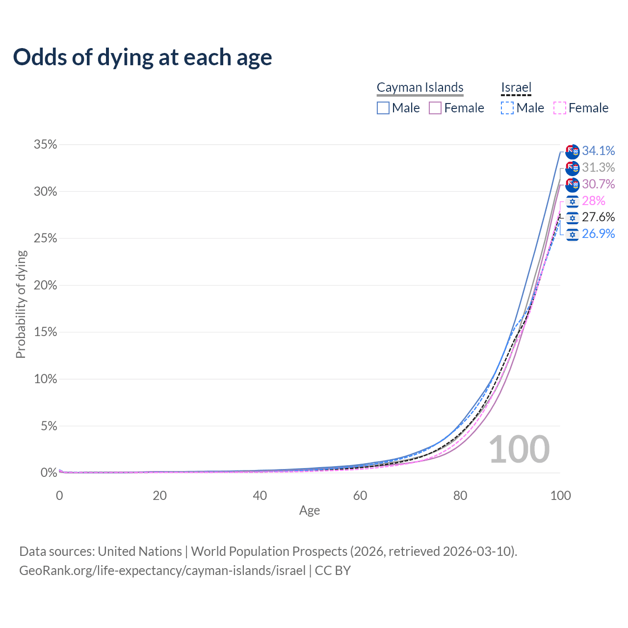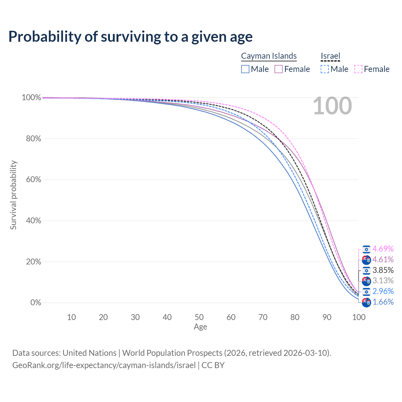This life expectancy calculator shows the odds of living to 100, 95, 90, and below based on current age for both males and females in the Cayman Islands and Israel, along with mean and median age of death. The calculations are based on the 2026 life tables (actuarial tables) from the UN World Population Prospects.