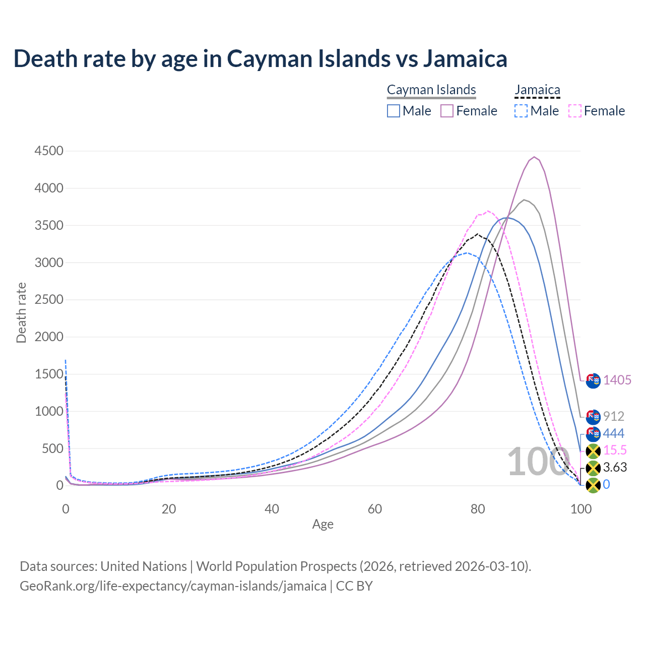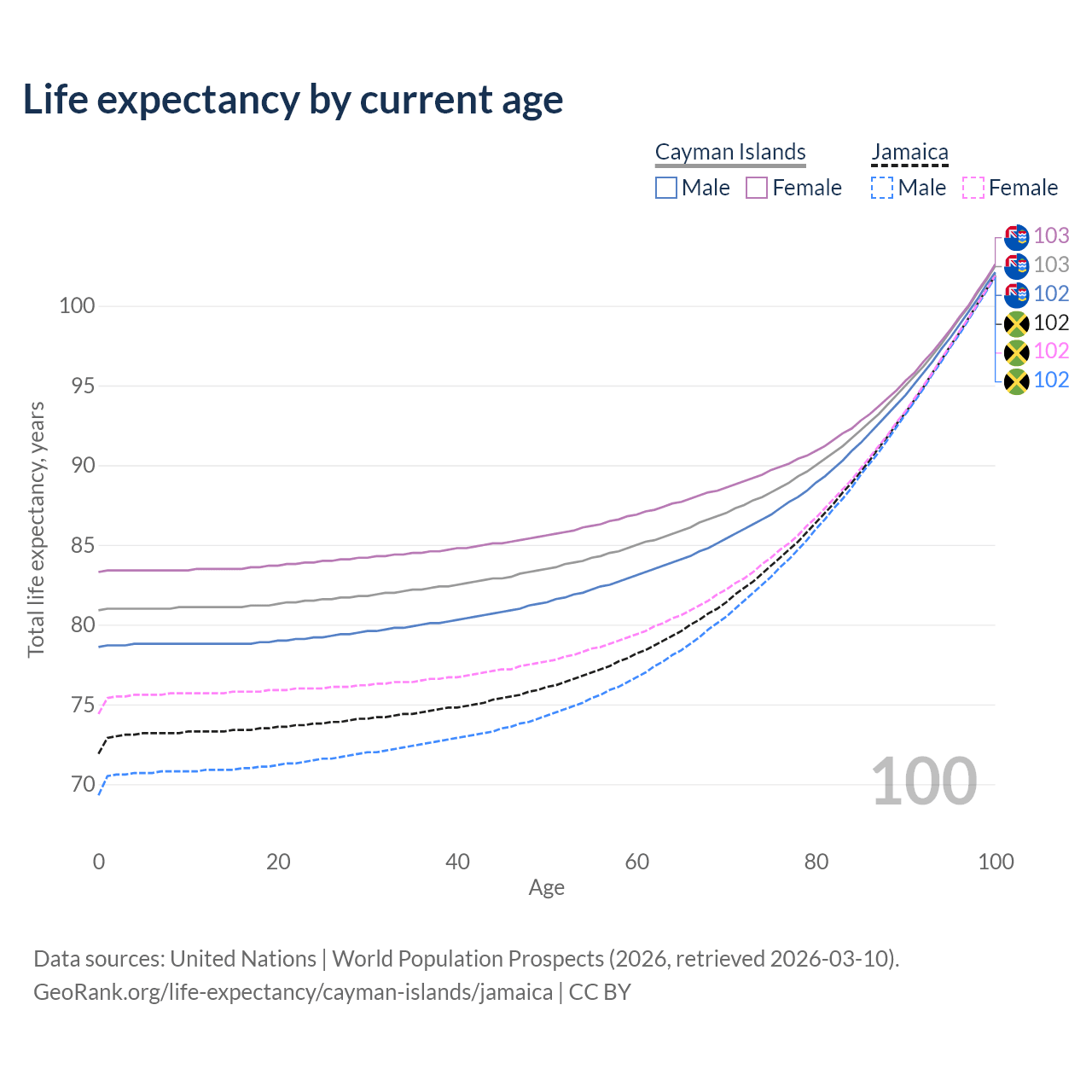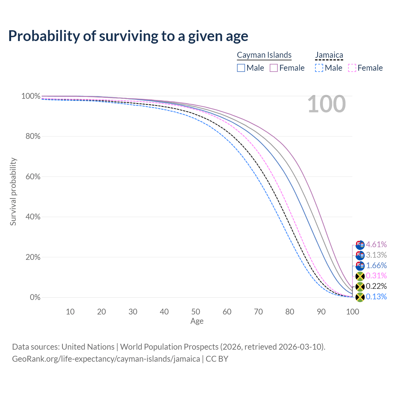 This life expectancy calculator shows the odds of living to 100, 95, 90, and below based on current age for both males and females in the Cayman Islands and Jamaica, along with mean and median age of death. The calculations are based on the 2026 life tables (actuarial tables) from the UN World Population Prospects.