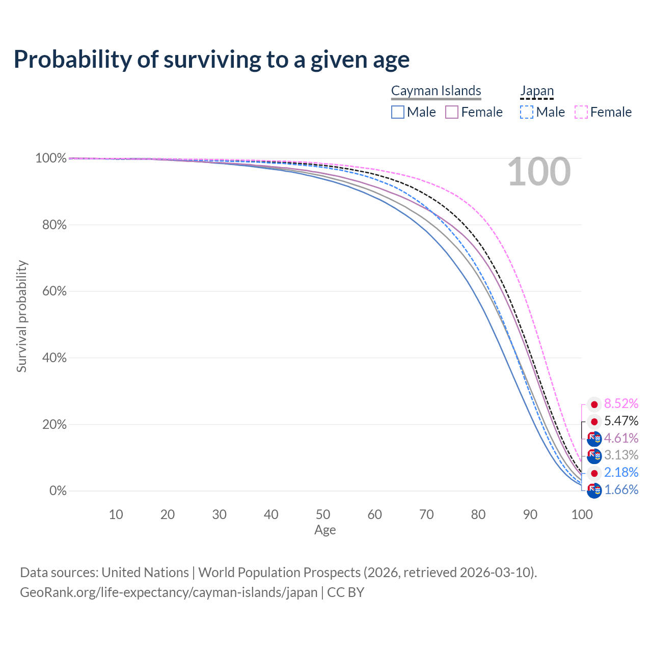 This life expectancy calculator shows the odds of living to 100, 95, 90, and below based on current age for both males and females in the Cayman Islands and Japan, along with mean and median age of death. The calculations are based on the 2026 life tables (actuarial tables) from the UN World Population Prospects.