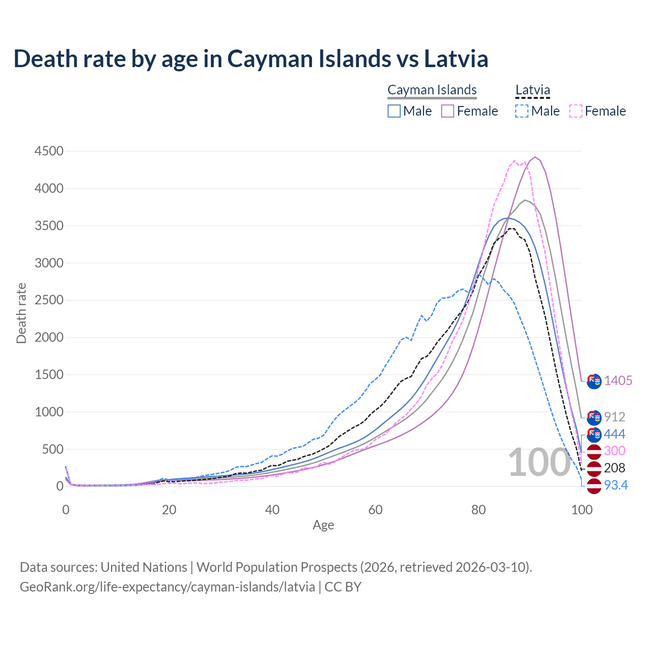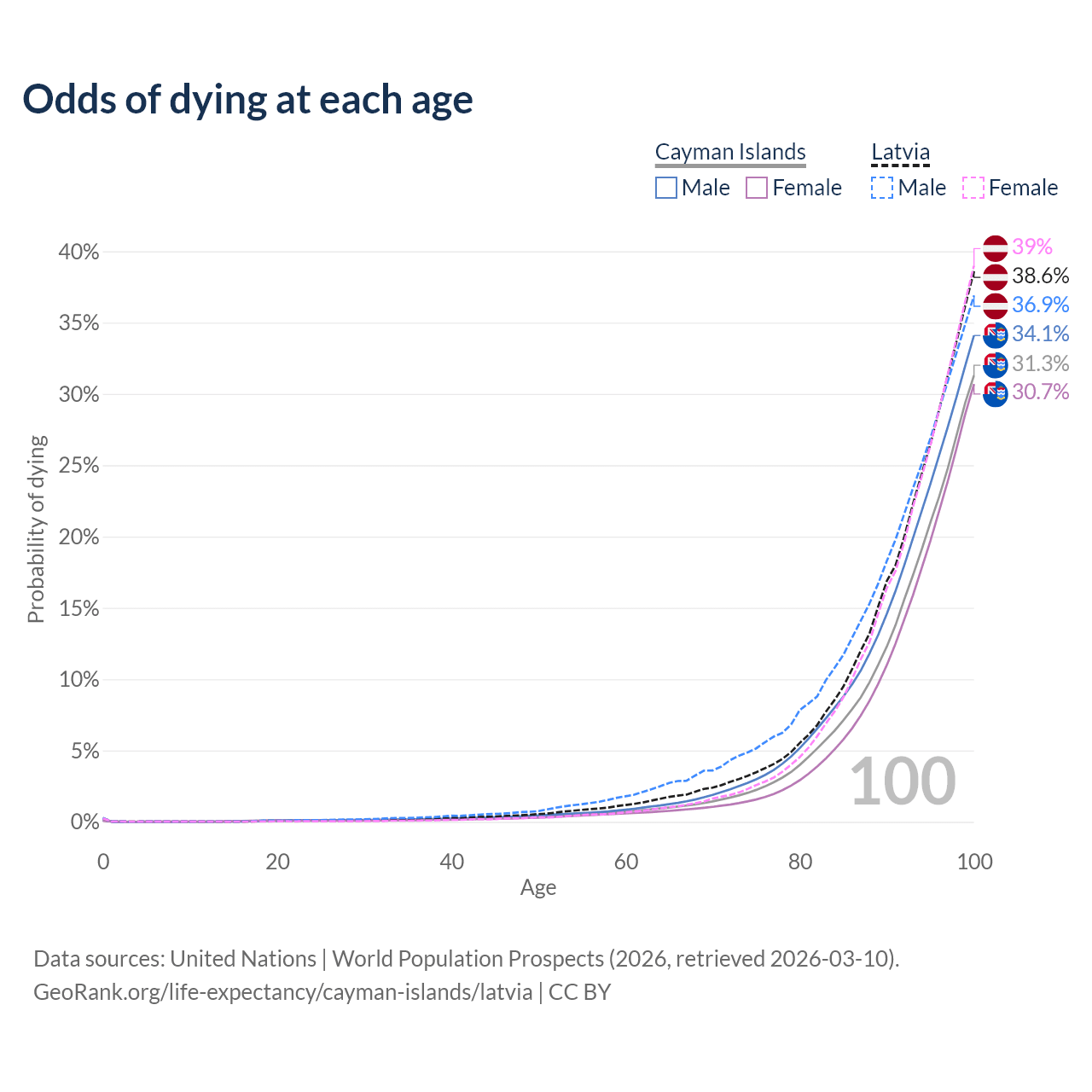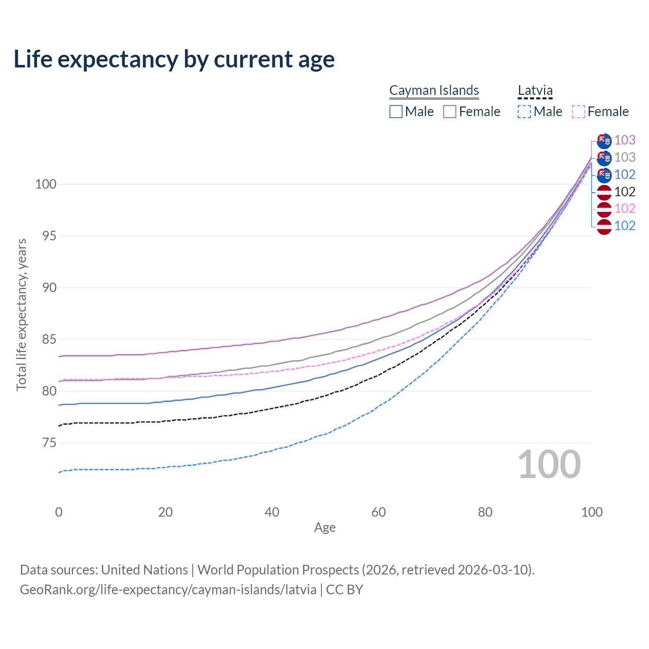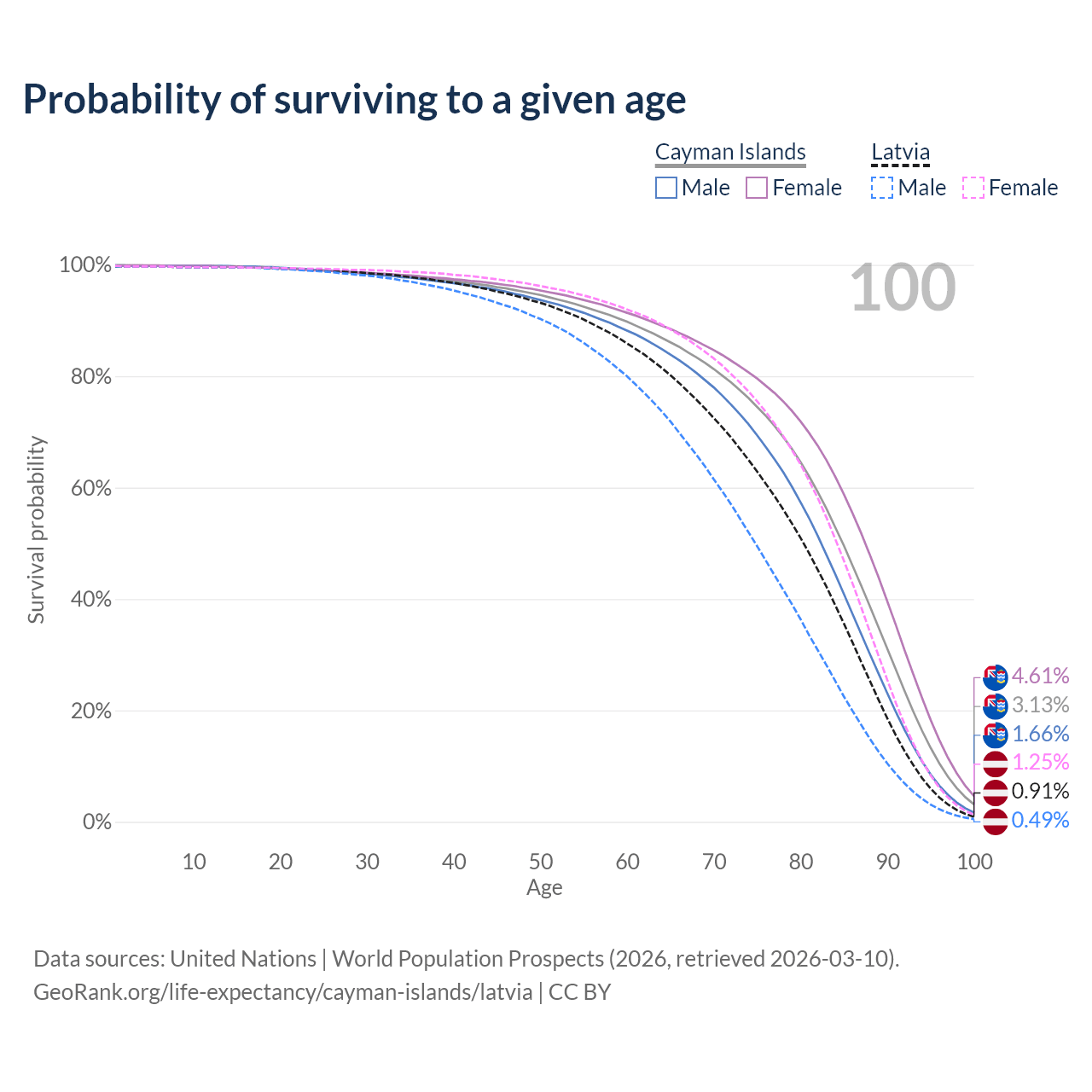 This life expectancy calculator shows the odds of living to 100, 95, 90, and below based on current age for both males and females in the Cayman Islands and Latvia, along with mean and median age of death. The calculations are based on the 2026 life tables (actuarial tables) from the UN World Population Prospects.
