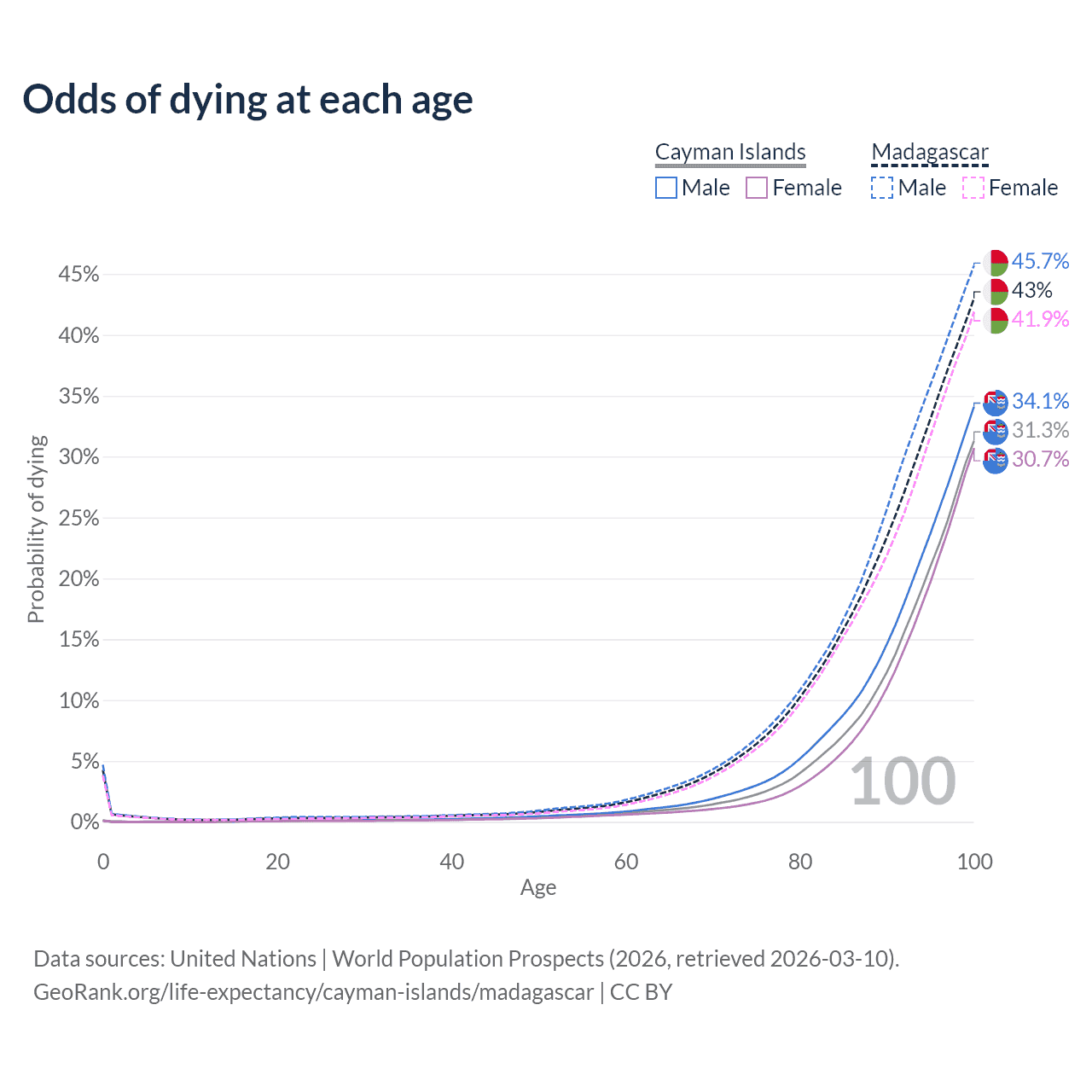 This life expectancy calculator shows the odds of living to 100, 95, 90, and below based on current age for both males and females in the Cayman Islands and Madagascar, along with mean and median age of death. The calculations are based on the 2026 life tables (actuarial tables) from the UN World Population Prospects.