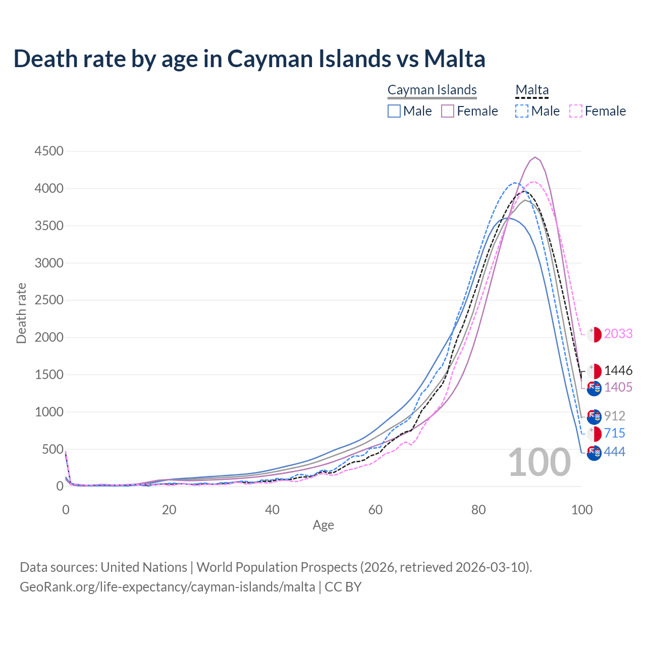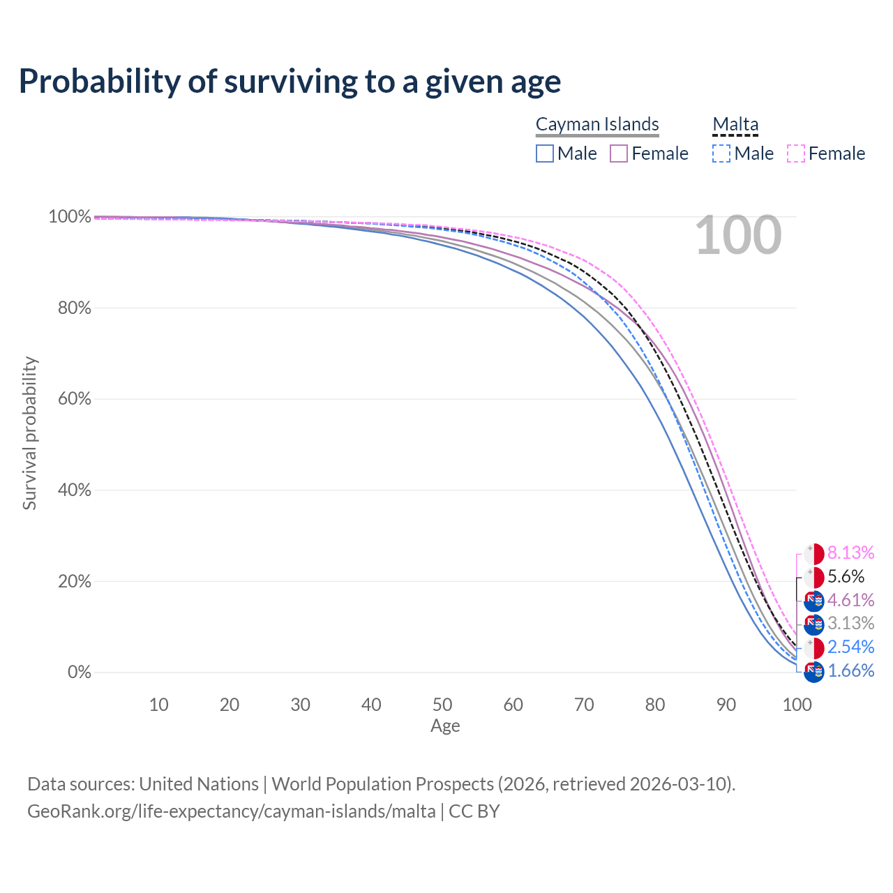 This life expectancy calculator shows the odds of living to 100, 95, 90, and below based on current age for both males and females in the Cayman Islands and Malta, along with mean and median age of death. The calculations are based on the 2026 life tables (actuarial tables) from the UN World Population Prospects.