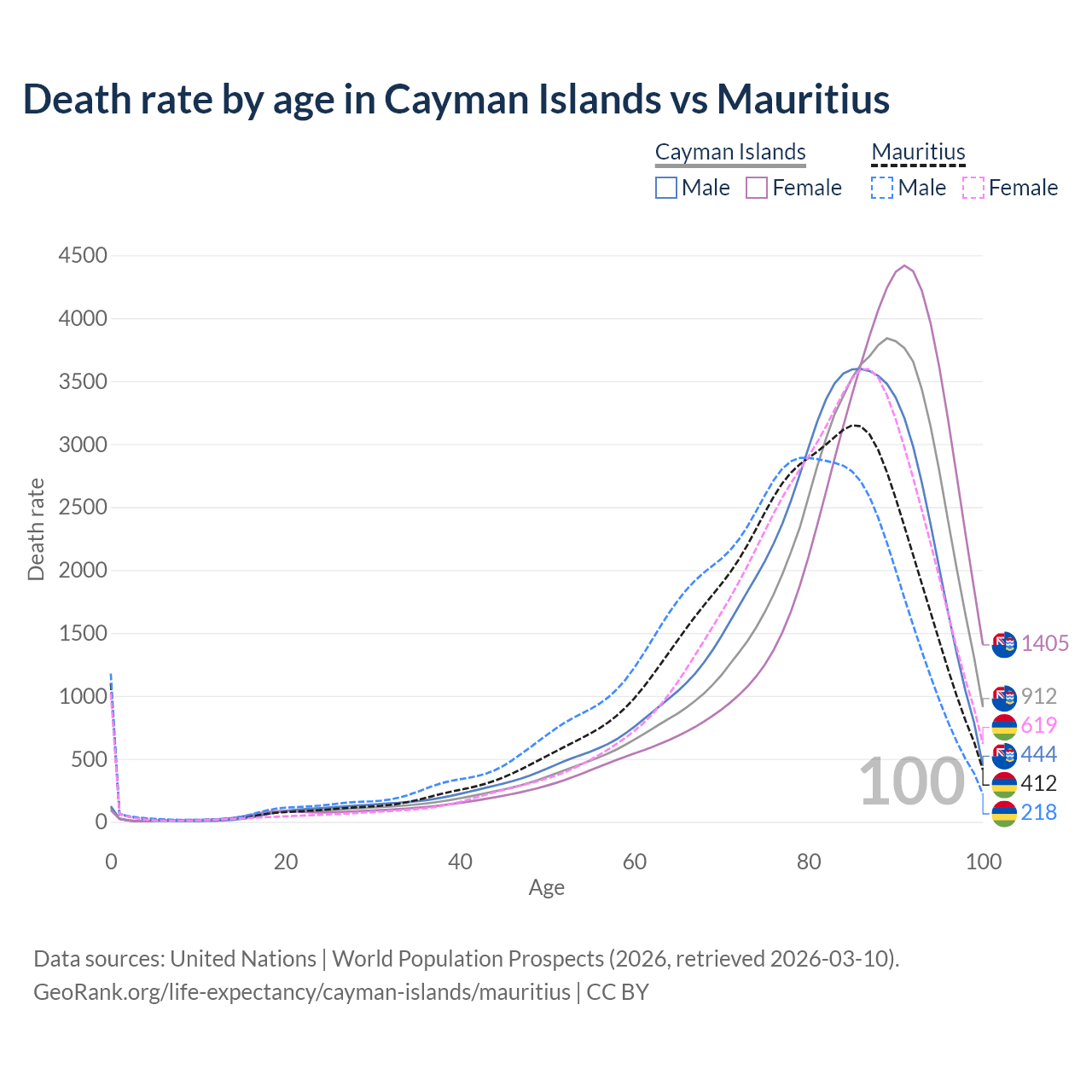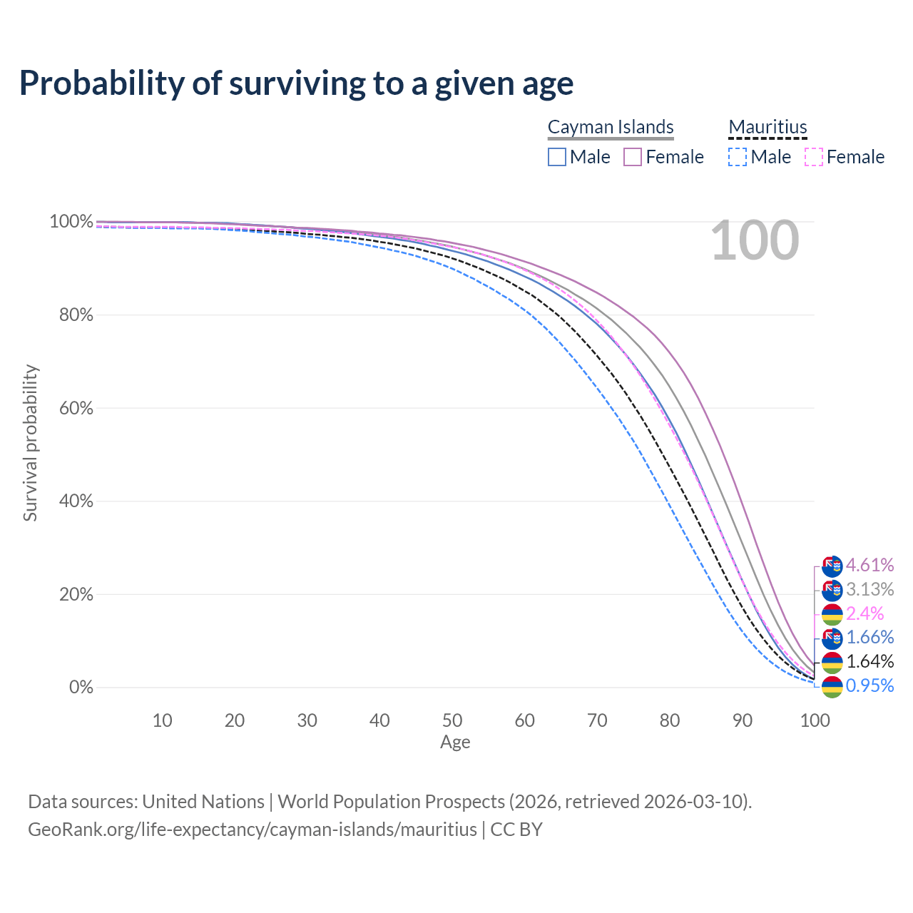 This life expectancy calculator shows the odds of living to 100, 95, 90, and below based on current age for both males and females in the Cayman Islands and Mauritius, along with mean and median age of death. The calculations are based on the 2026 life tables (actuarial tables) from the UN World Population Prospects.