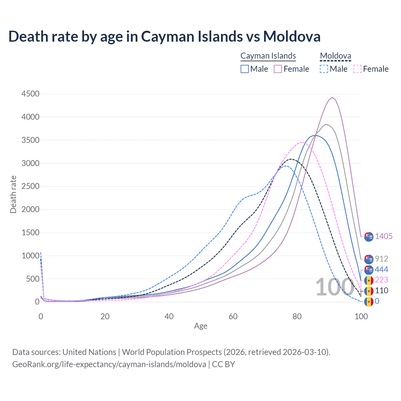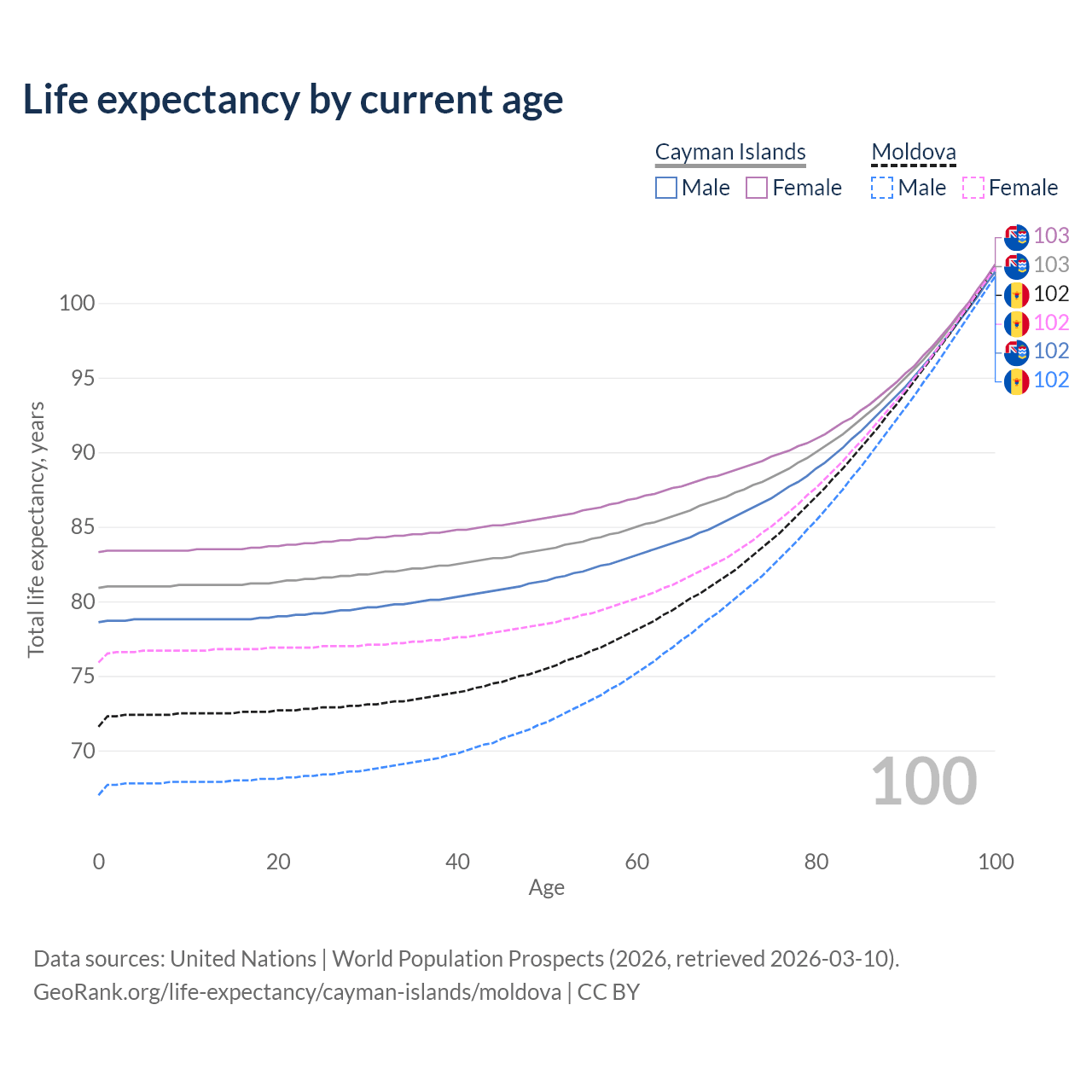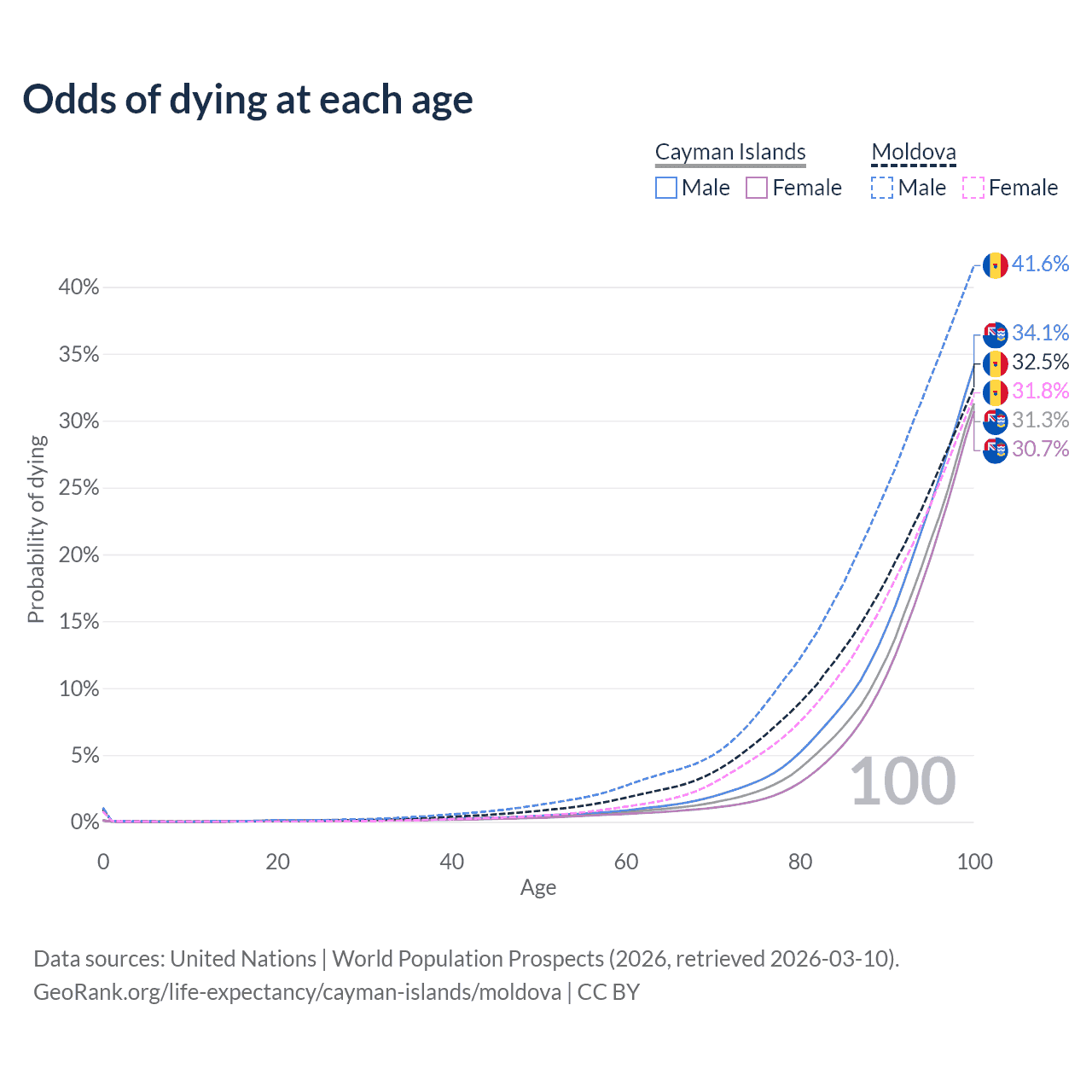 This life expectancy calculator shows the odds of living to 100, 95, 90, and below based on current age for both males and females in the Cayman Islands and Moldova, along with mean and median age of death. The calculations are based on the 2026 life tables (actuarial tables) from the UN World Population Prospects.
