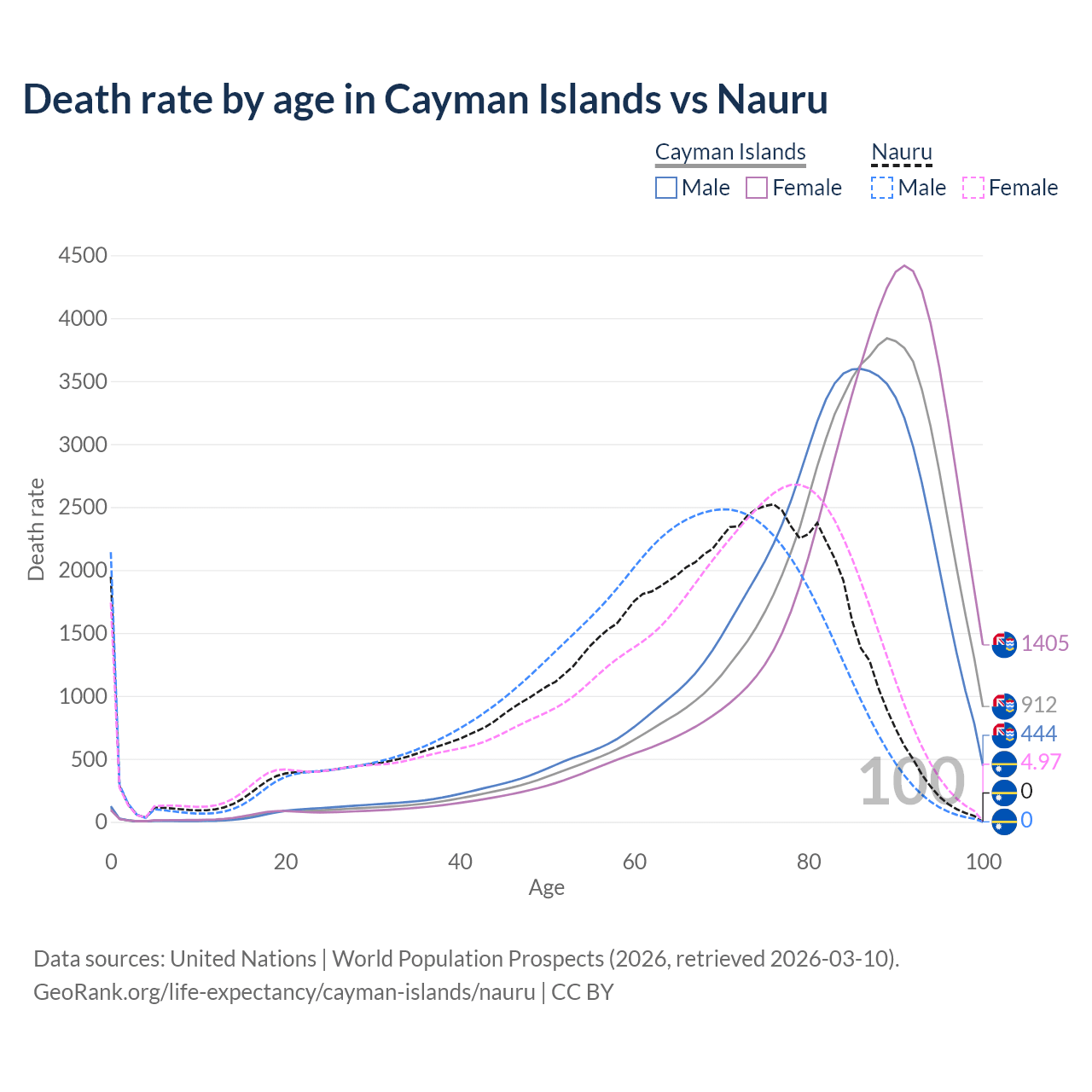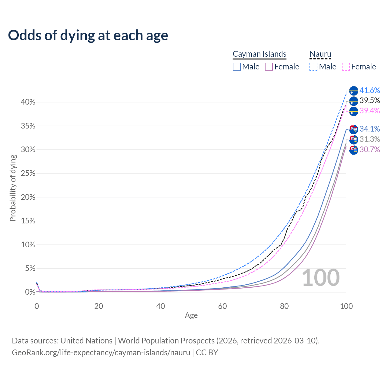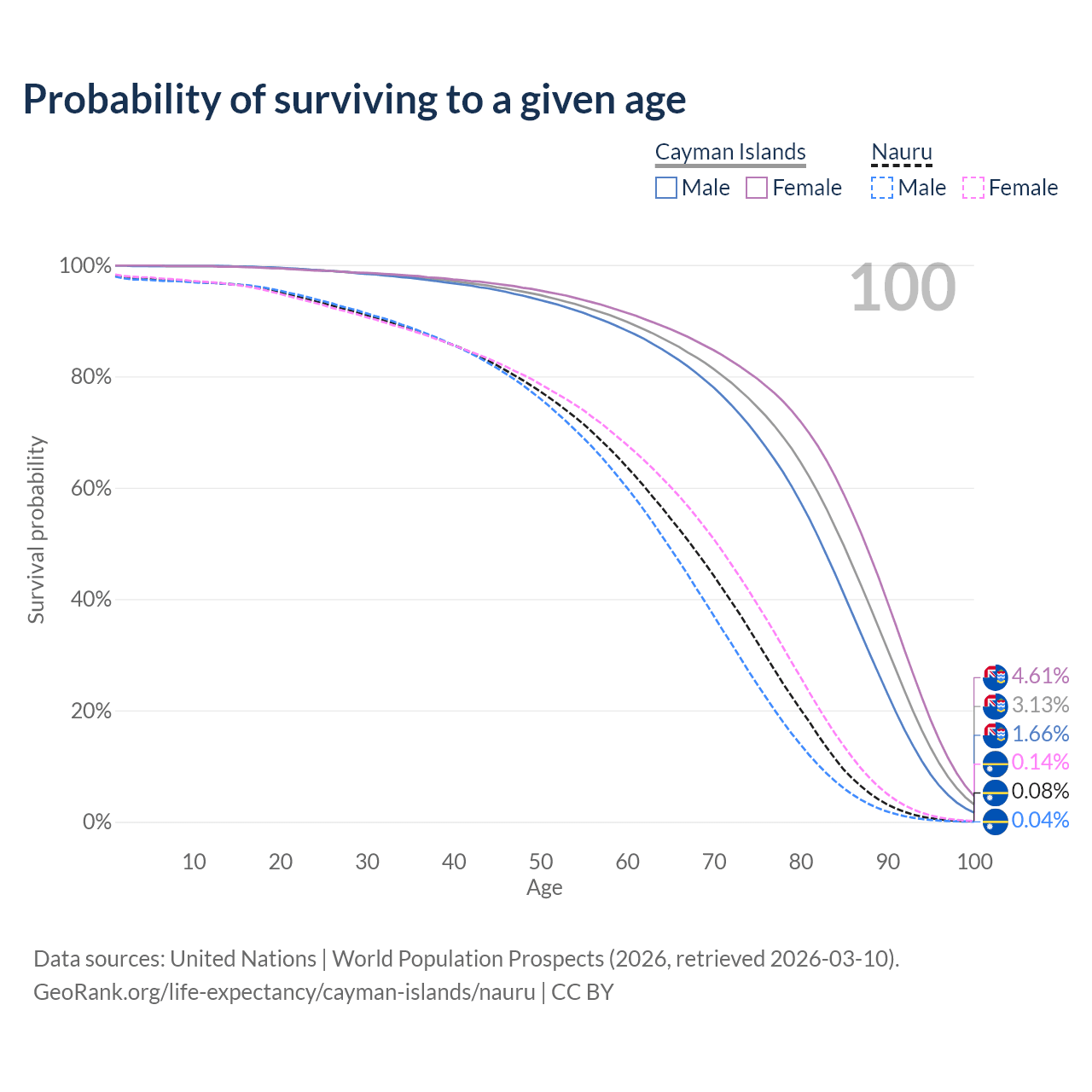 This life expectancy calculator shows the odds of living to 100, 95, 90, and below based on current age for both males and females in the Cayman Islands and Nauru, along with mean and median age of death. The calculations are based on the 2026 life tables (actuarial tables) from the UN World Population Prospects.