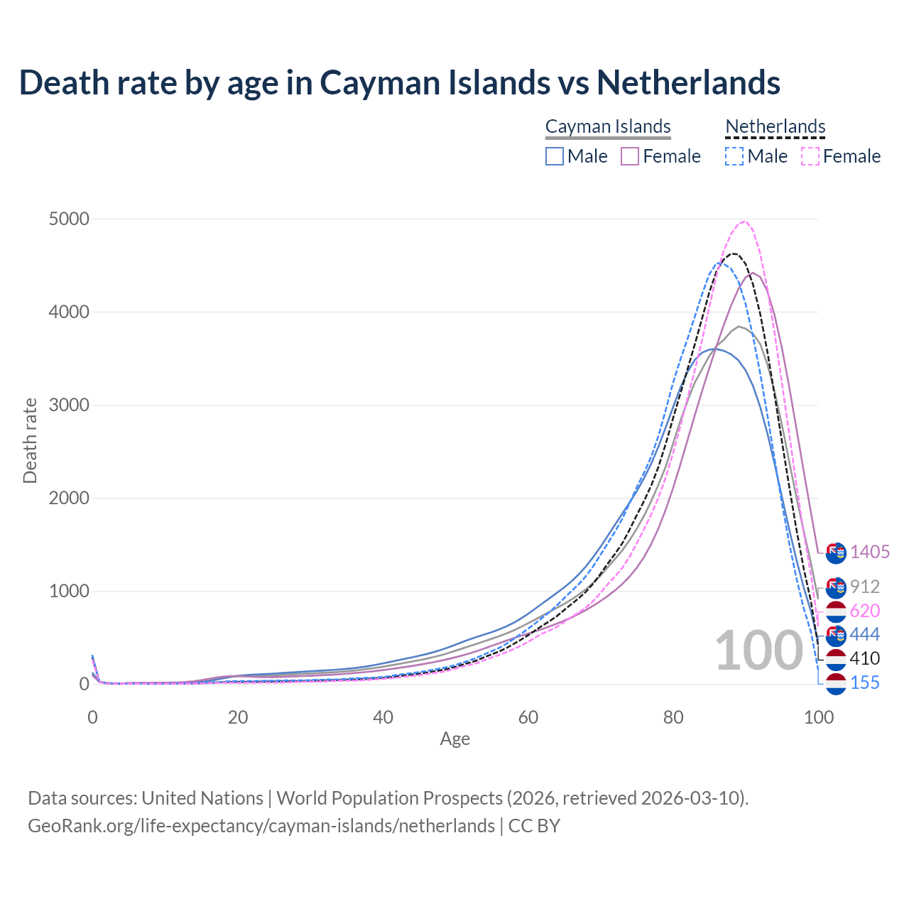 In the Cayman Islands, the most common age of death is 89, compared to 88 in the Netherlands. The median age of death is 84.9 in the Cayman Islands and 85.5 in the Netherlands, meaning only half of each cohort is expected to live past that age.