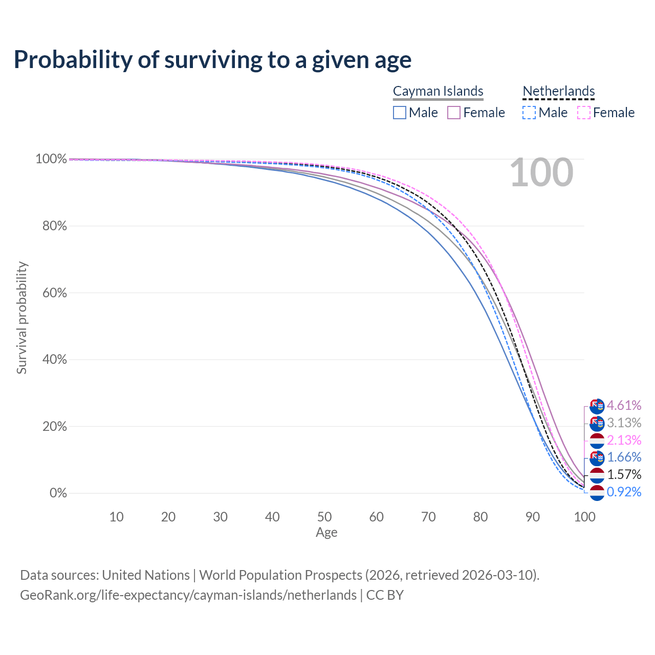 This life expectancy calculator shows the odds of living to 100, 95, 90, and below based on current age for both males and females in the Cayman Islands and the Netherlands, along with mean and median age of death. The calculations are based on the 2026 life tables (actuarial tables) from the UN World Population Prospects.