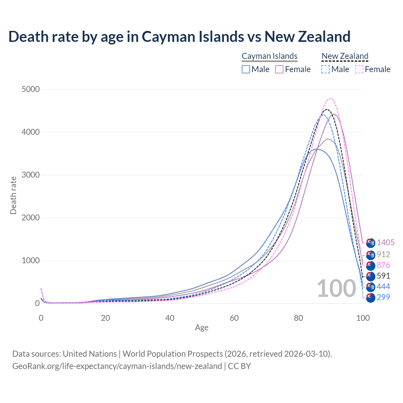 In the Cayman Islands, the most common age of death is 89, compared to 89 in New Zealand. The median age of death is 84.9 in the Cayman Islands and 85.8 in New Zealand, meaning only half of each cohort is expected to live past that age.