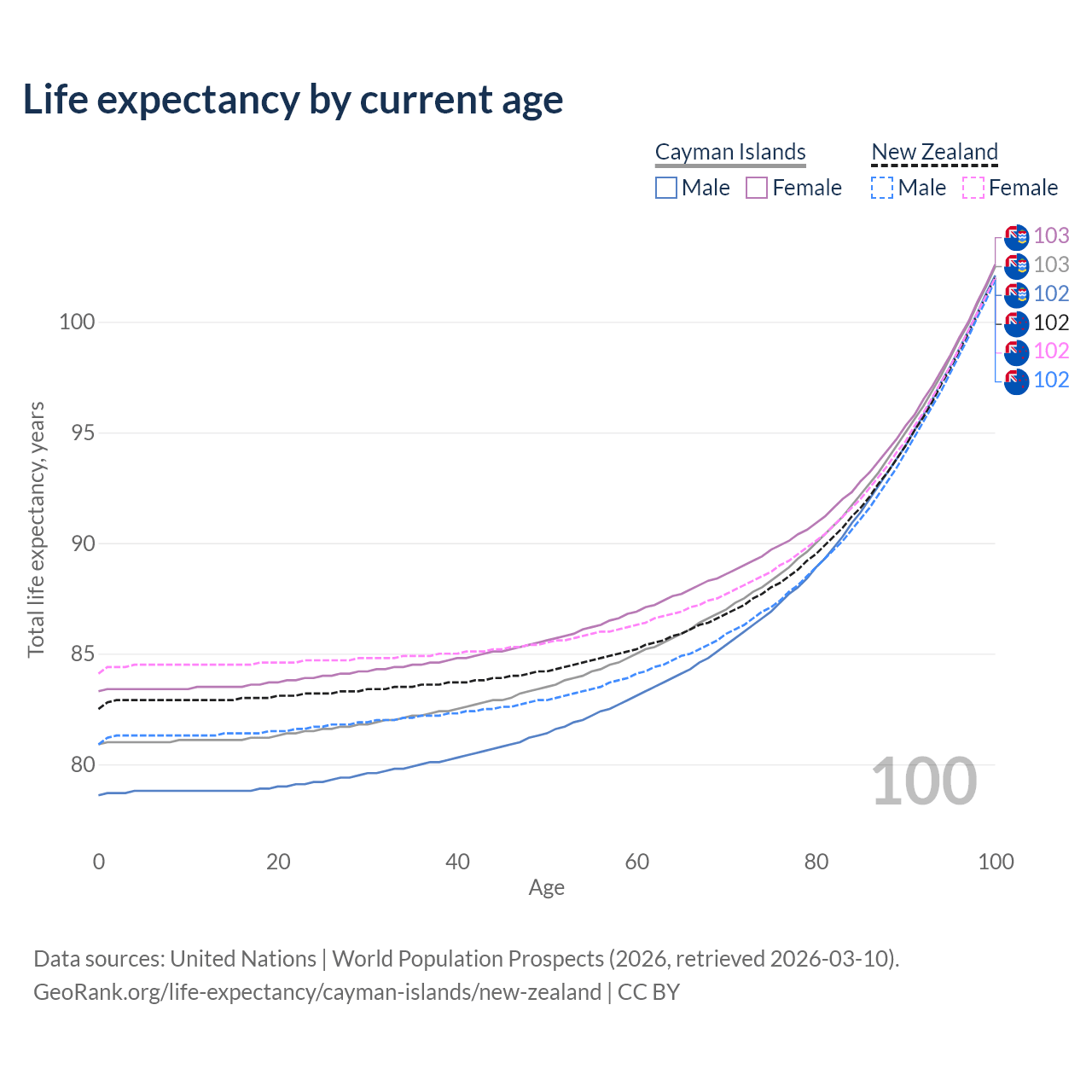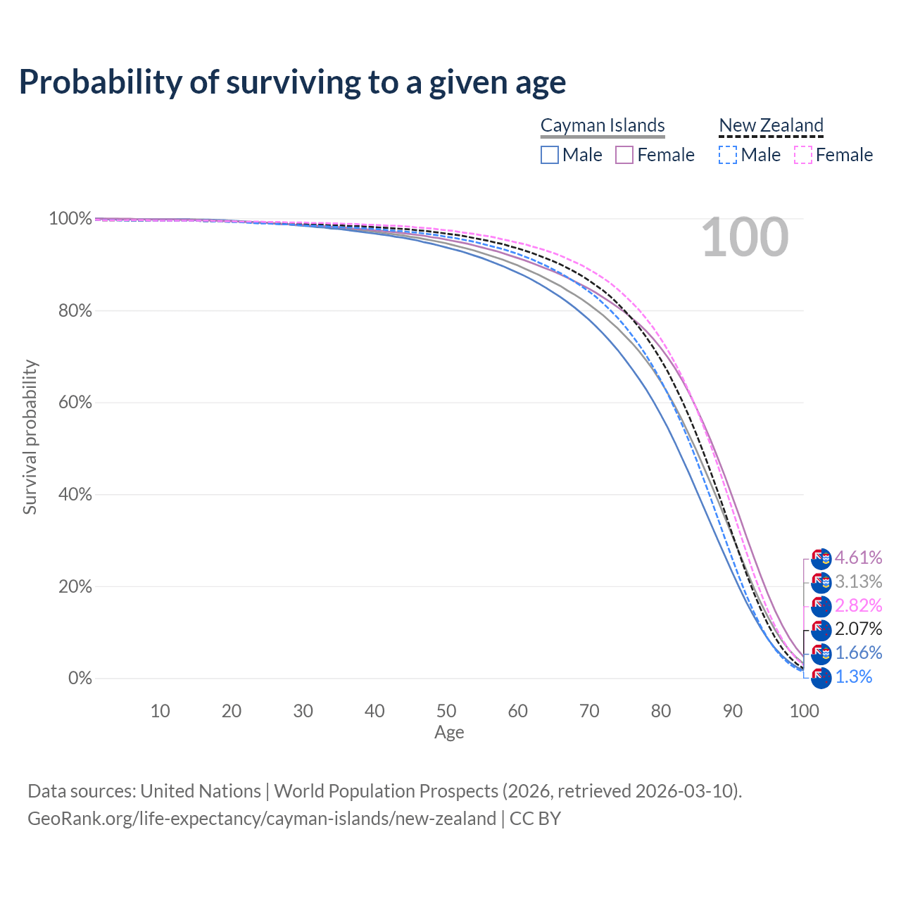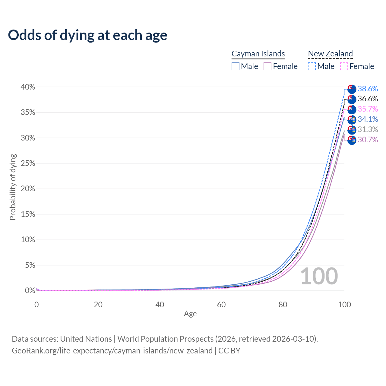 This life expectancy calculator shows the odds of living to 100, 95, 90, and below based on current age for both males and females in the Cayman Islands and New Zealand, along with mean and median age of death. The calculations are based on the 2026 life tables (actuarial tables) from the UN World Population Prospects.
