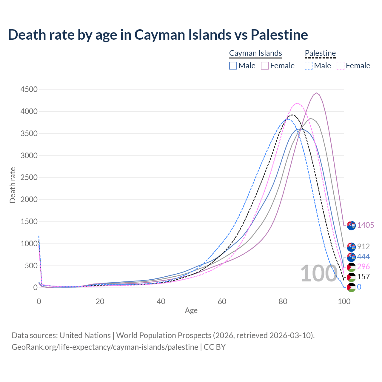 In the Cayman Islands, the most common age of death is 89, compared to 83 in Palestine. The median age of death is 84.9 in the Cayman Islands and 80.5 in Palestine, meaning only half of each cohort is expected to live past that age.