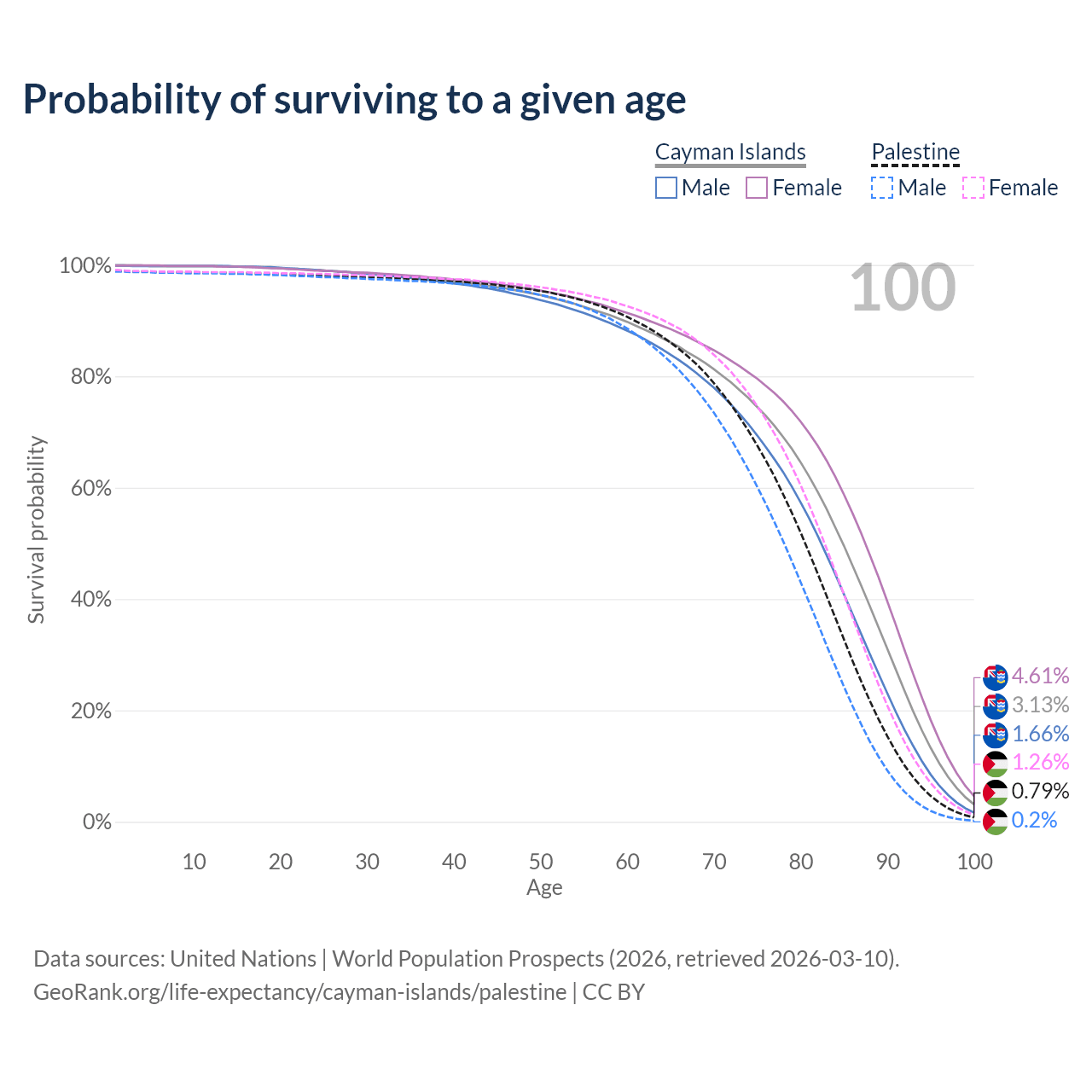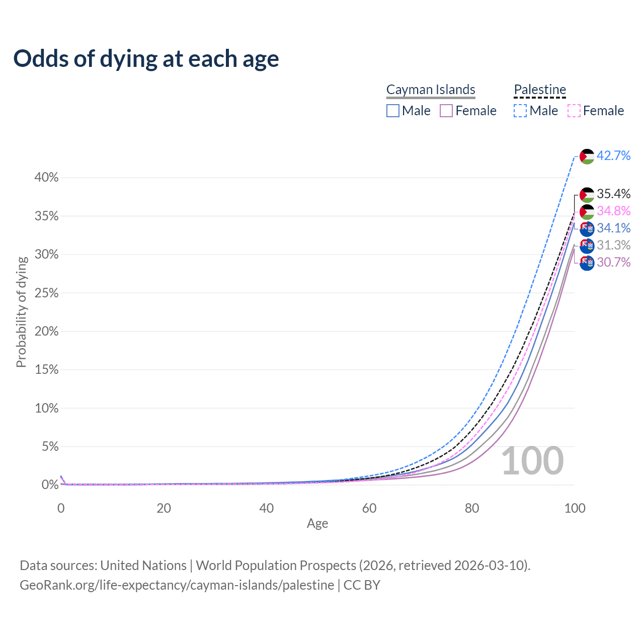 This life expectancy calculator shows the odds of living to 100, 95, 90, and below based on current age for both males and females in the Cayman Islands and Palestine, along with mean and median age of death. The calculations are based on the 2026 life tables (actuarial tables) from the UN World Population Prospects.