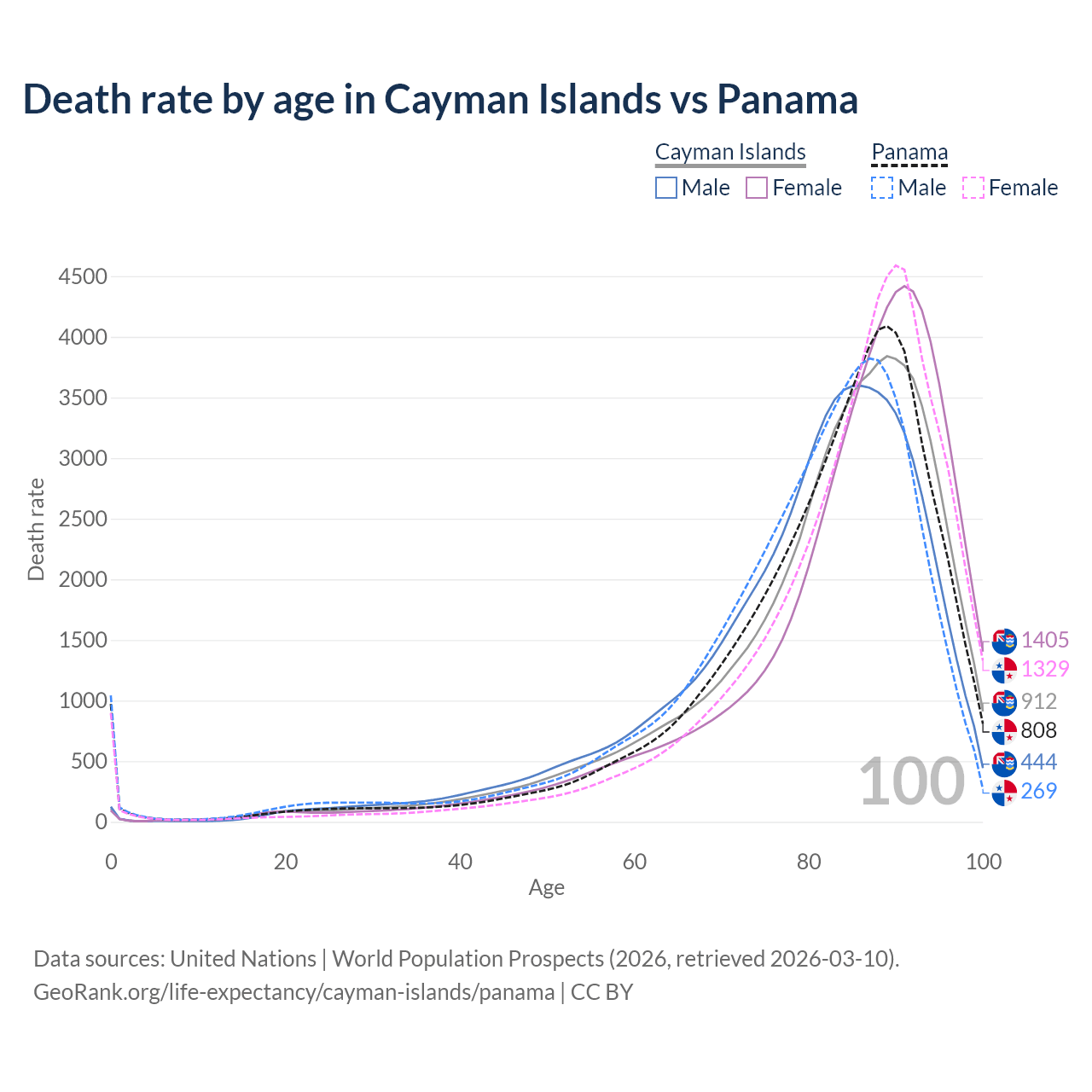 In the Cayman Islands, the most common age of death is 89, compared to 89 in Panama. The median age of death is 84.9 in the Cayman Islands and 84.6 in Panama, meaning only half of each cohort is expected to live past that age.
