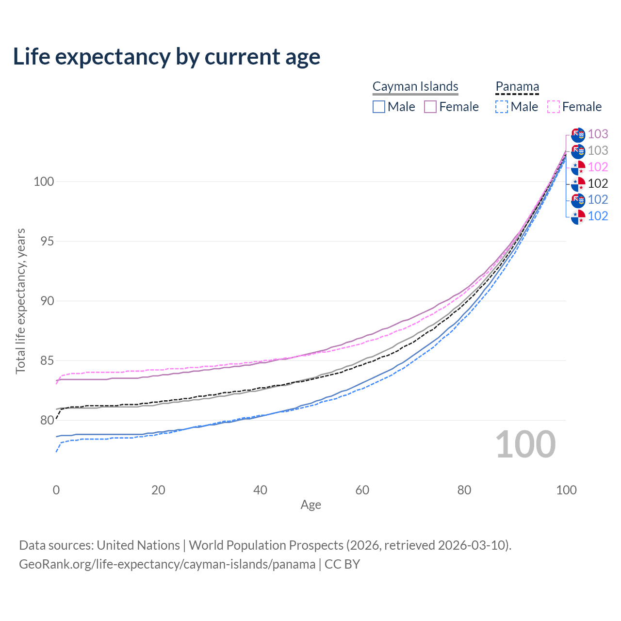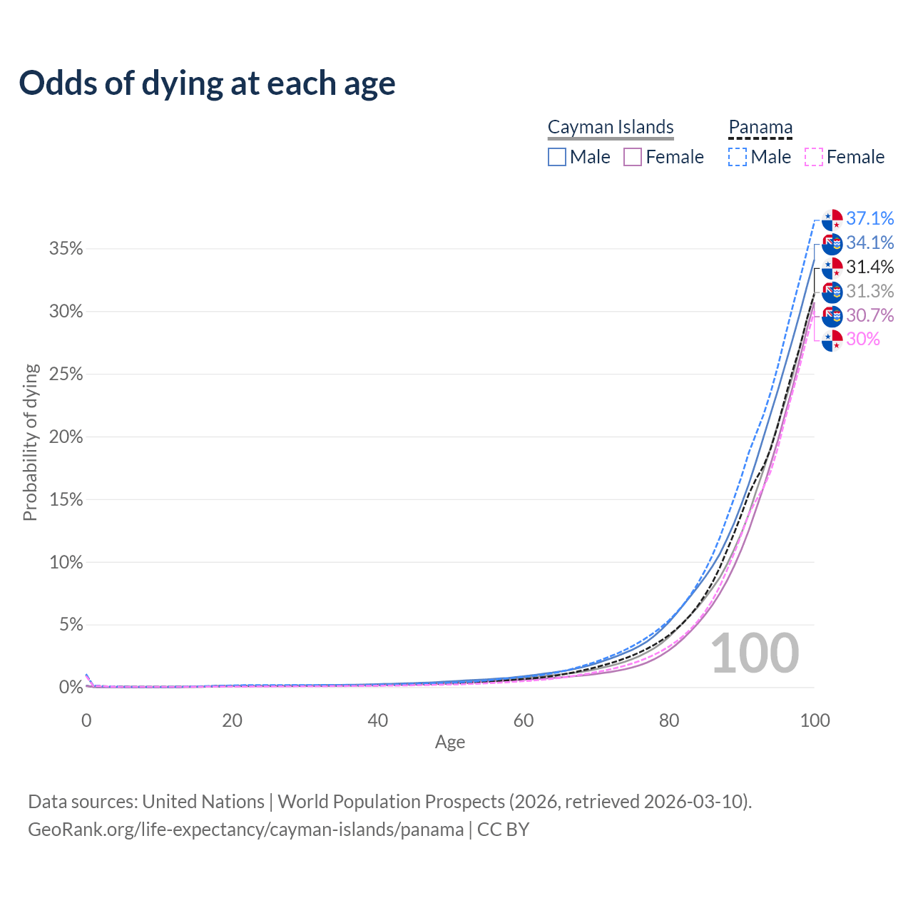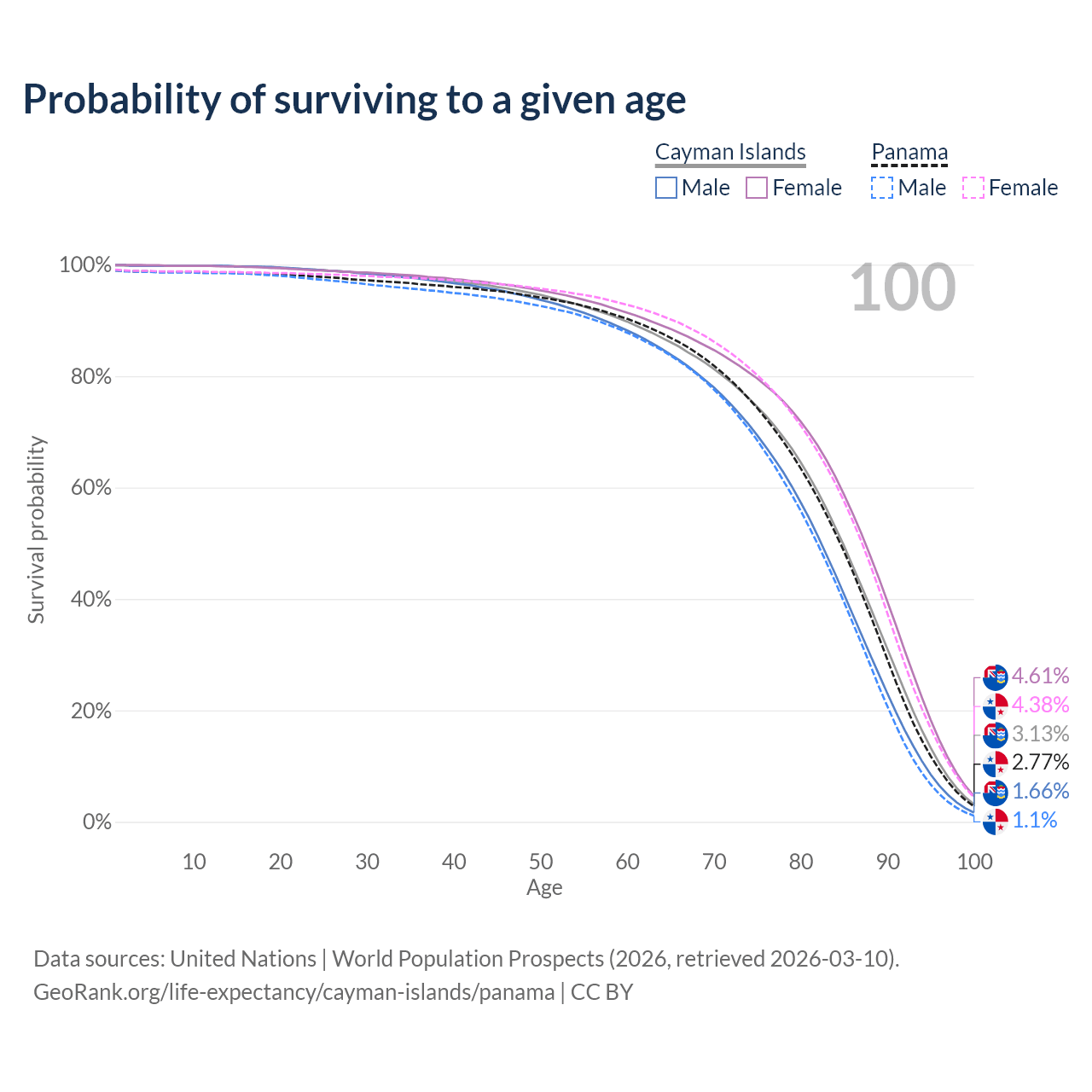 This life expectancy calculator shows the odds of living to 100, 95, 90, and below based on current age for both males and females in the Cayman Islands and Panama, along with mean and median age of death. The calculations are based on the 2026 life tables (actuarial tables) from the UN World Population Prospects.