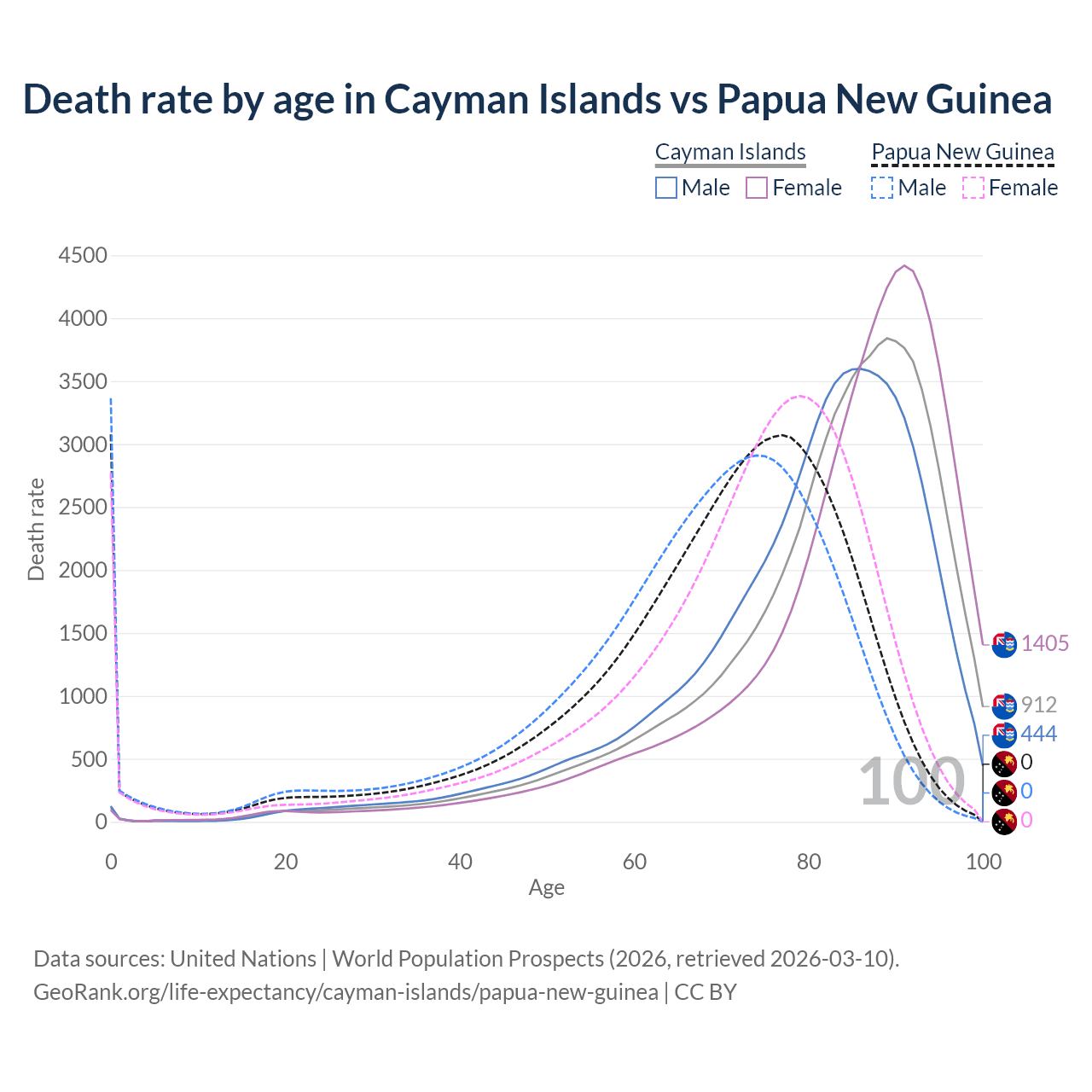In the Cayman Islands, the most common age of death is 89, compared to 0 in Papua New Guinea. The median age of death is 84.9 in the Cayman Islands and 71.7 in Papua New Guinea, meaning only half of each cohort is expected to live past that age.