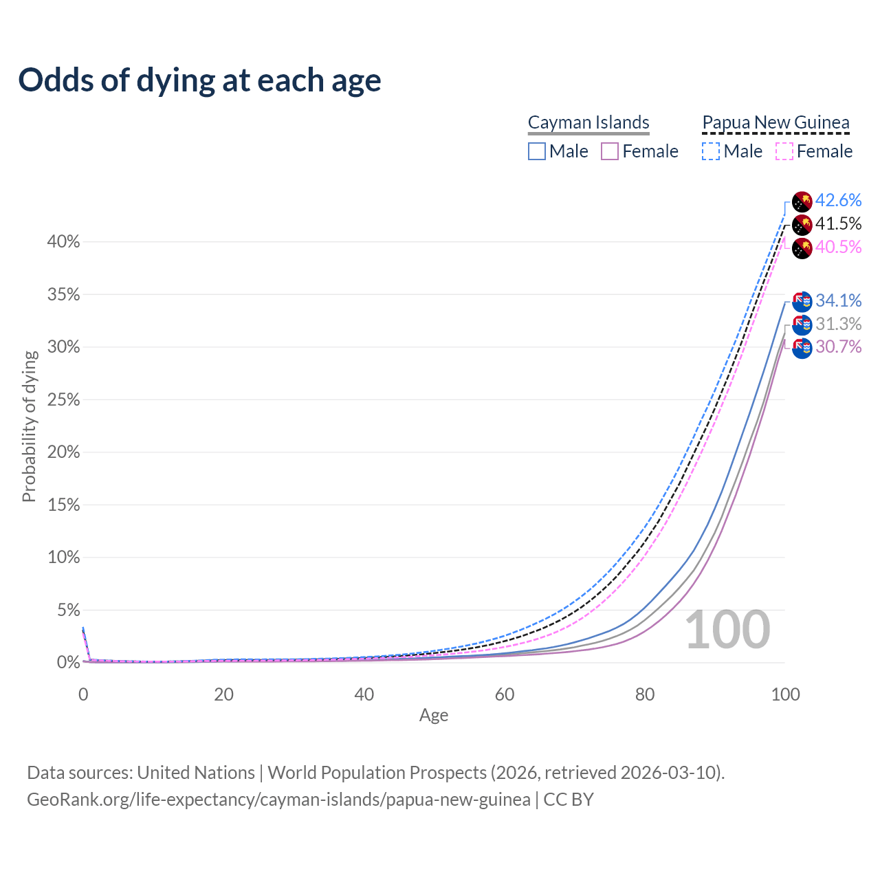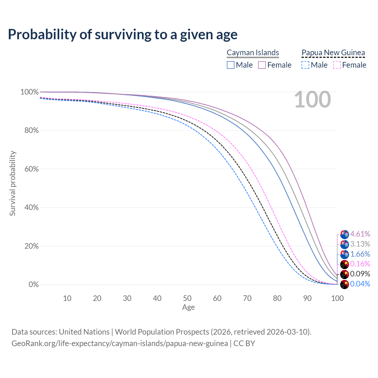 This life expectancy calculator shows the odds of living to 100, 95, 90, and below based on current age for both males and females in the Cayman Islands and Papua New Guinea, along with mean and median age of death. The calculations are based on the 2026 life tables (actuarial tables) from the UN World Population Prospects.