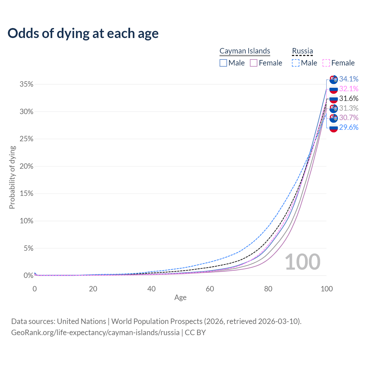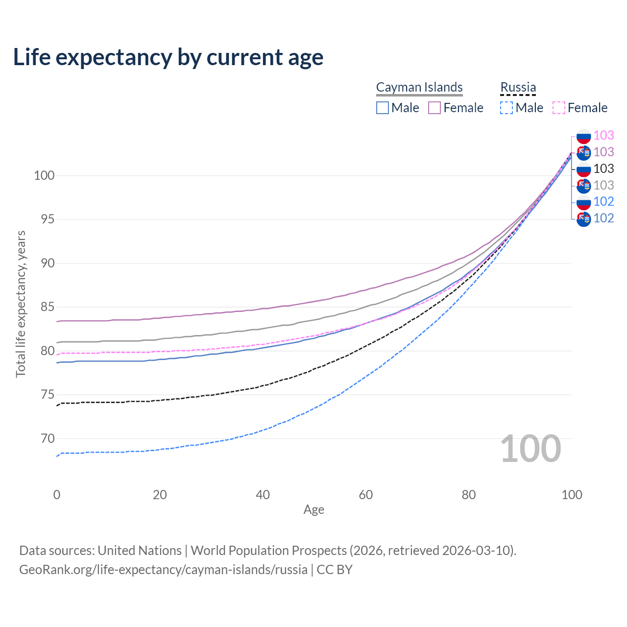 This life expectancy calculator shows the odds of living to 100, 95, 90, and below based on current age for both males and females in the Cayman Islands and Russia, along with mean and median age of death. The calculations are based on the 2026 life tables (actuarial tables) from the UN World Population Prospects.