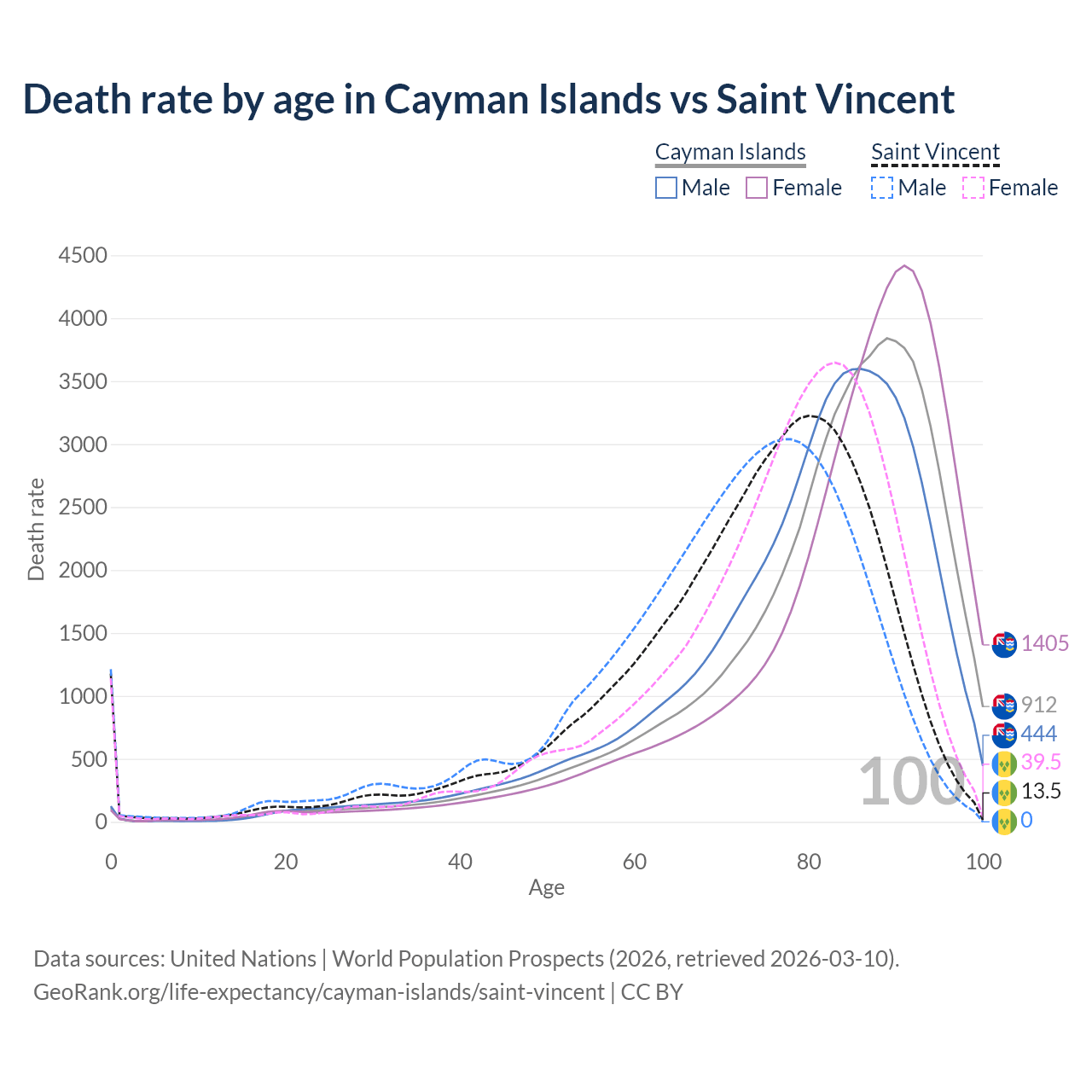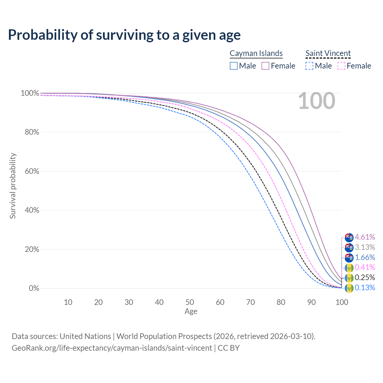 This life expectancy calculator shows the odds of living to 100, 95, 90, and below based on current age for both males and females in the Cayman Islands and Saint Vincent, along with mean and median age of death. The calculations are based on the 2026 life tables (actuarial tables) from the UN World Population Prospects.