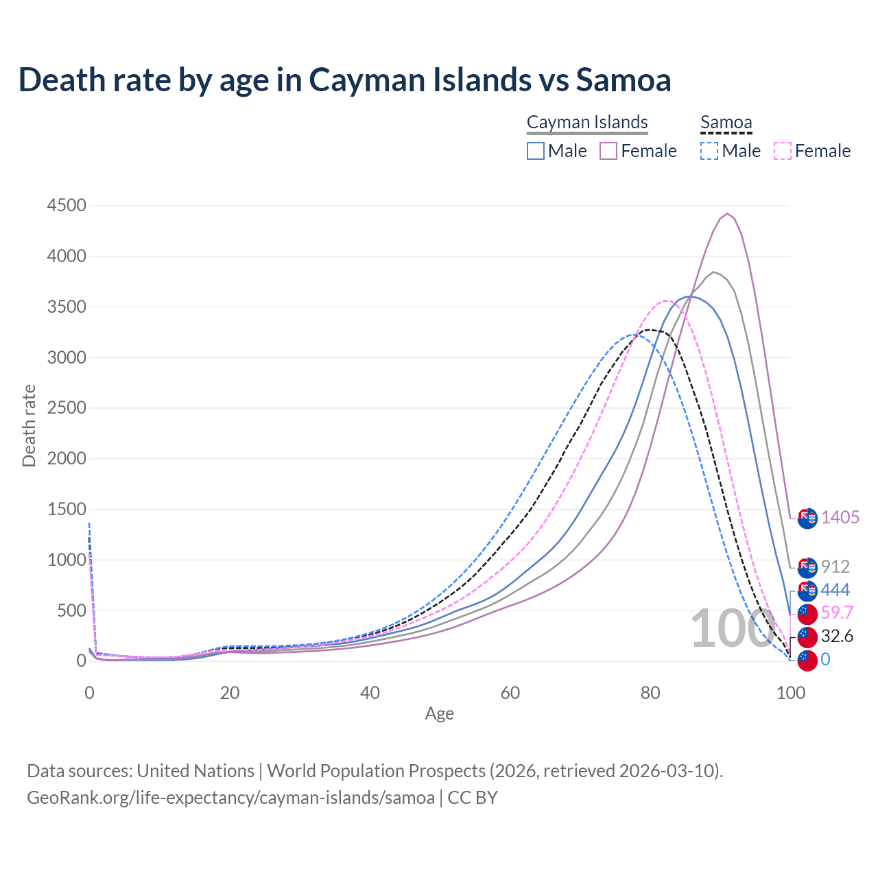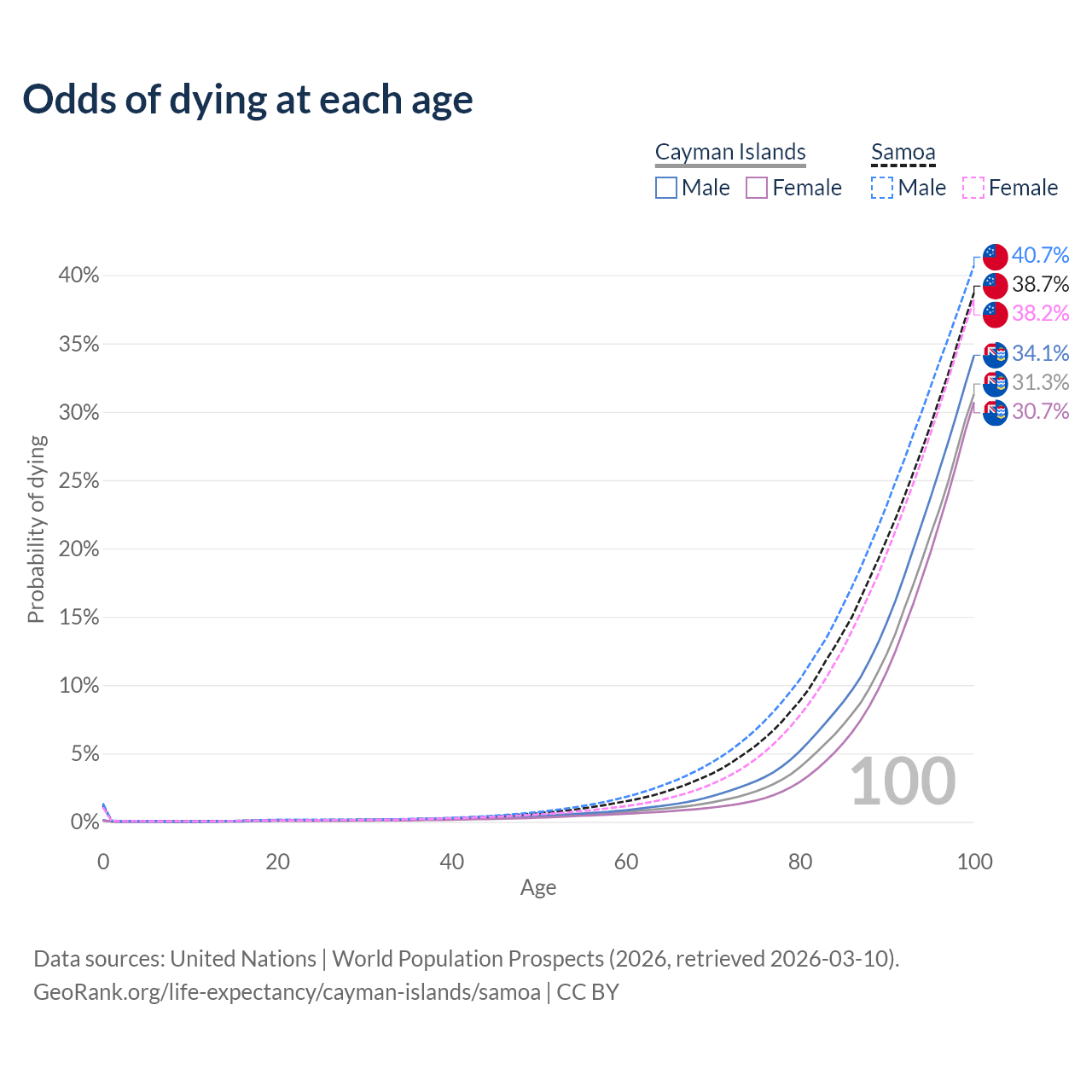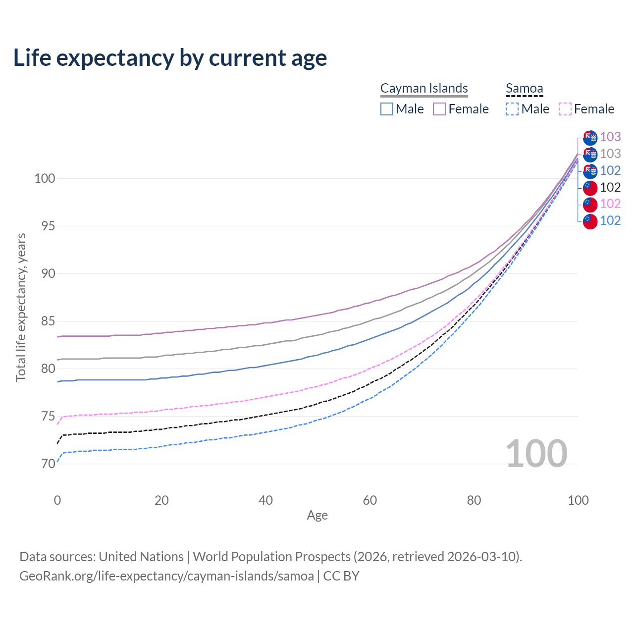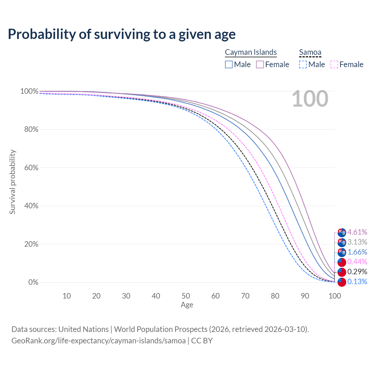This life expectancy calculator shows the odds of living to 100, 95, 90, and below based on current age for both males and females in the Cayman Islands and Samoa, along with mean and median age of death. The calculations are based on the 2026 life tables (actuarial tables) from the UN World Population Prospects.