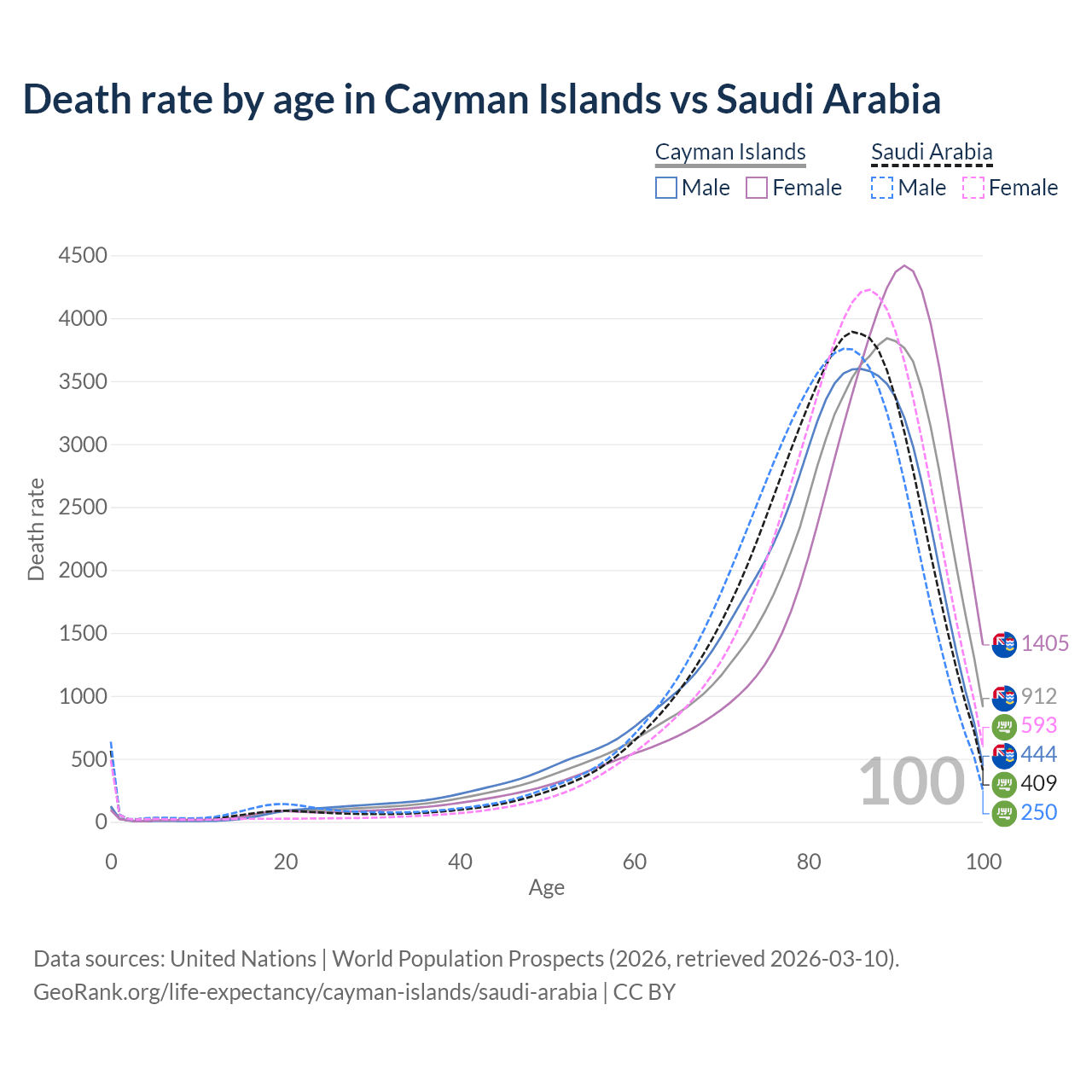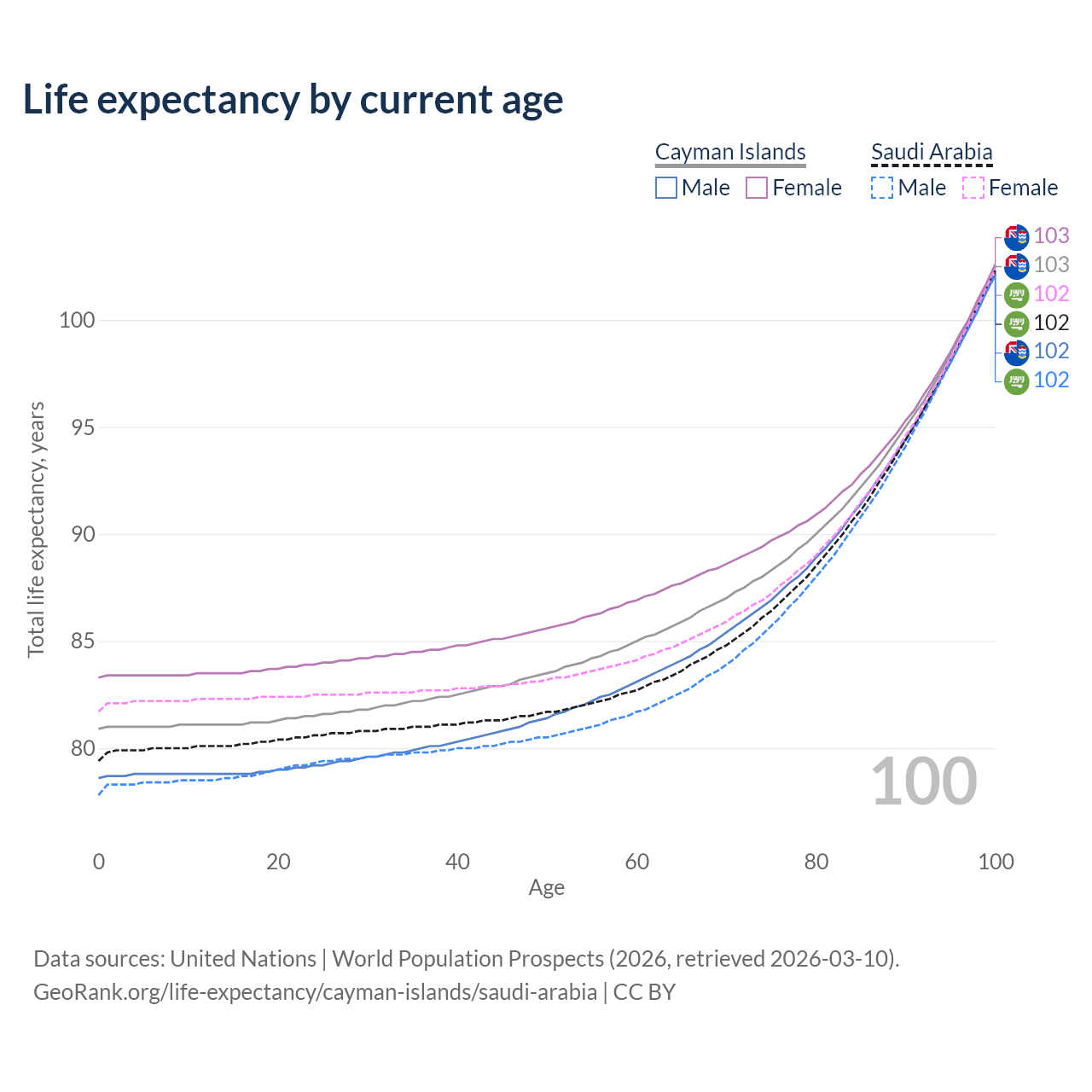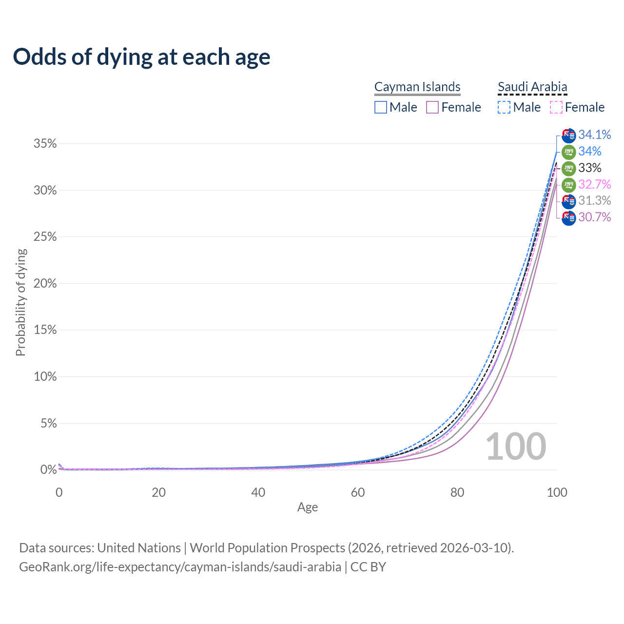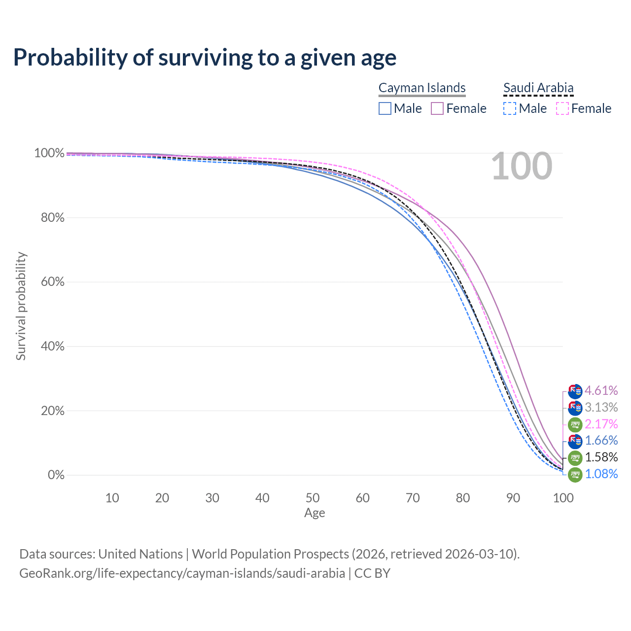 This life expectancy calculator shows the odds of living to 100, 95, 90, and below based on current age for both males and females in the Cayman Islands and Saudi Arabia, along with mean and median age of death. The calculations are based on the 2026 life tables (actuarial tables) from the UN World Population Prospects.