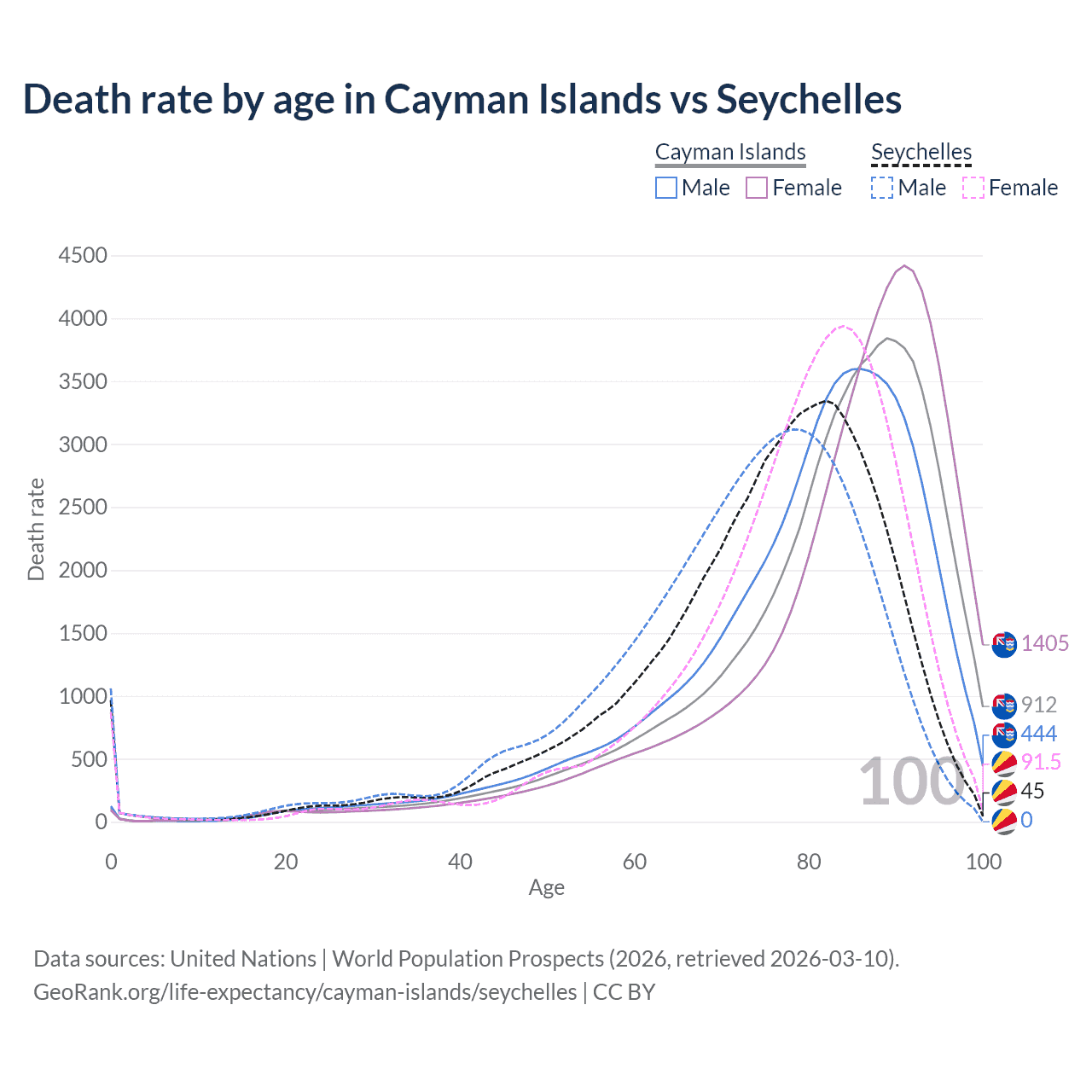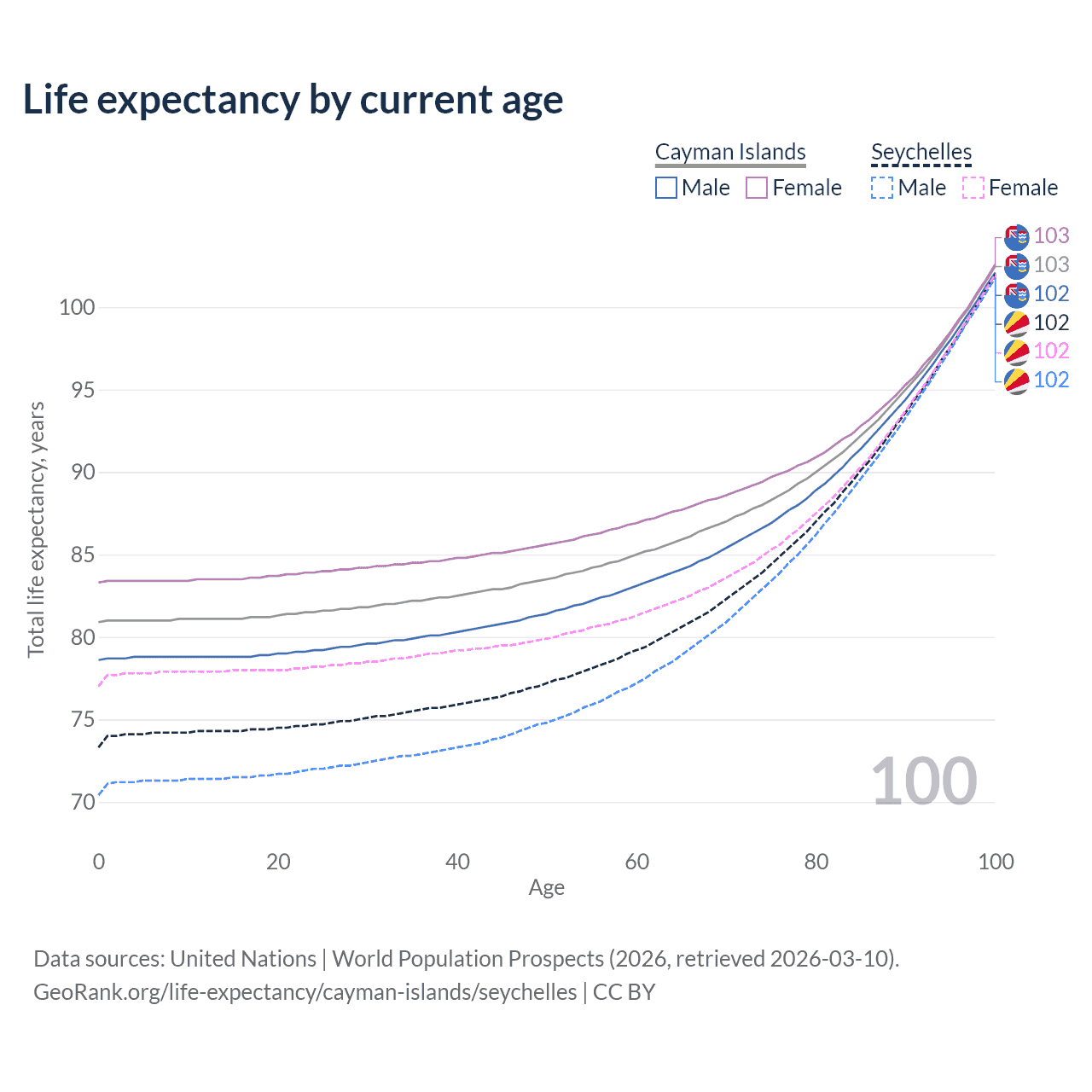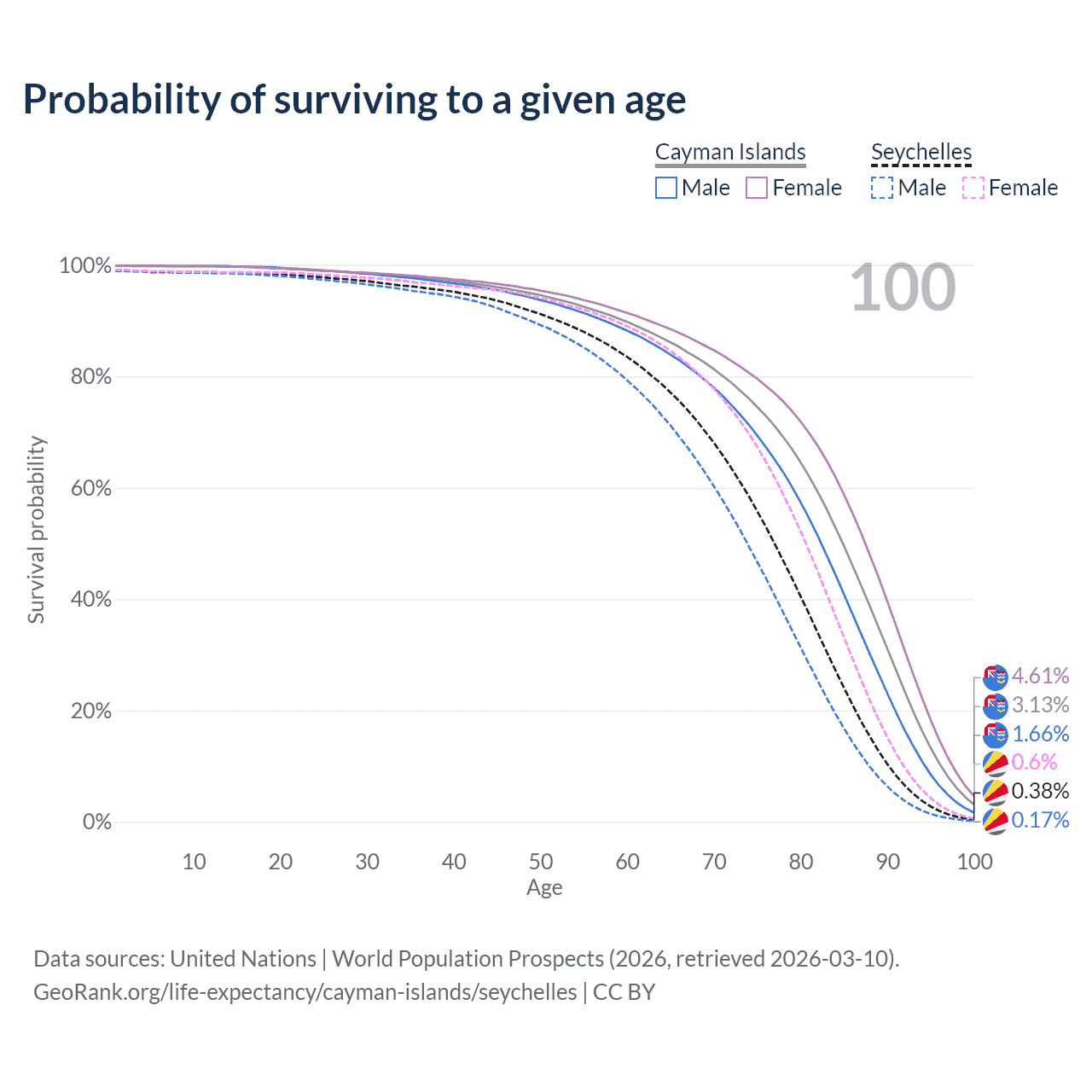 This life expectancy calculator shows the odds of living to 100, 95, 90, and below based on current age for both males and females in the Cayman Islands and the Seychelles, along with mean and median age of death. The calculations are based on the 2026 life tables (actuarial tables) from the UN World Population Prospects.