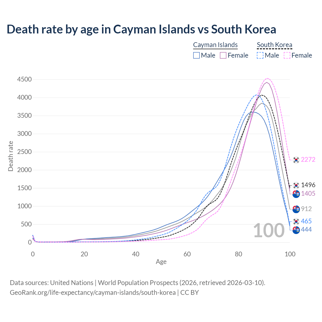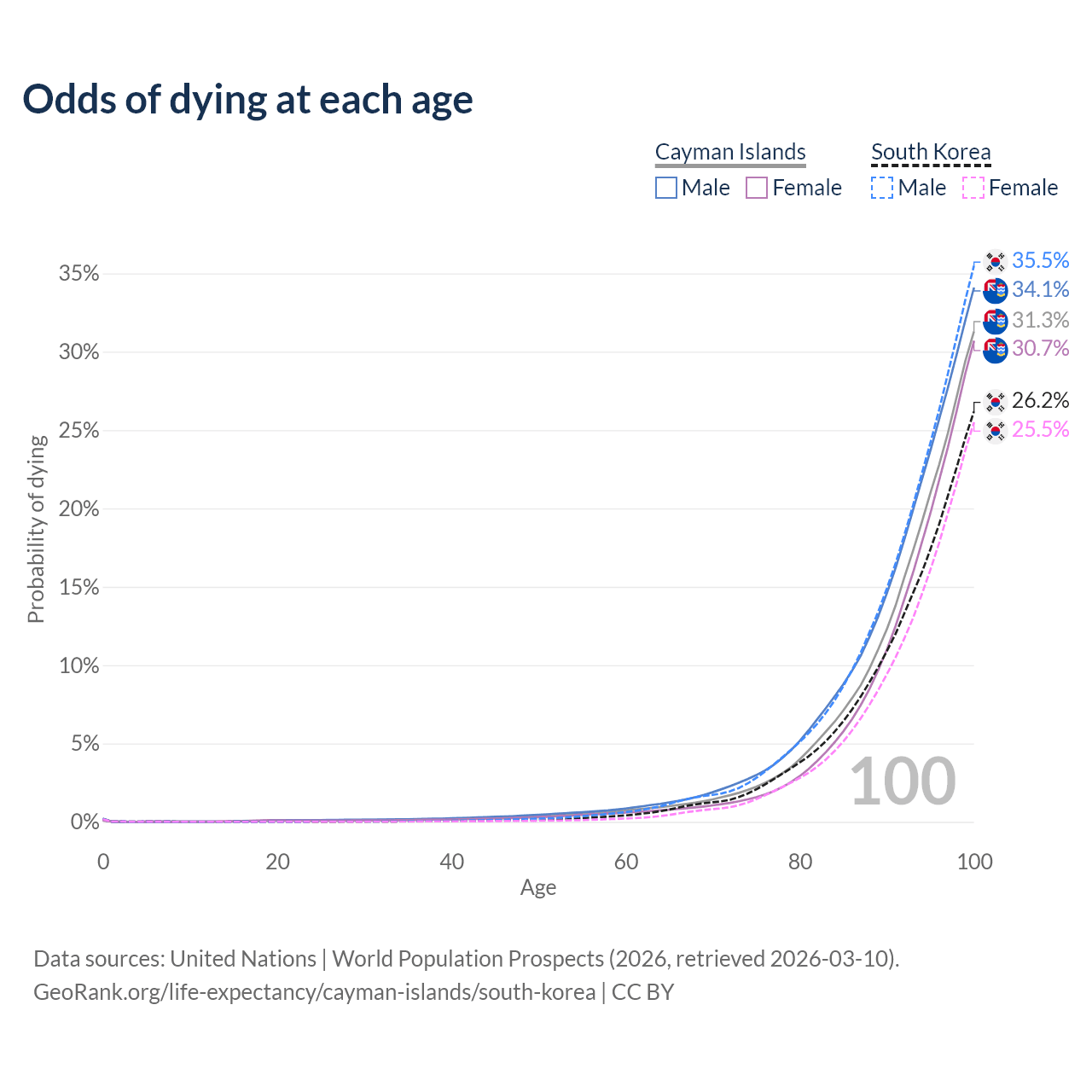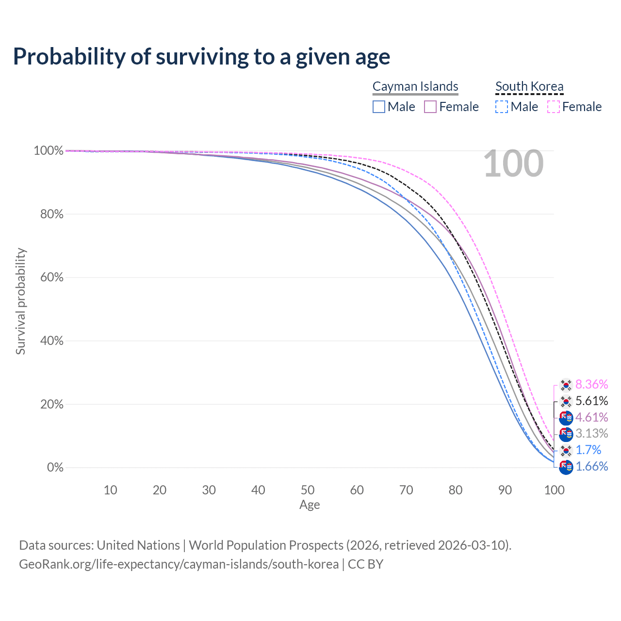 This life expectancy calculator shows the odds of living to 100, 95, 90, and below based on current age for both males and females in the Cayman Islands and South Korea, along with mean and median age of death. The calculations are based on the 2026 life tables (actuarial tables) from the UN World Population Prospects.