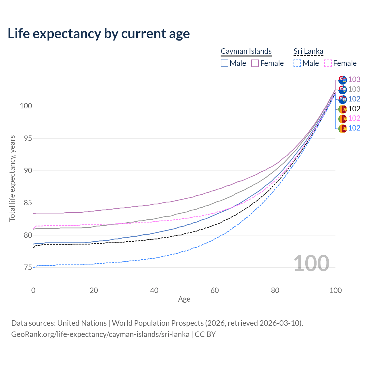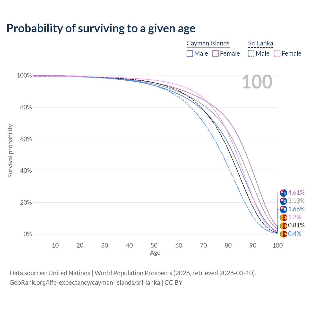This life expectancy calculator shows the odds of living to 100, 95, 90, and below based on current age for both males and females in the Cayman Islands and Sri Lanka, along with mean and median age of death. The calculations are based on the 2026 life tables (actuarial tables) from the UN World Population Prospects.