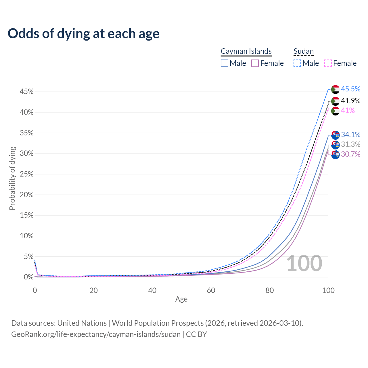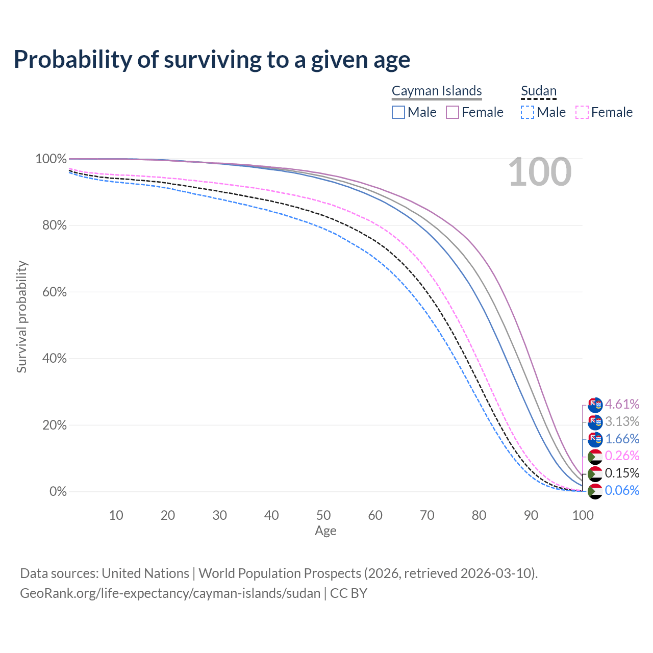 This life expectancy calculator shows the odds of living to 100, 95, 90, and below based on current age for both males and females in the Cayman Islands and Sudan, along with mean and median age of death. The calculations are based on the 2026 life tables (actuarial tables) from the UN World Population Prospects.