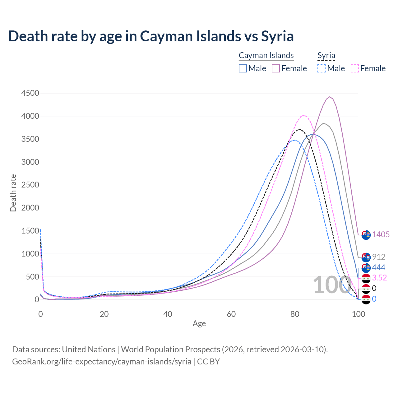 In the Cayman Islands, the most common age of death is 89, compared to 82 in Syria. The median age of death is 84.9 in the Cayman Islands and 77.7 in Syria, meaning only half of each cohort is expected to live past that age.