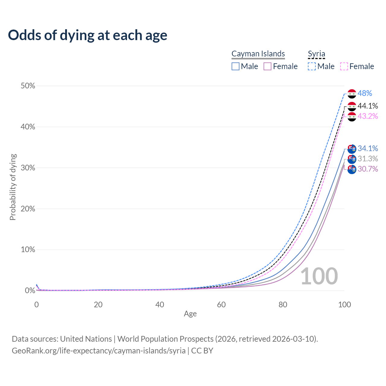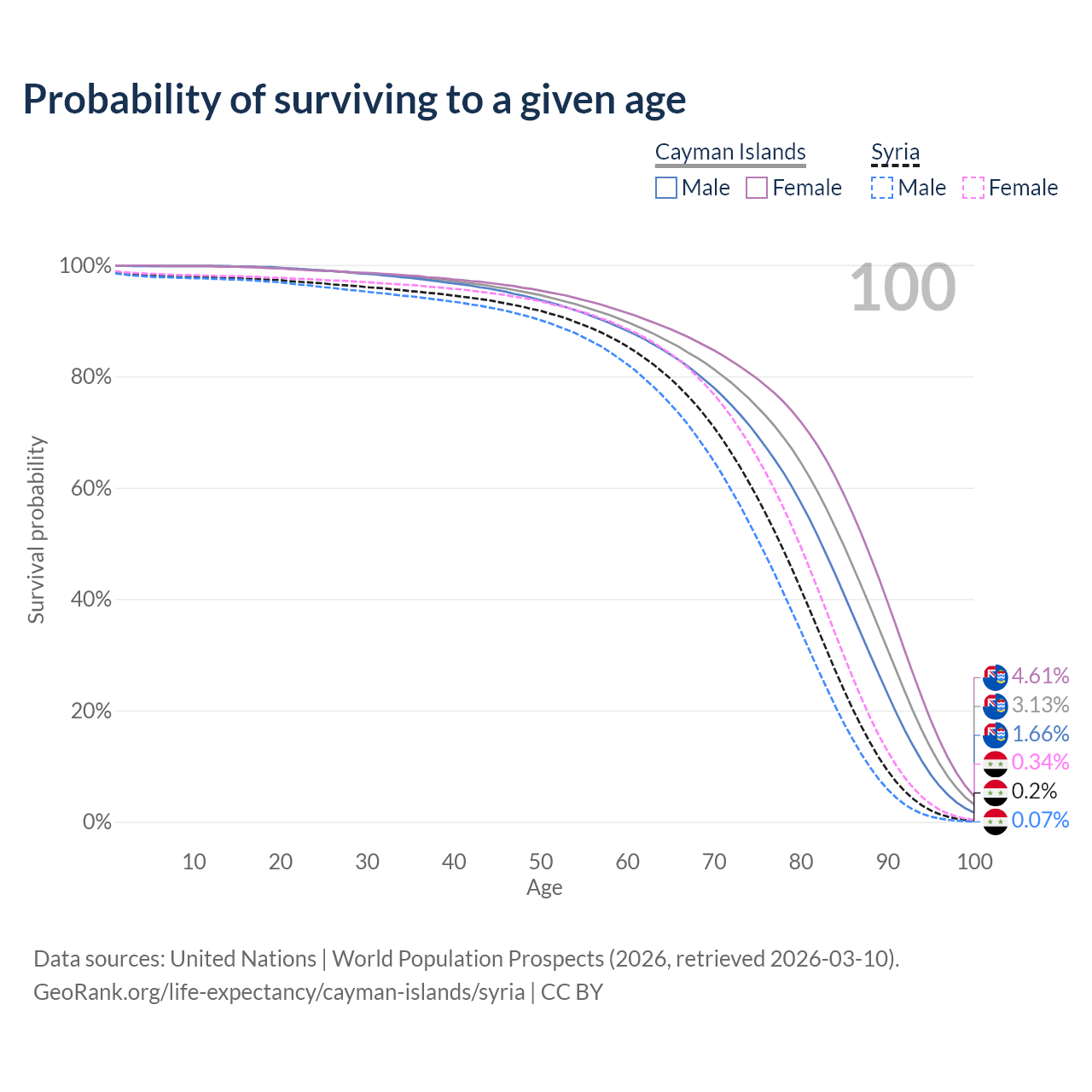 This life expectancy calculator shows the odds of living to 100, 95, 90, and below based on current age for both males and females in the Cayman Islands and Syria, along with mean and median age of death. The calculations are based on the 2026 life tables (actuarial tables) from the UN World Population Prospects.