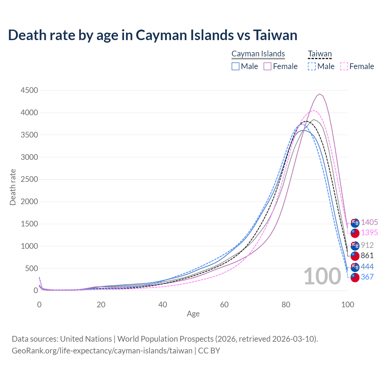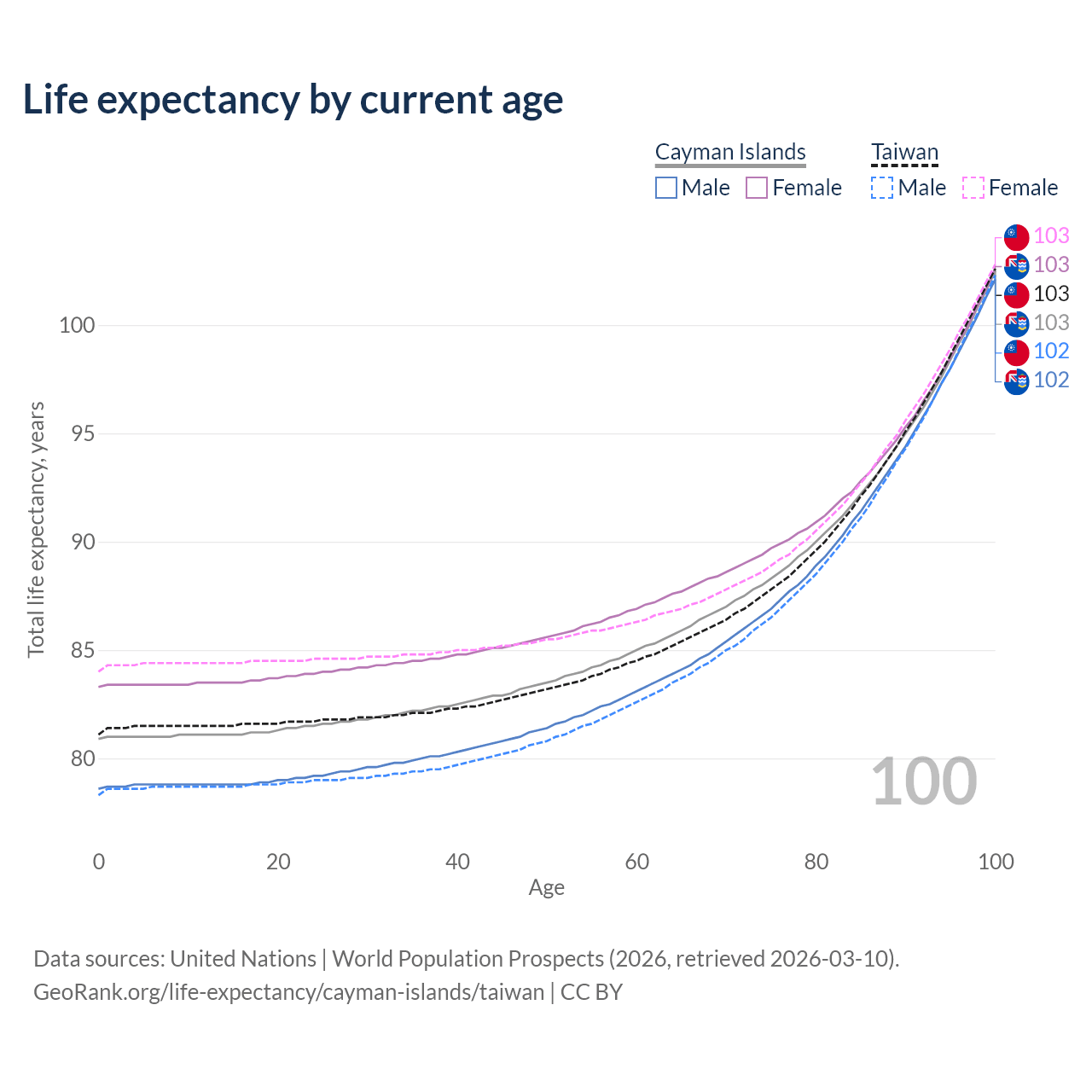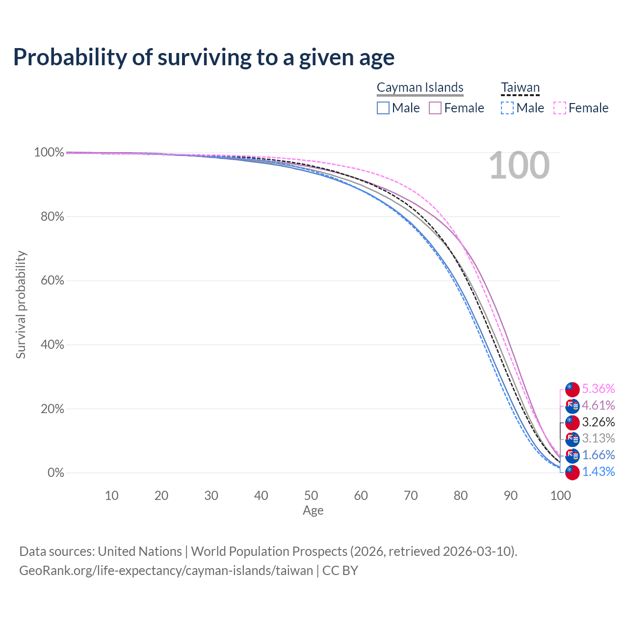 This life expectancy calculator shows the odds of living to 100, 95, 90, and below based on current age for both males and females in the Cayman Islands and Taiwan, along with mean and median age of death. The calculations are based on the 2026 life tables (actuarial tables) from the UN World Population Prospects.
