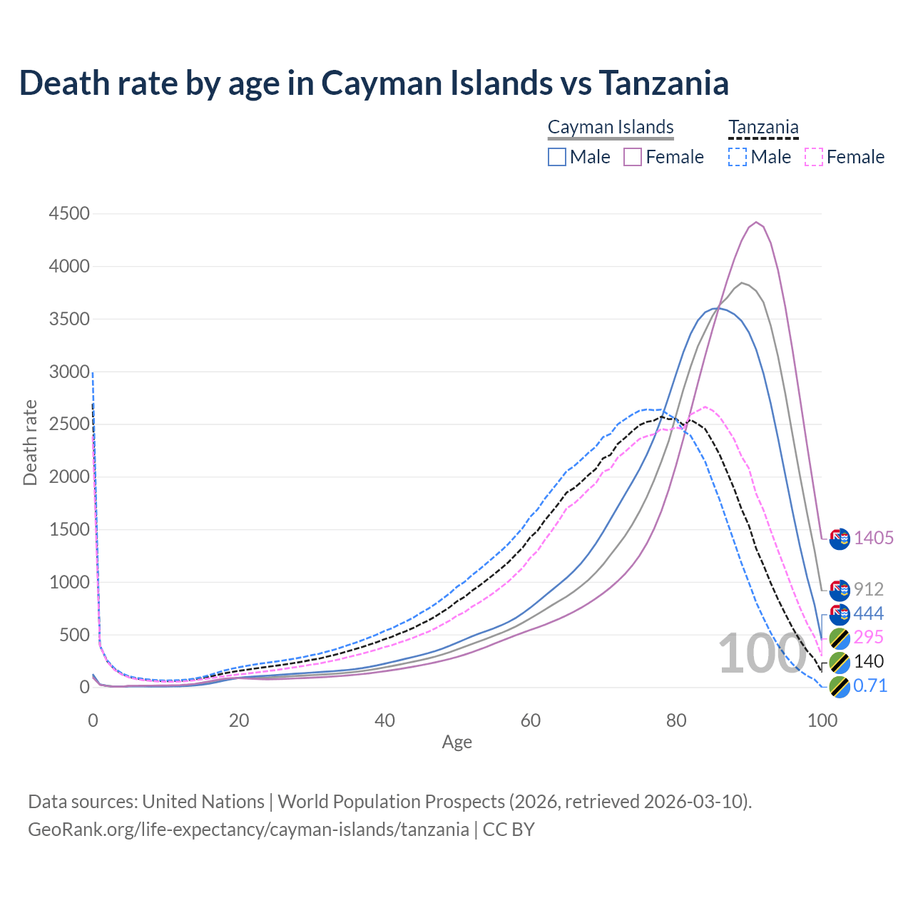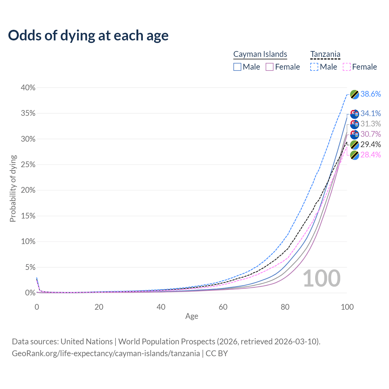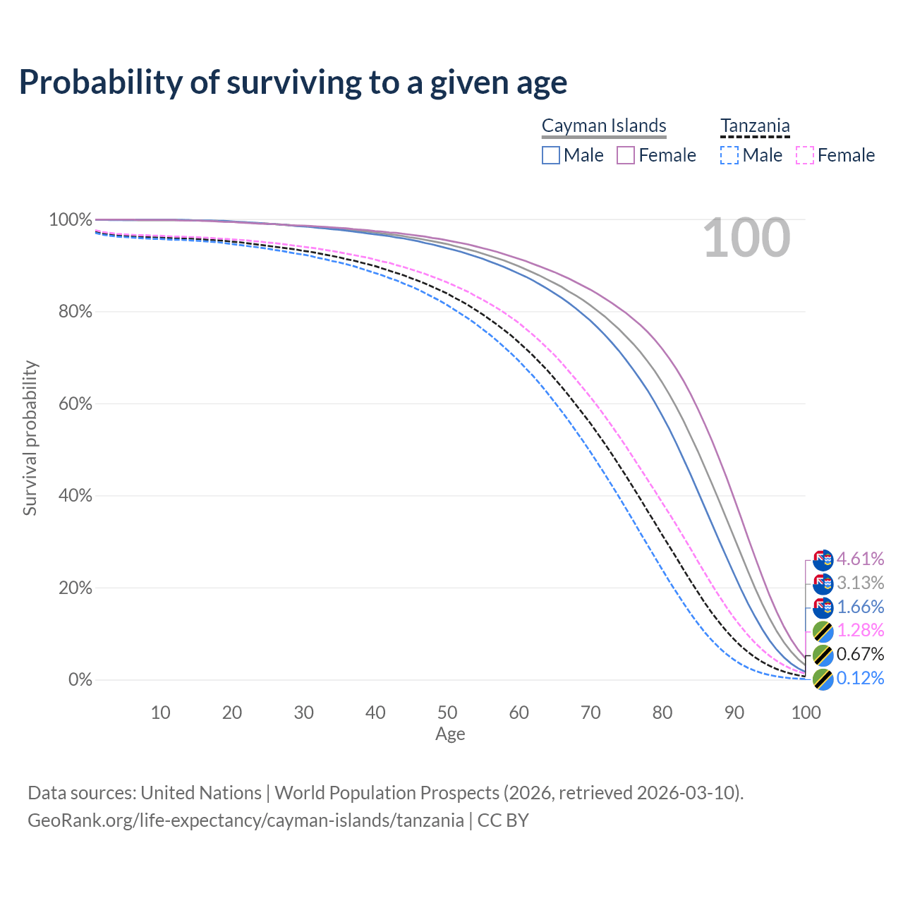 This life expectancy calculator shows the odds of living to 100, 95, 90, and below based on current age for both males and females in the Cayman Islands and Tanzania, along with mean and median age of death. The calculations are based on the 2026 life tables (actuarial tables) from the UN World Population Prospects.